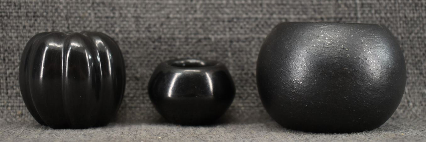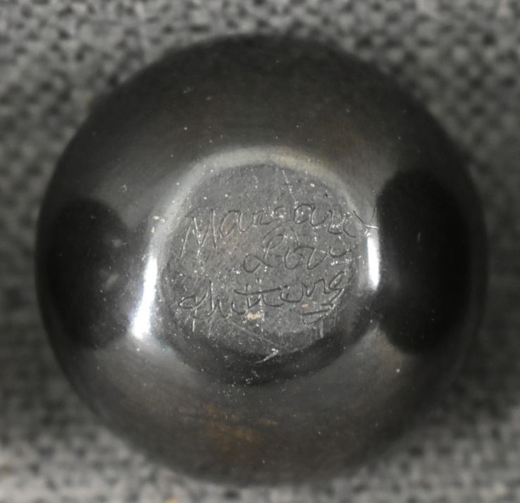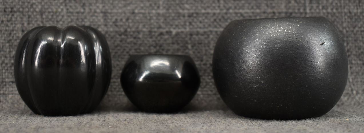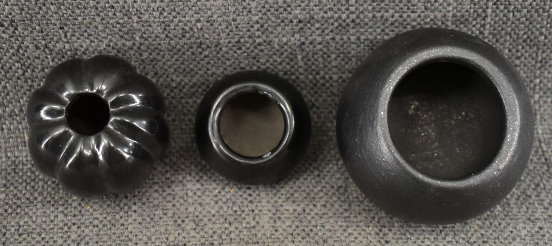 1988 Santa Clara hand coiled melon pot design by Lorenzo Fuentes 1.75" x 1.75". 2000's San Ildefonso hand coiled micaceous clay signed Jade Martinez 1.75" x 2.25". 1980-90's Santa Clara hand coiled with polished design signed 1" x 1.5"