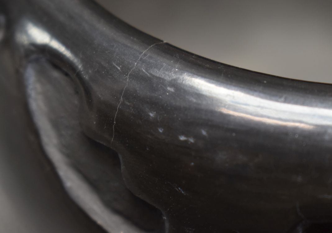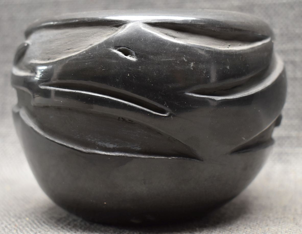 1970's Santa Clara Indian. Hand coiled and carved Avanyu design pottery bowl. Signed Francis Naranjo. 4'' x 5.5''