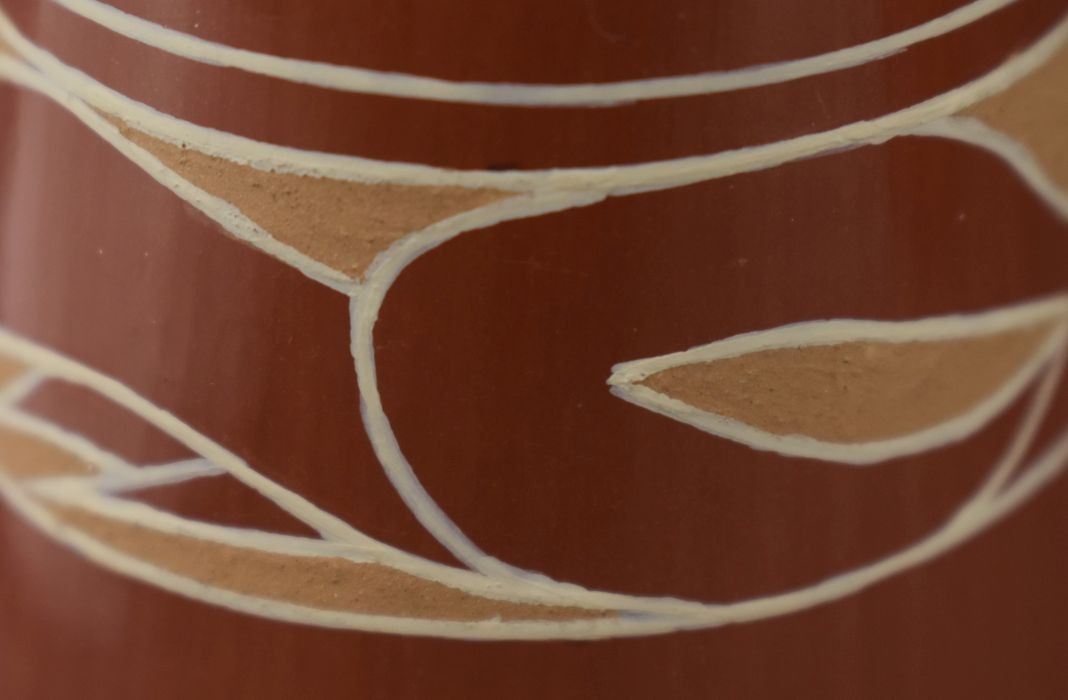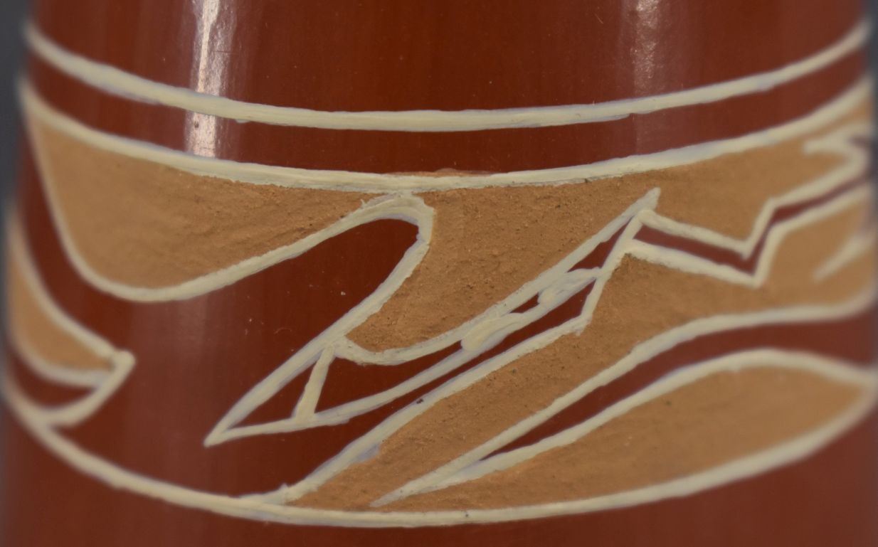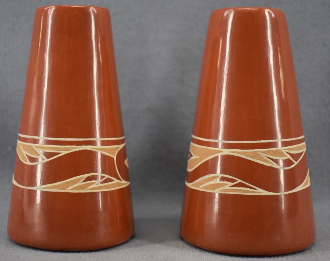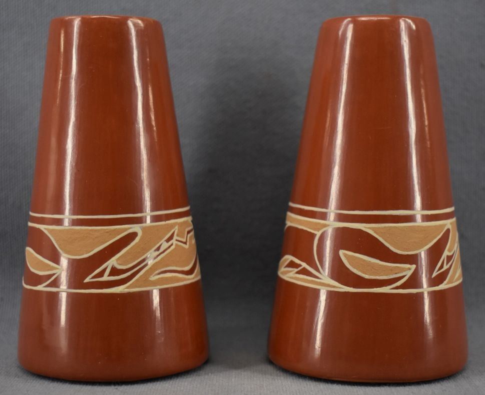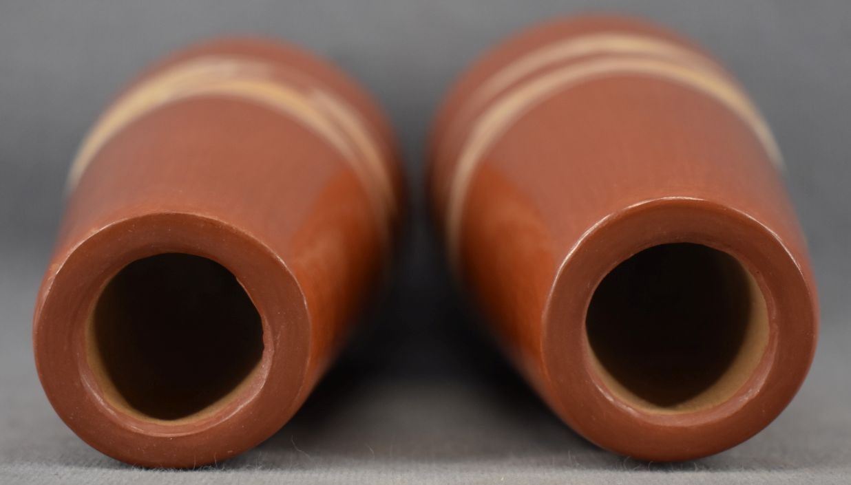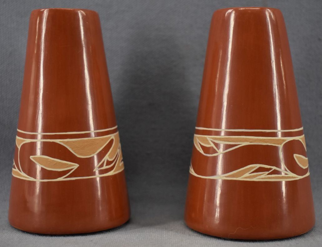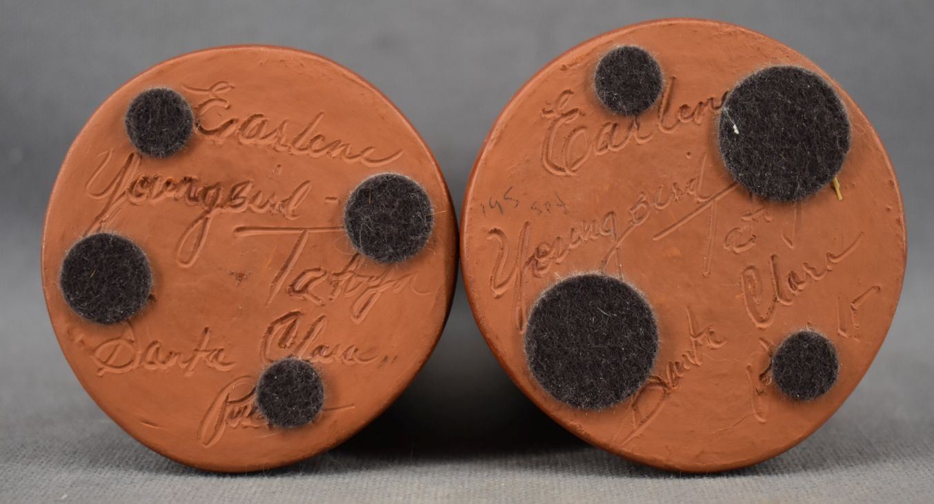 1990's Santa Clara Indian. Hand coiled and painted Avanyu design pottery candle stick holders. Signed Earlene Youngblood Tafoya. 4.5'' x 2.5''