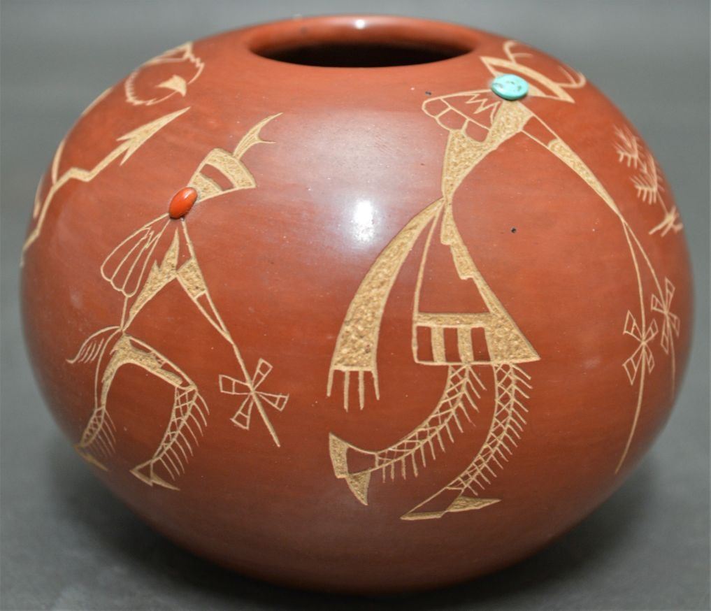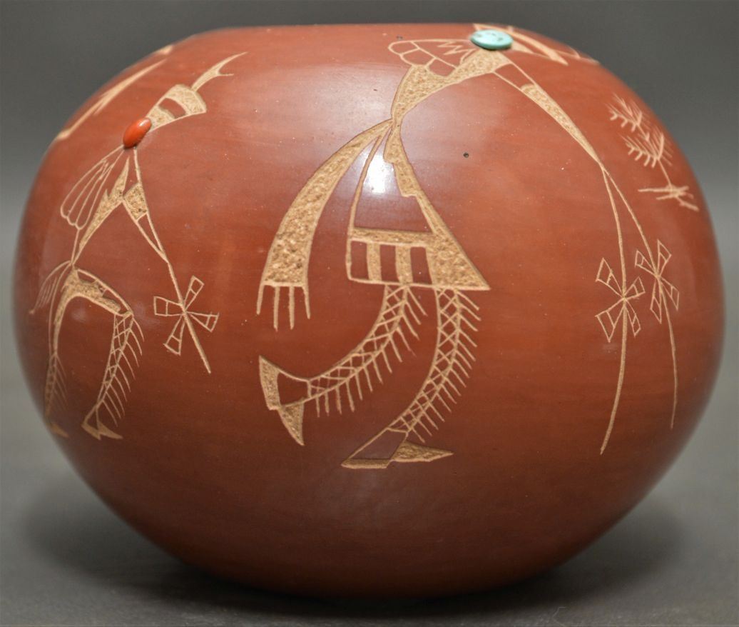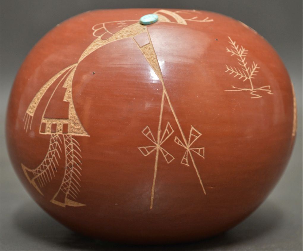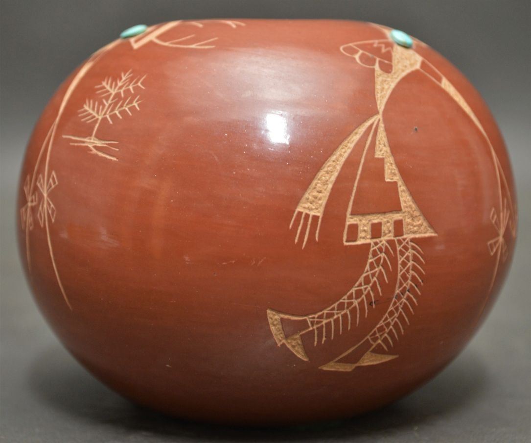 1980's Santa Clara Indian. Hand coiled and sgriffito design depicting deer dancers, signed Golden Rod. 3'' x 4''