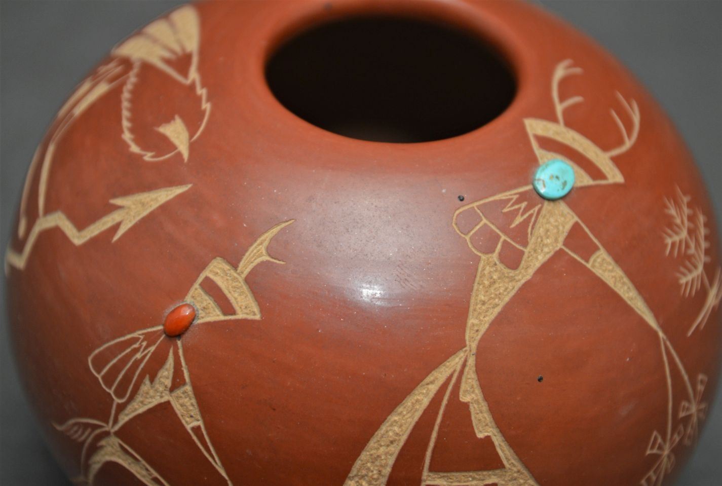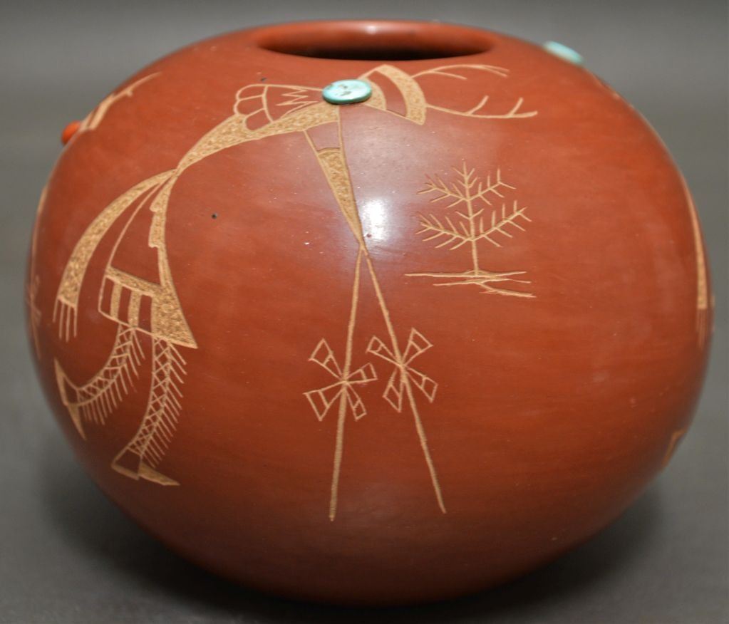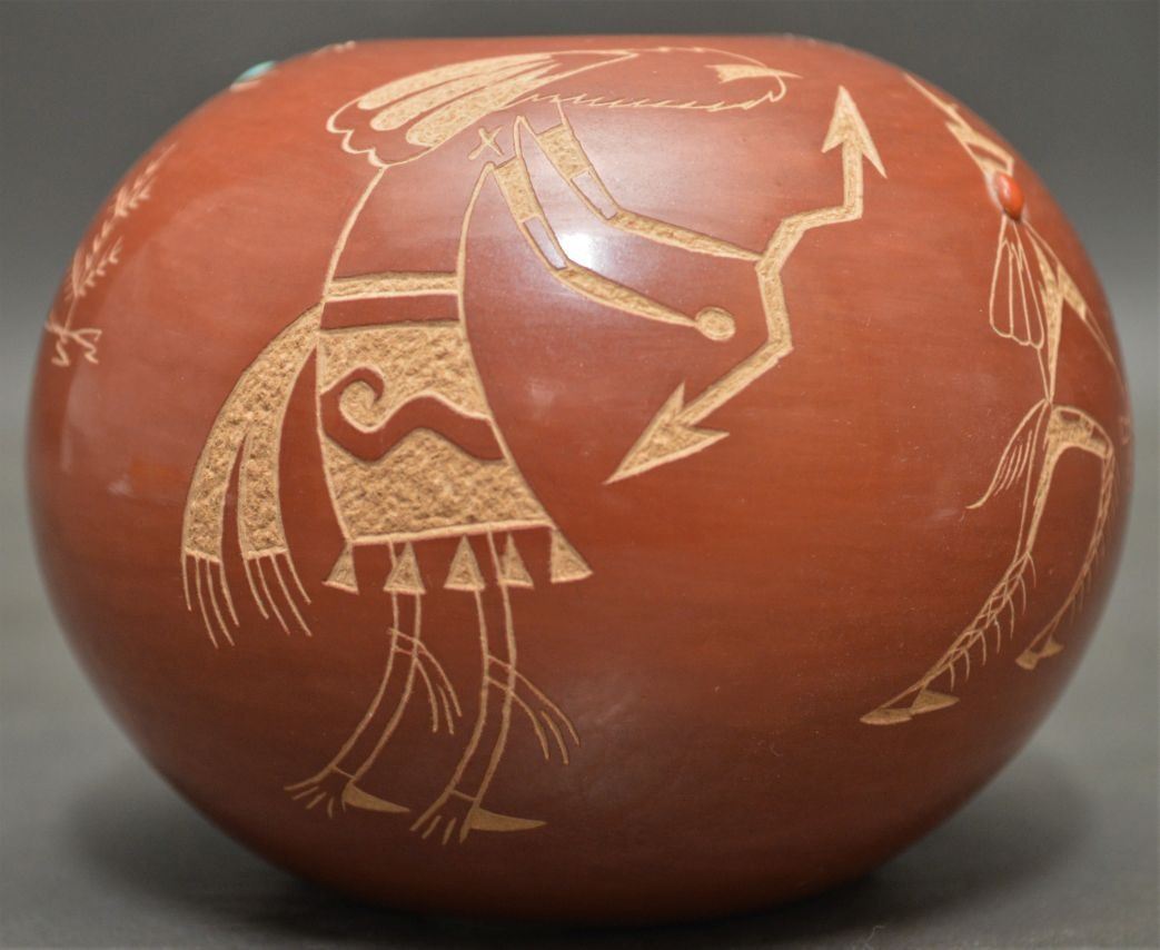 1980's Santa Clara Indian. Hand coiled and sgriffito design depicting deer dancers, signed Golden Rod. 3'' x 4''