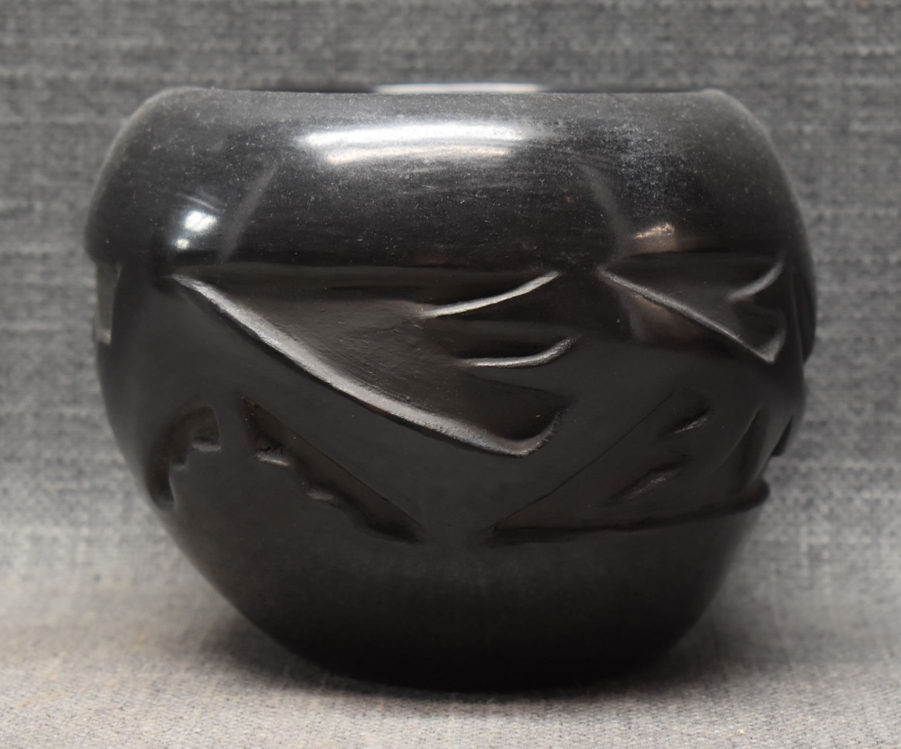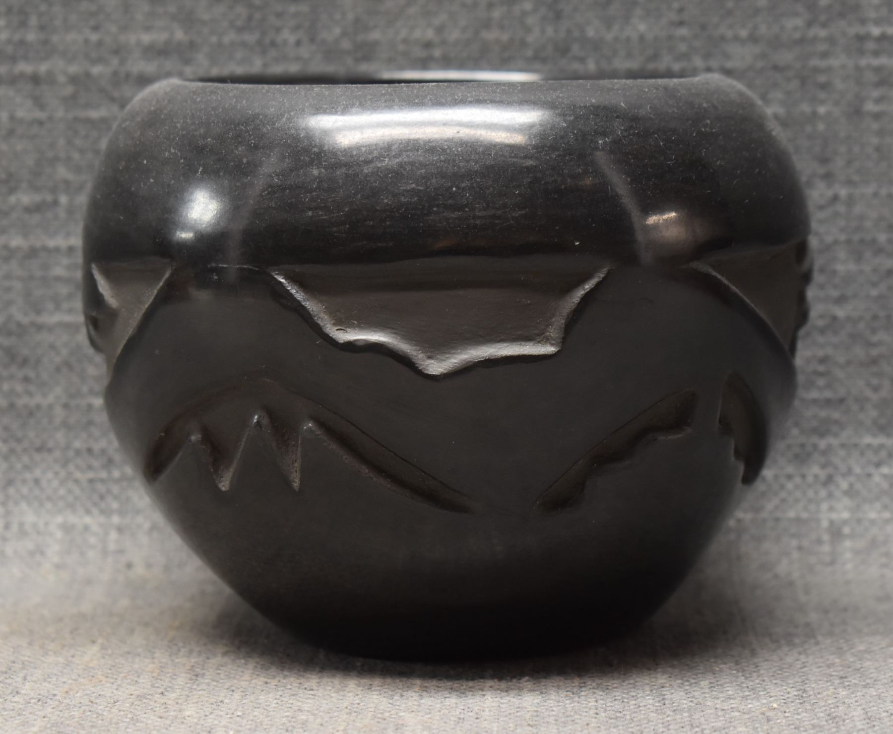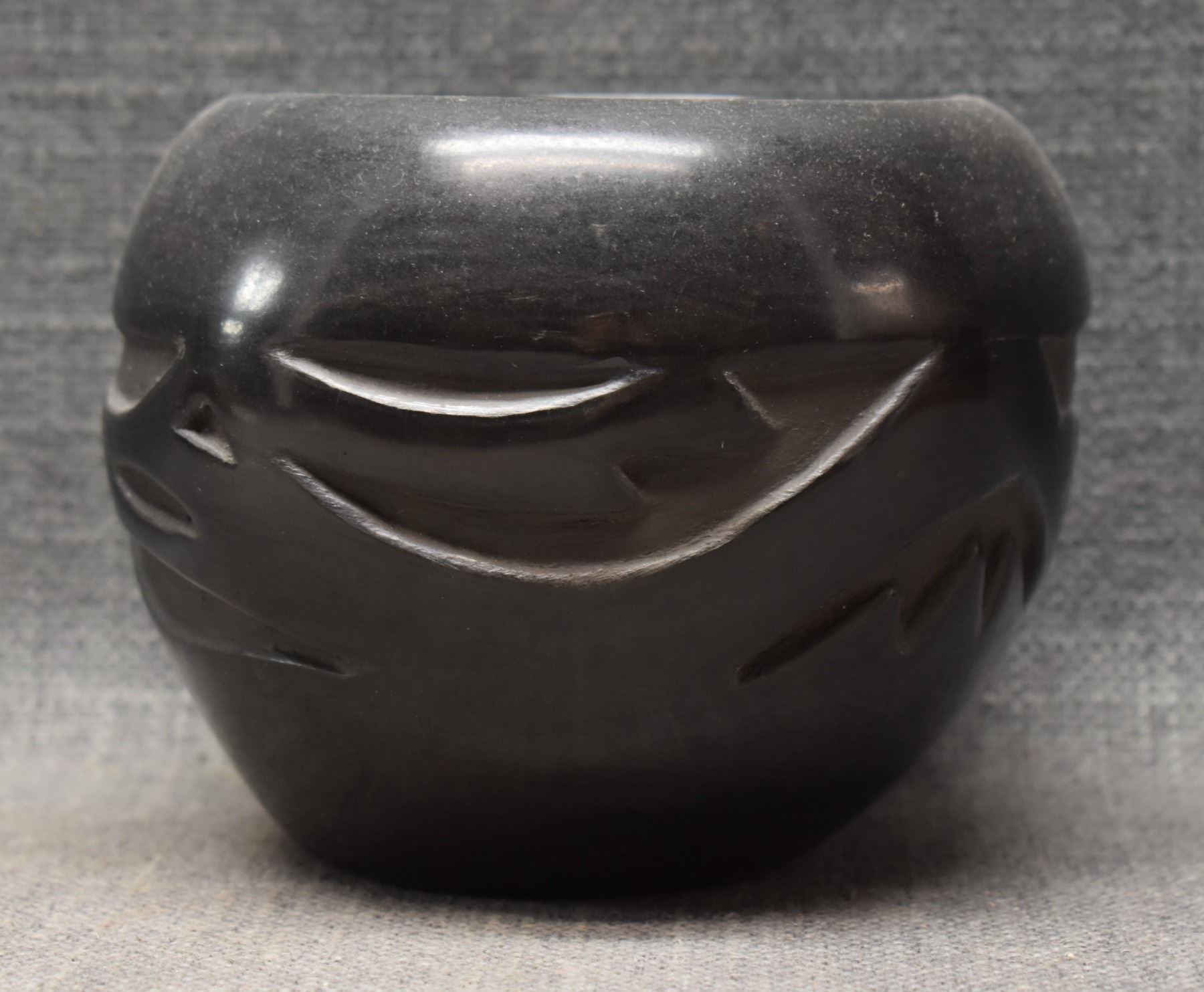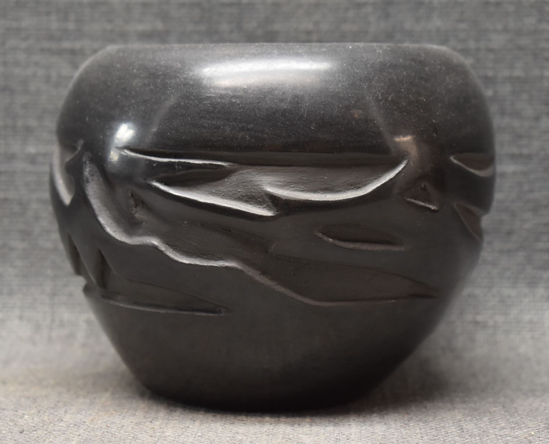1980's Santa Clara Indian. Hand coiled and carved Avanyu design pottery vase, signed Francis Naranjo Salazar. 4.5'' x 6''