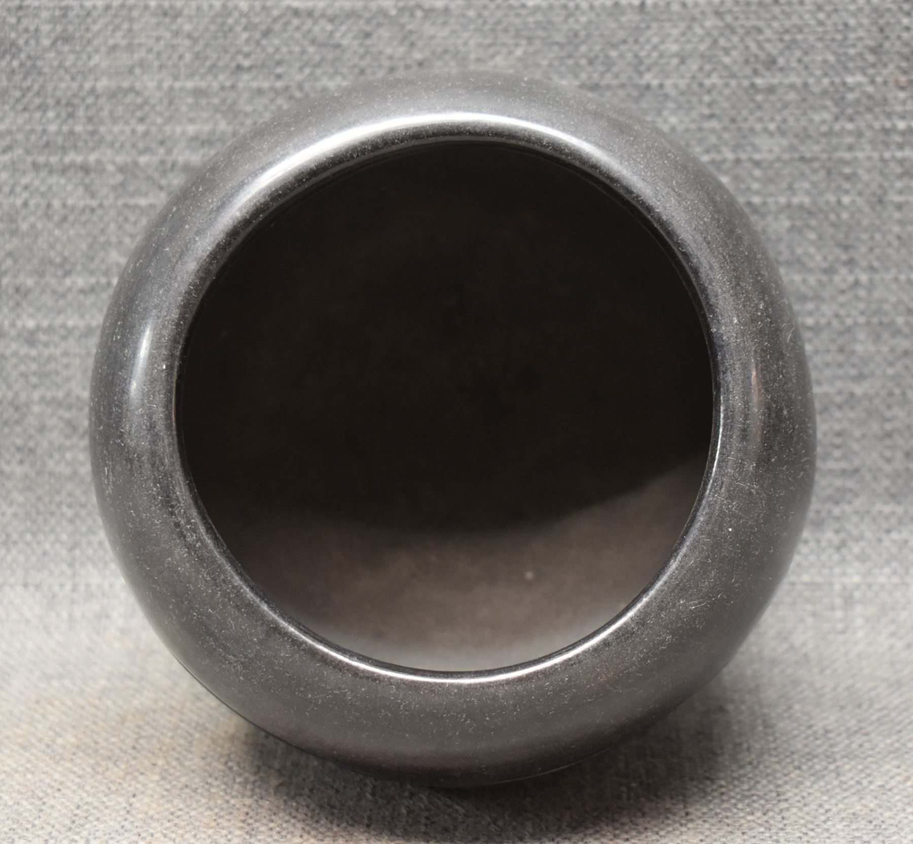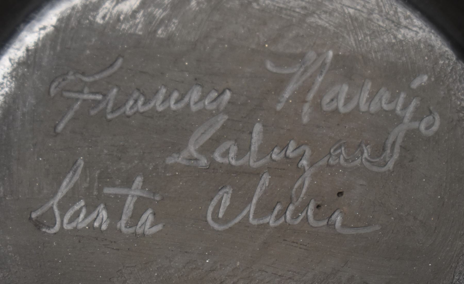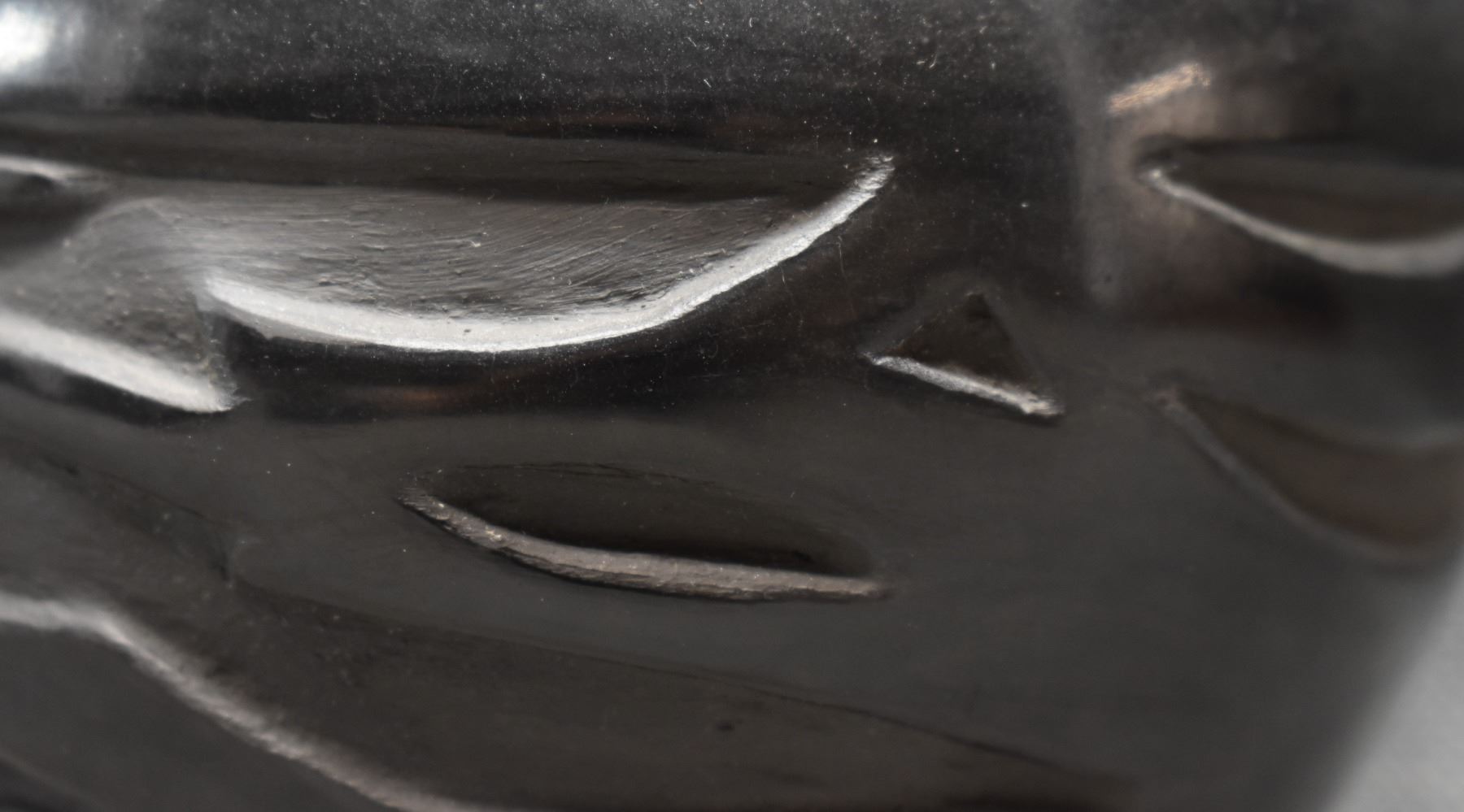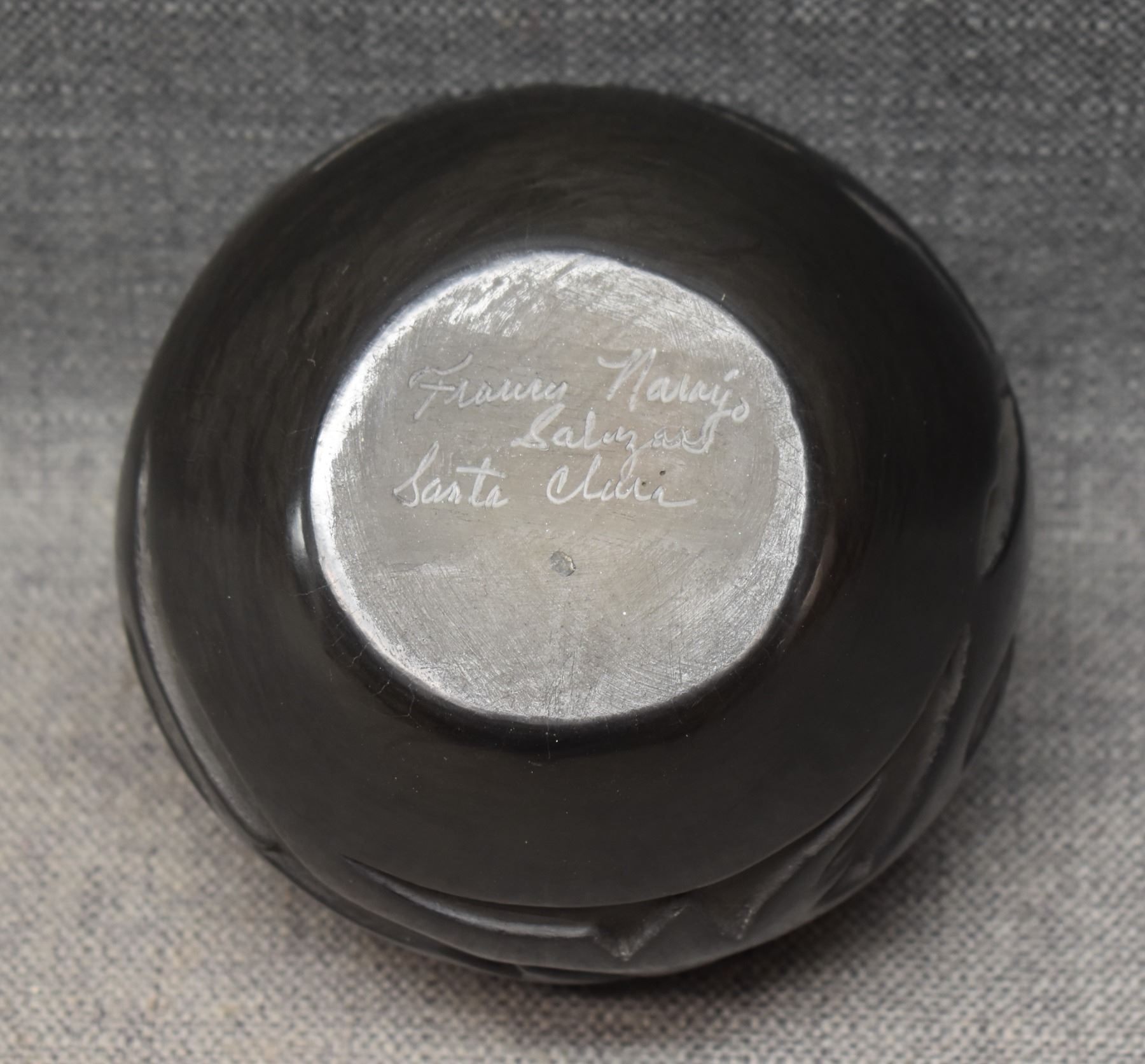 1980's Santa Clara Indian. Hand coiled and carved Avanyu design pottery vase, signed Francis Naranjo Salazar. 4.5'' x 6''