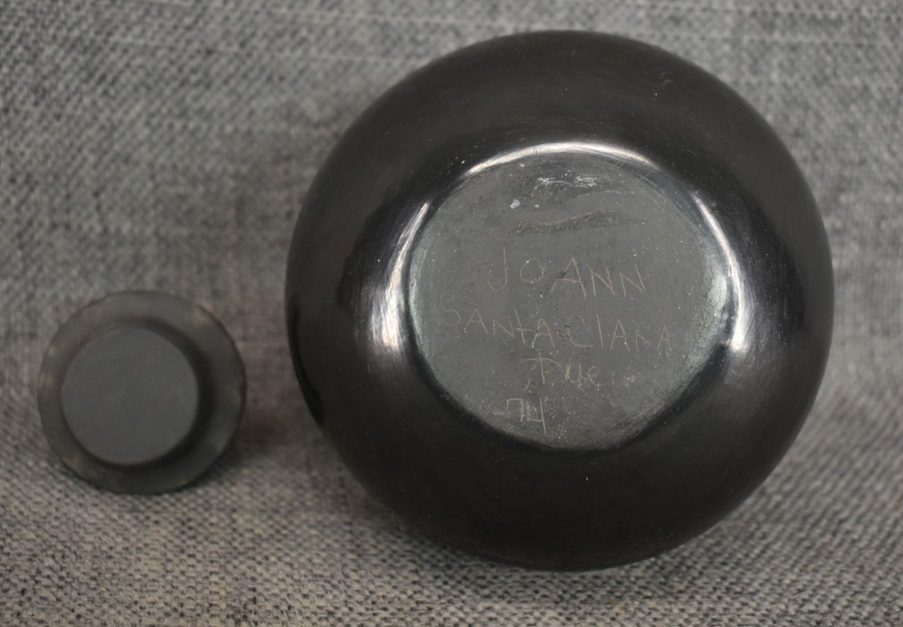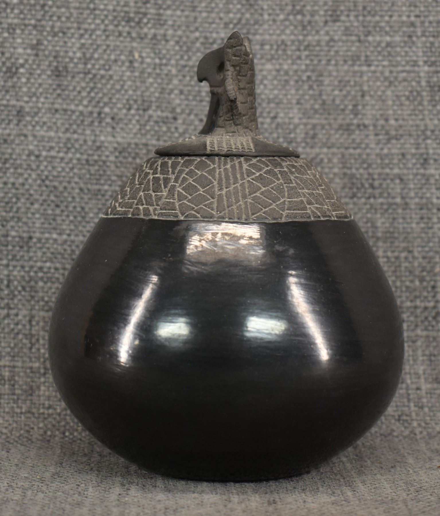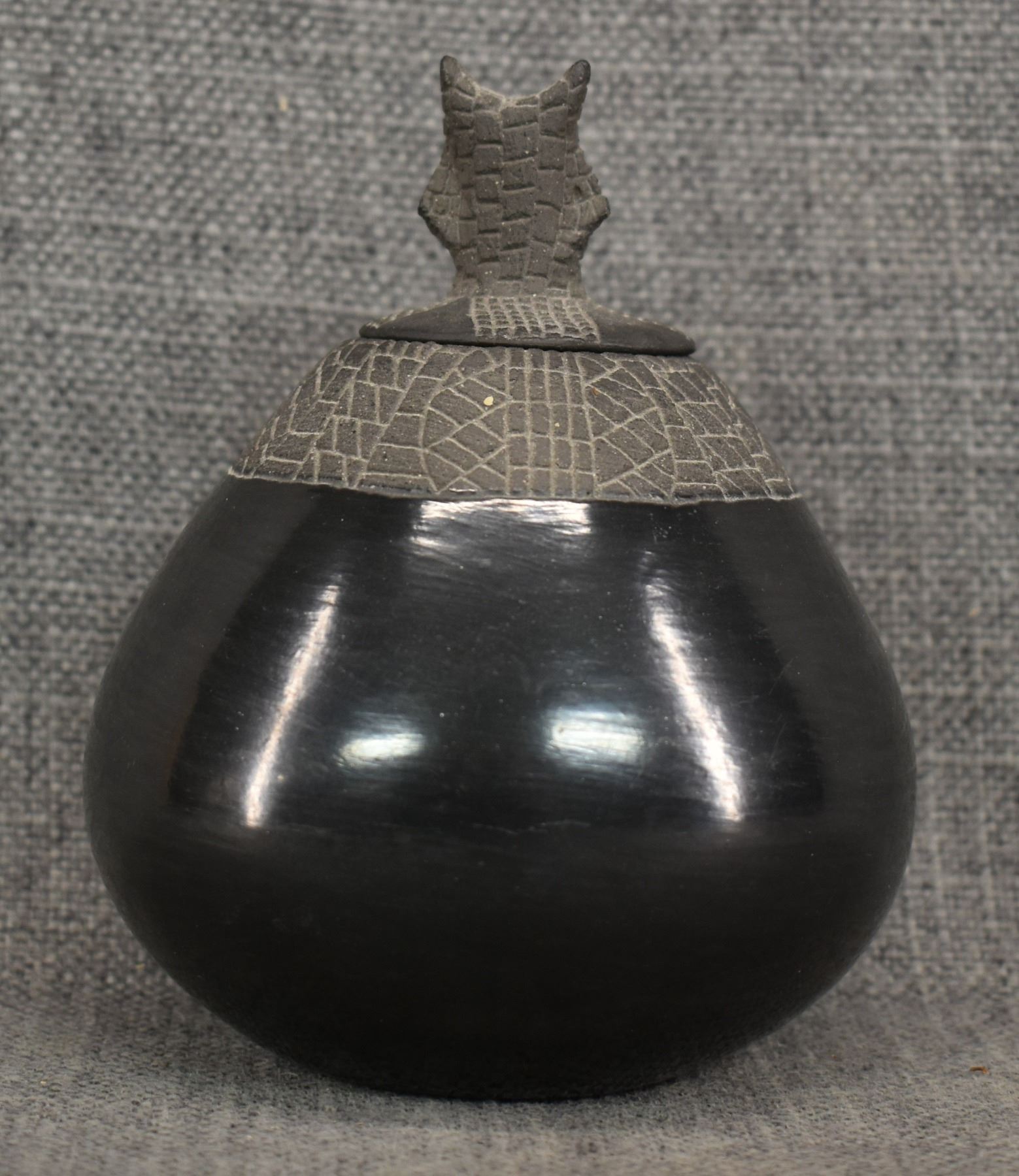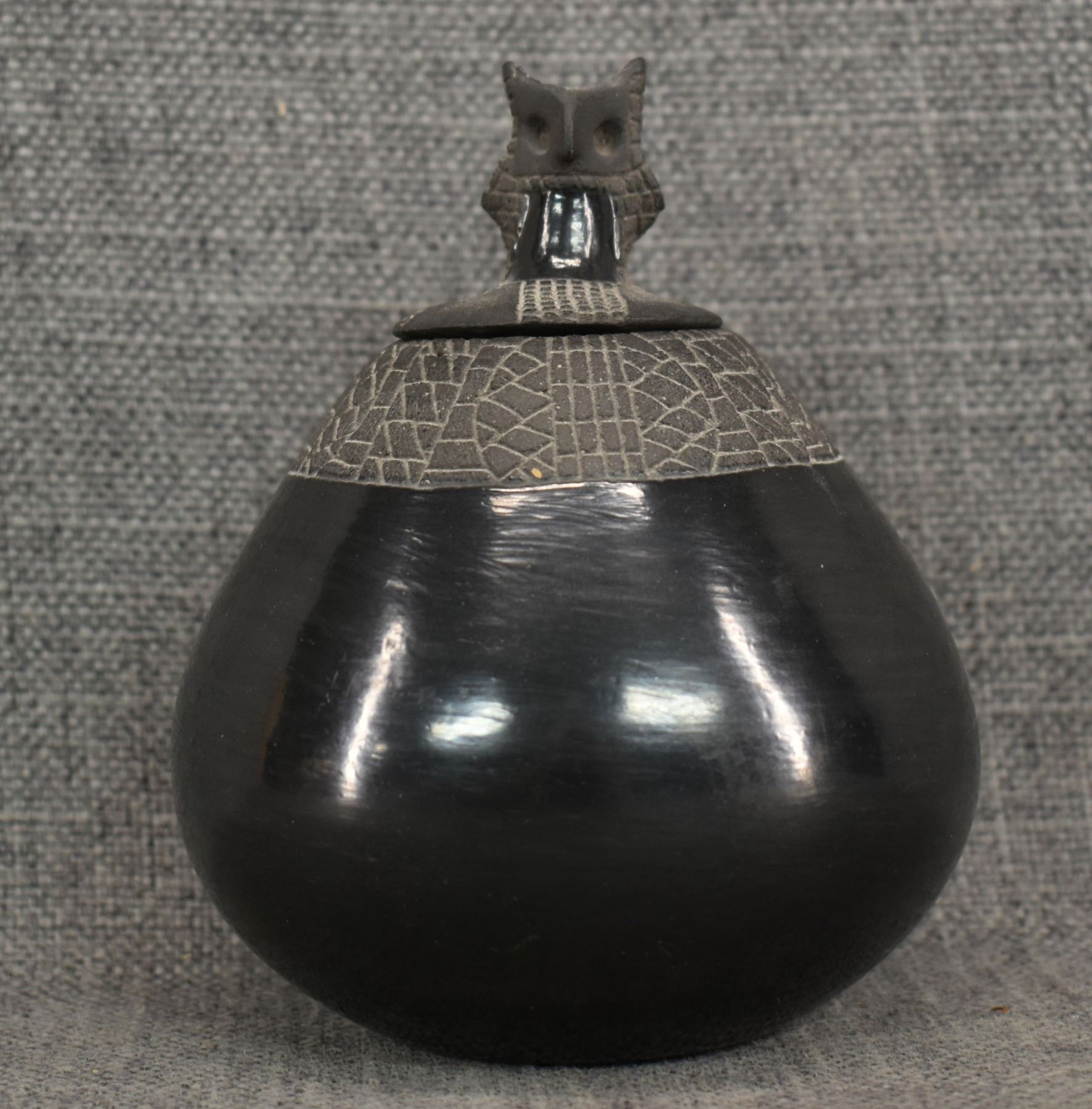 1974 Santa Clara, hand coiled with carved design and owl effigy lid signed JoAnn for JoAnn Million 5" x 4"
