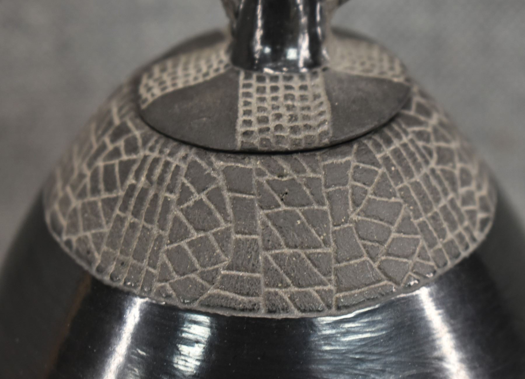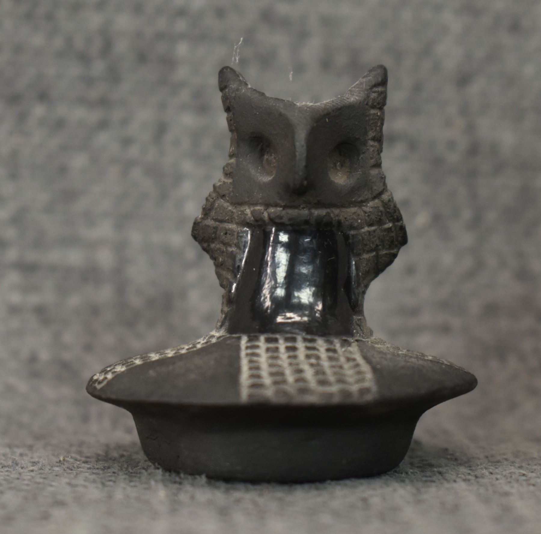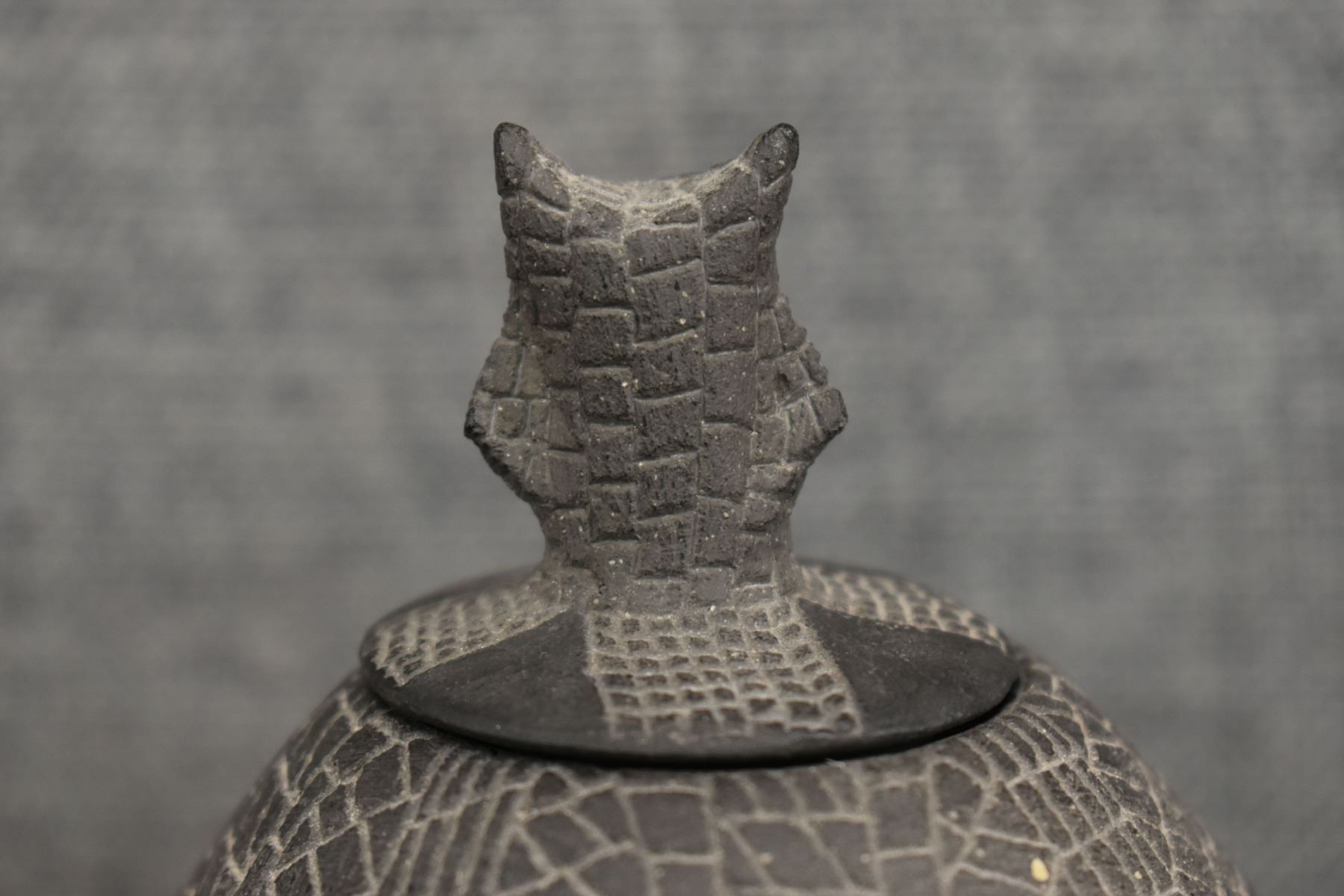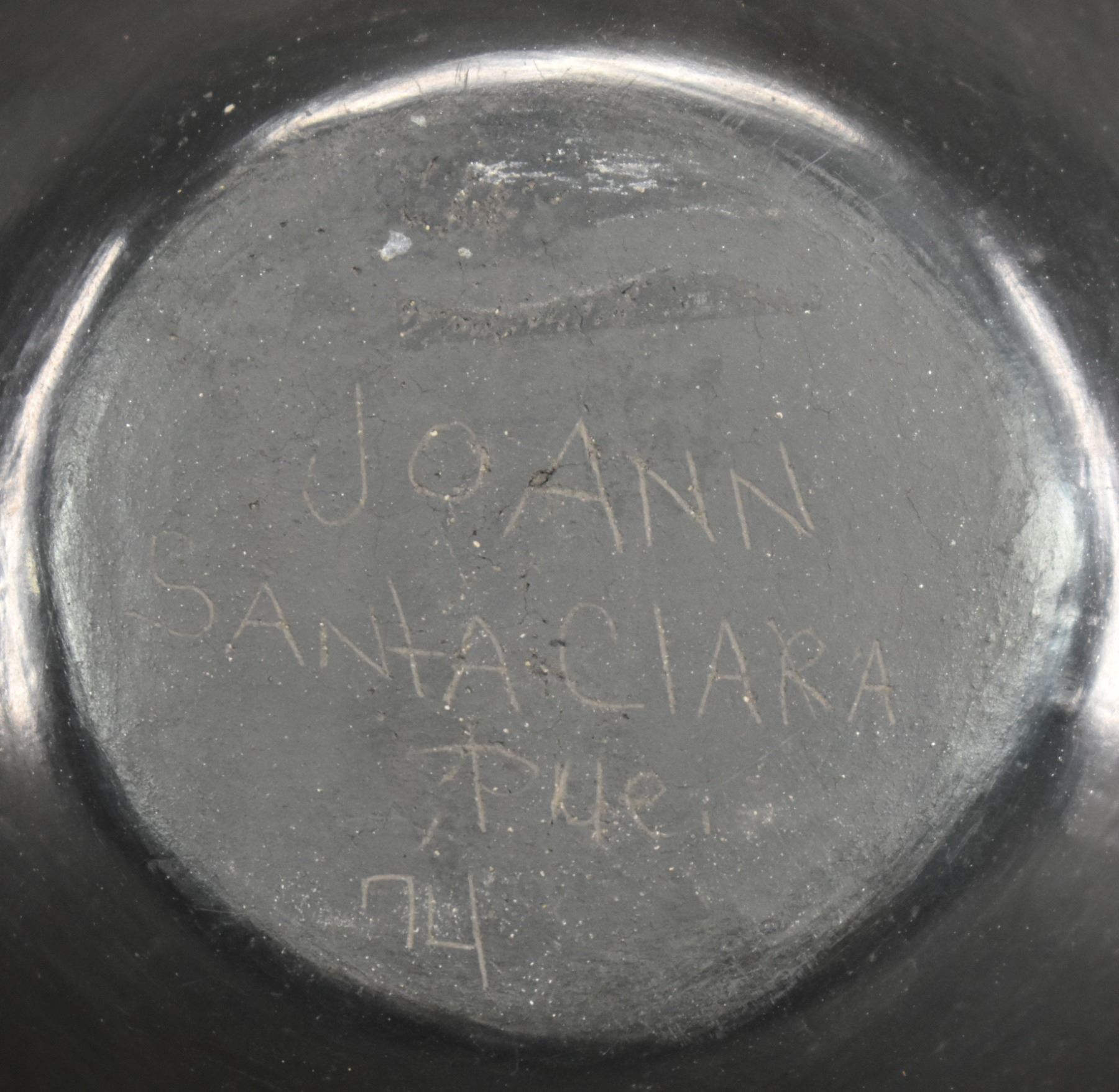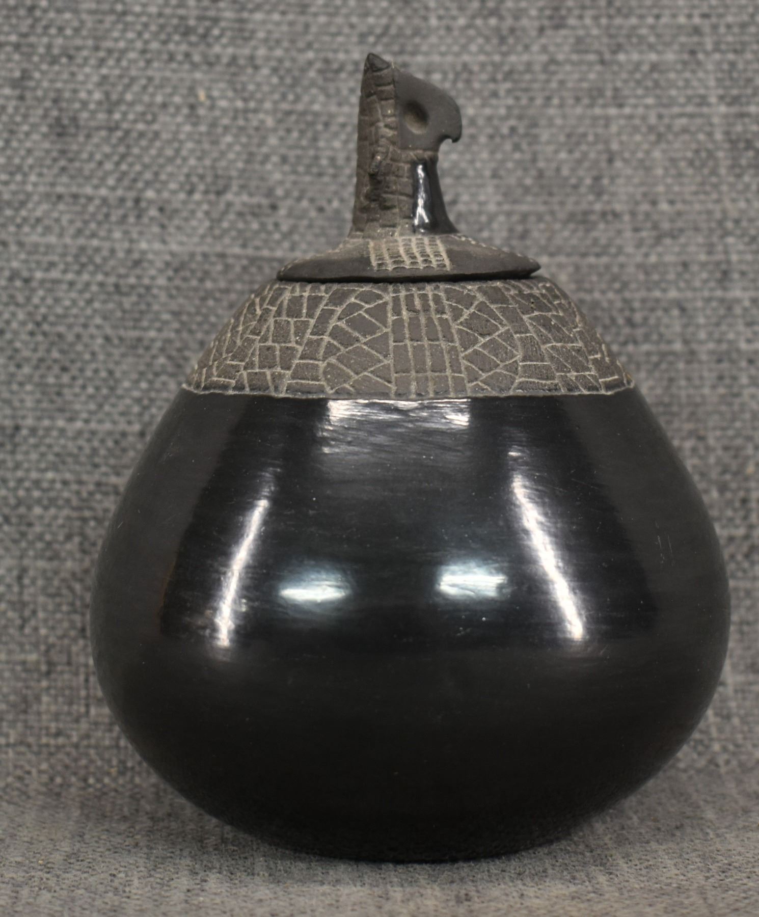1974 Santa Clara, hand coiled with carved design and owl effigy lid signed JoAnn for JoAnn Million 5" x 4"