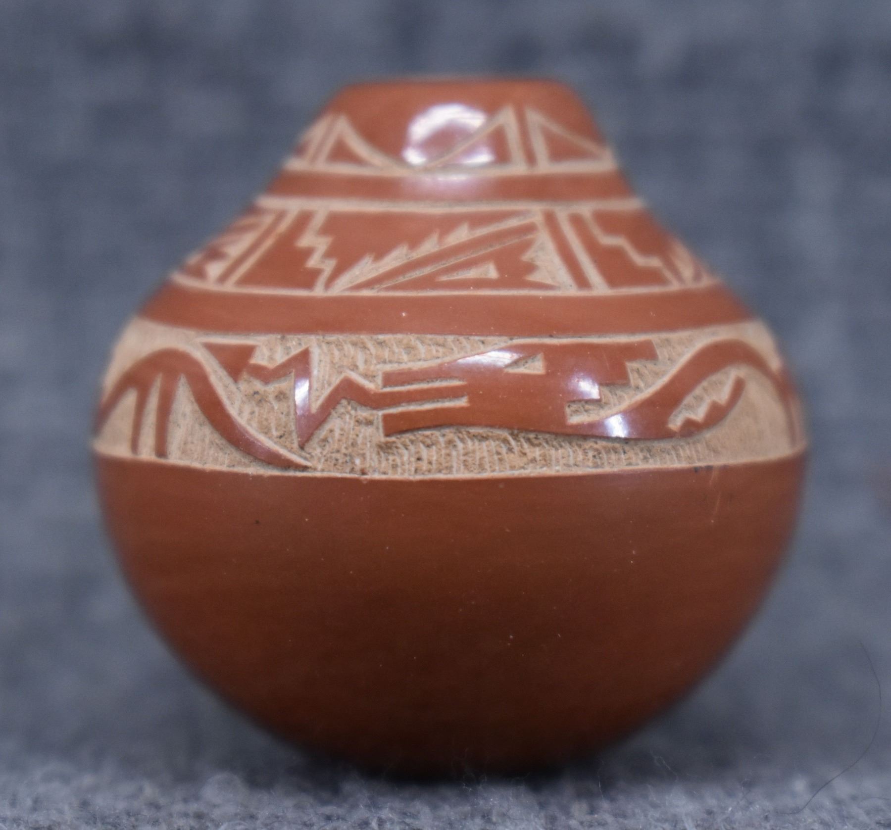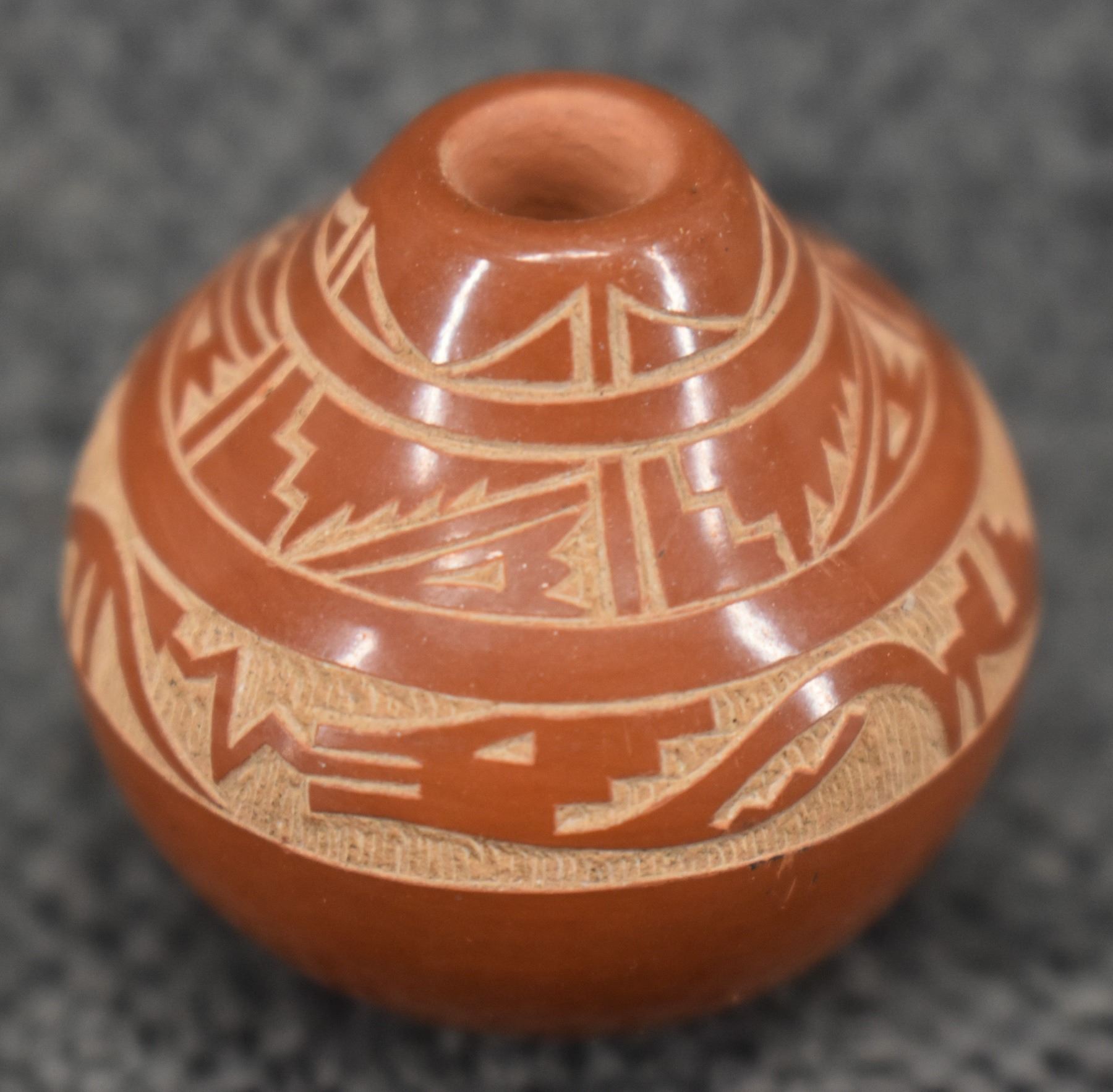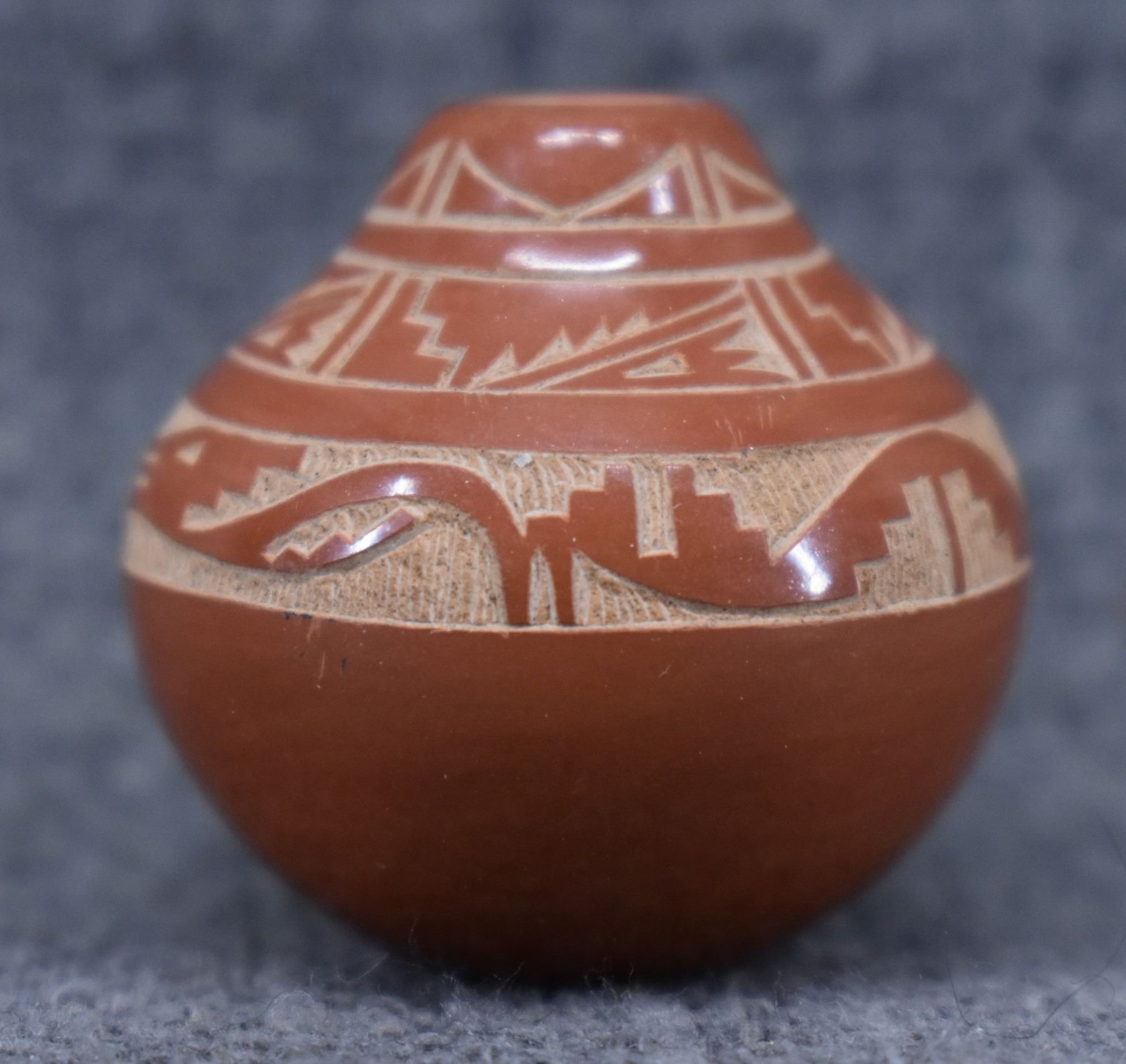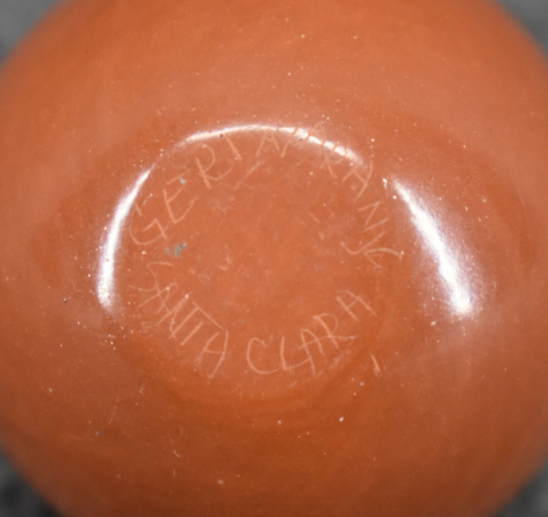 1980-90's Santa Clara, hand coiled with sgraffito avanyu and geometric design by Geri Naranjo, 1.25" x 1".