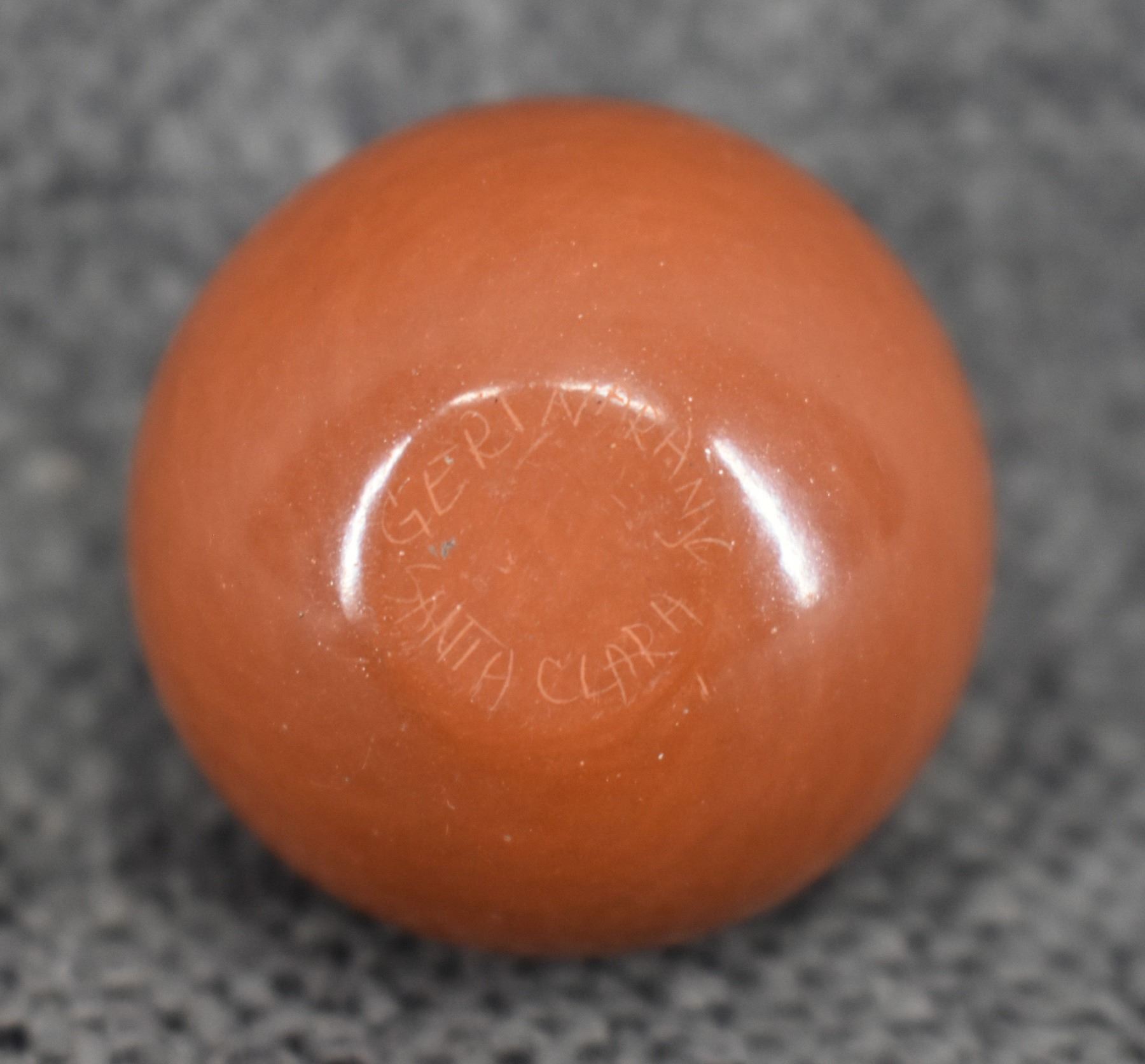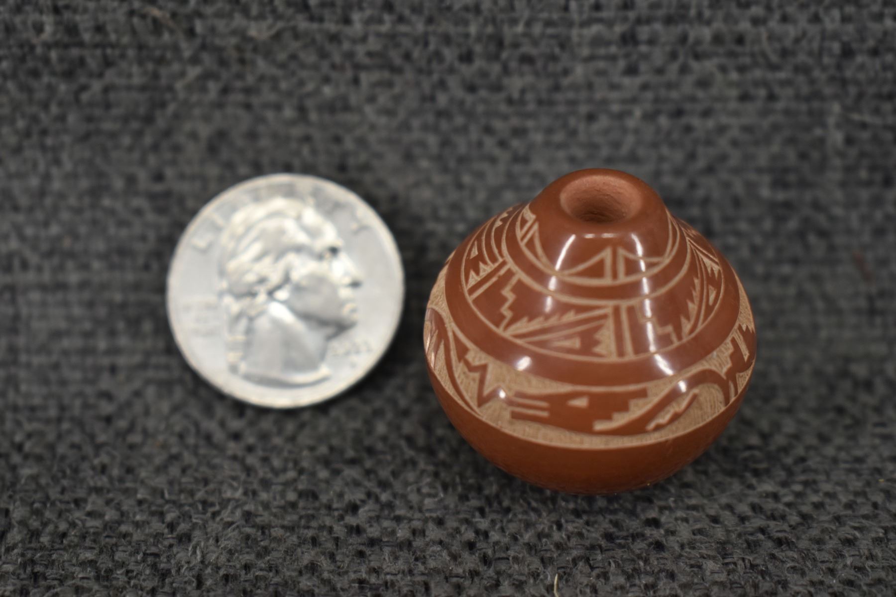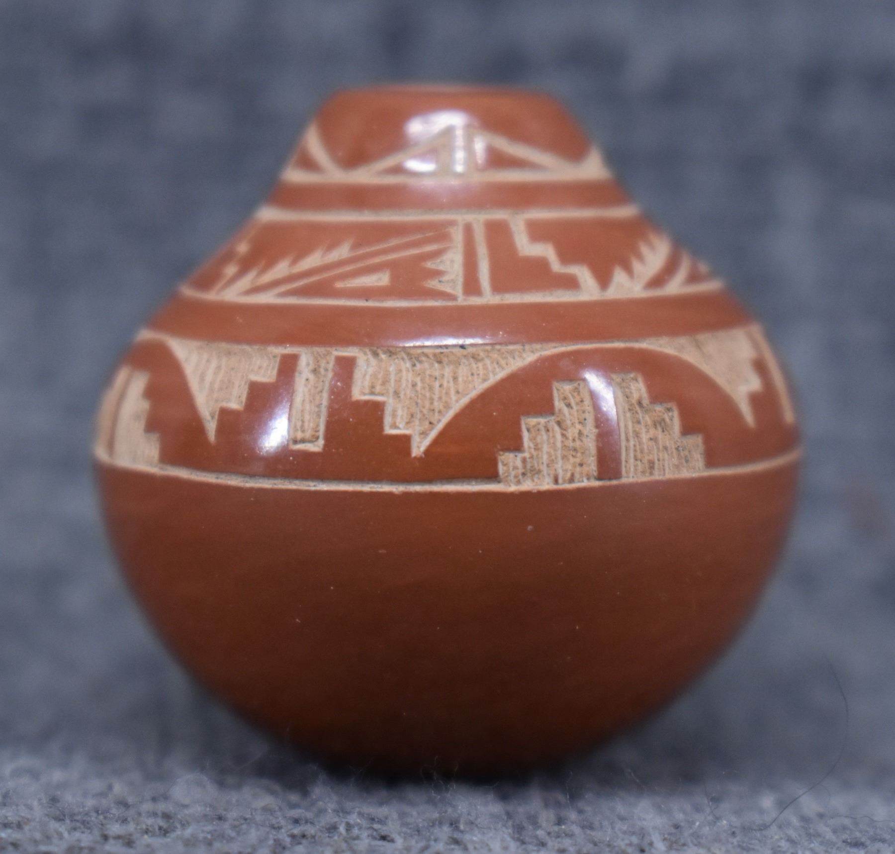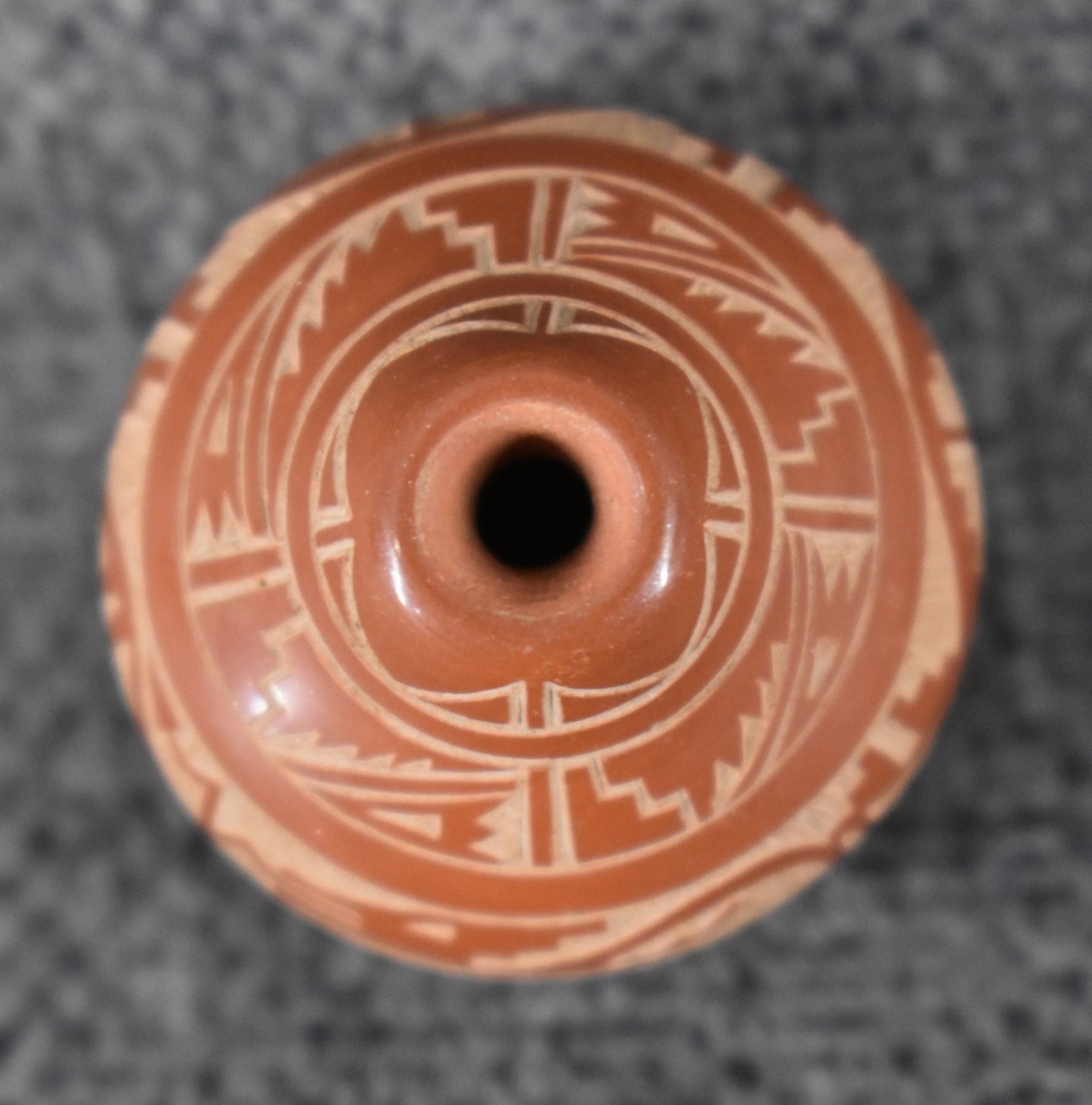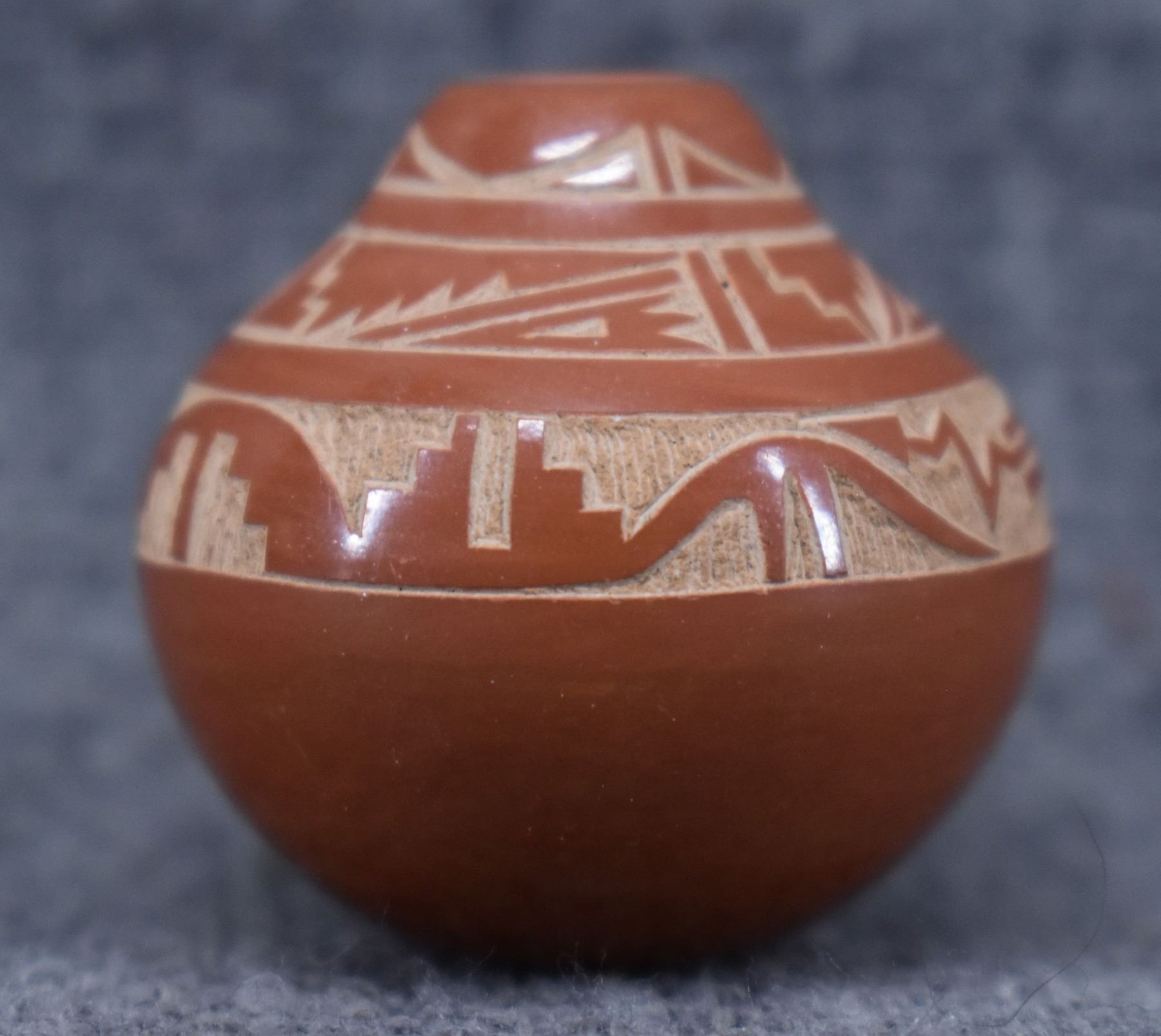 1980-90's Santa Clara, hand coiled with sgraffito avanyu and geometric design by Geri Naranjo, 1.25" x 1".