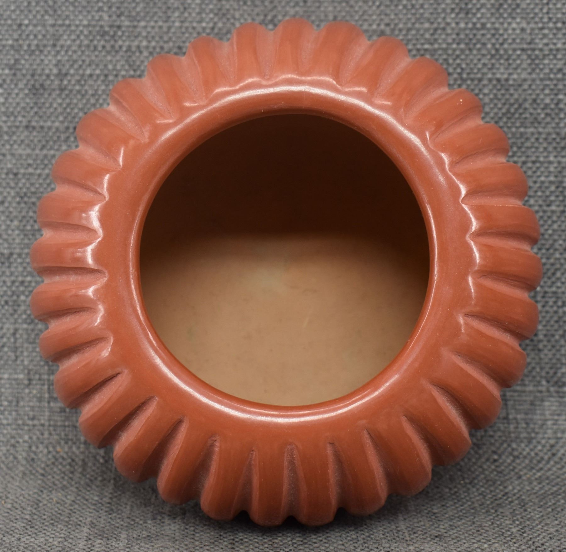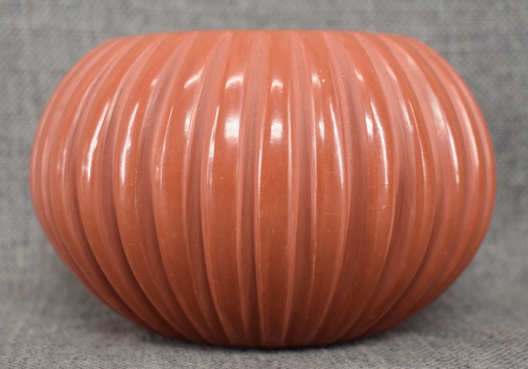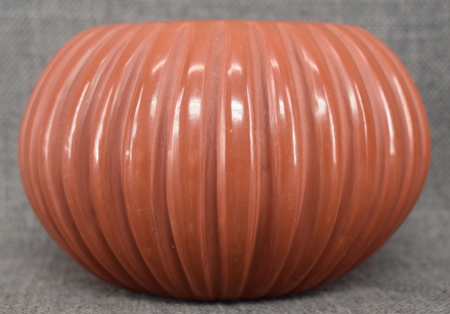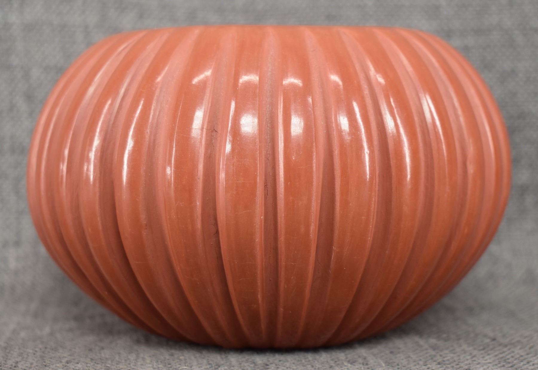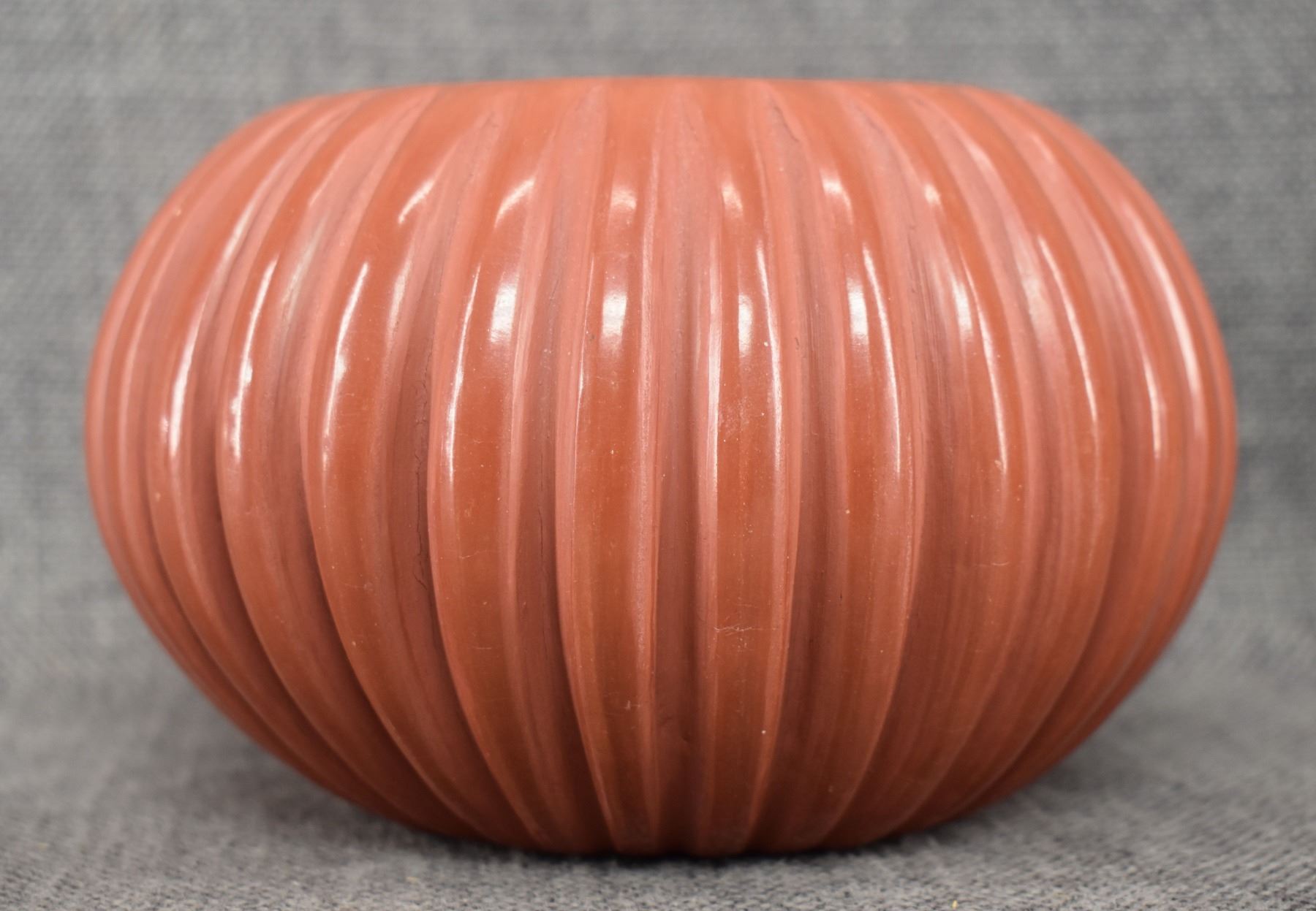 1980's Santa Clara. Hand coiled melon design pottery bowl signed Angela Baca. 4'' x 6.5''
