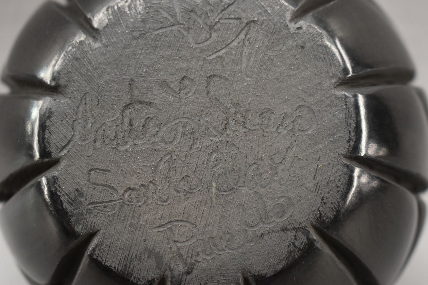 1970-80's Santa Clara, hand coiled with carved geometric polished and matt design signed Anita L Suazo 2.25" x 3.5"