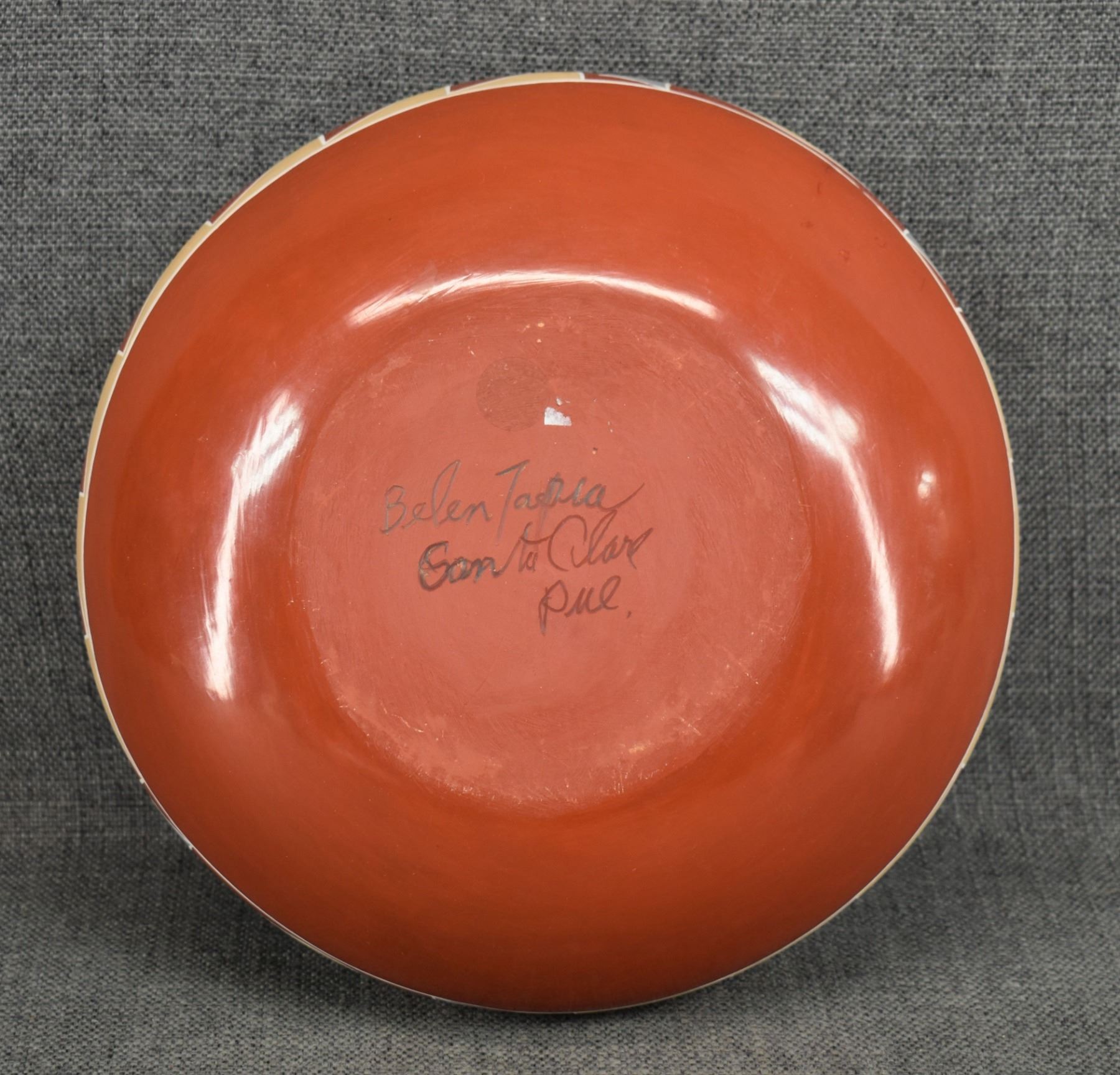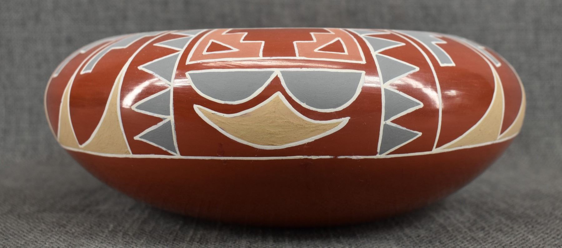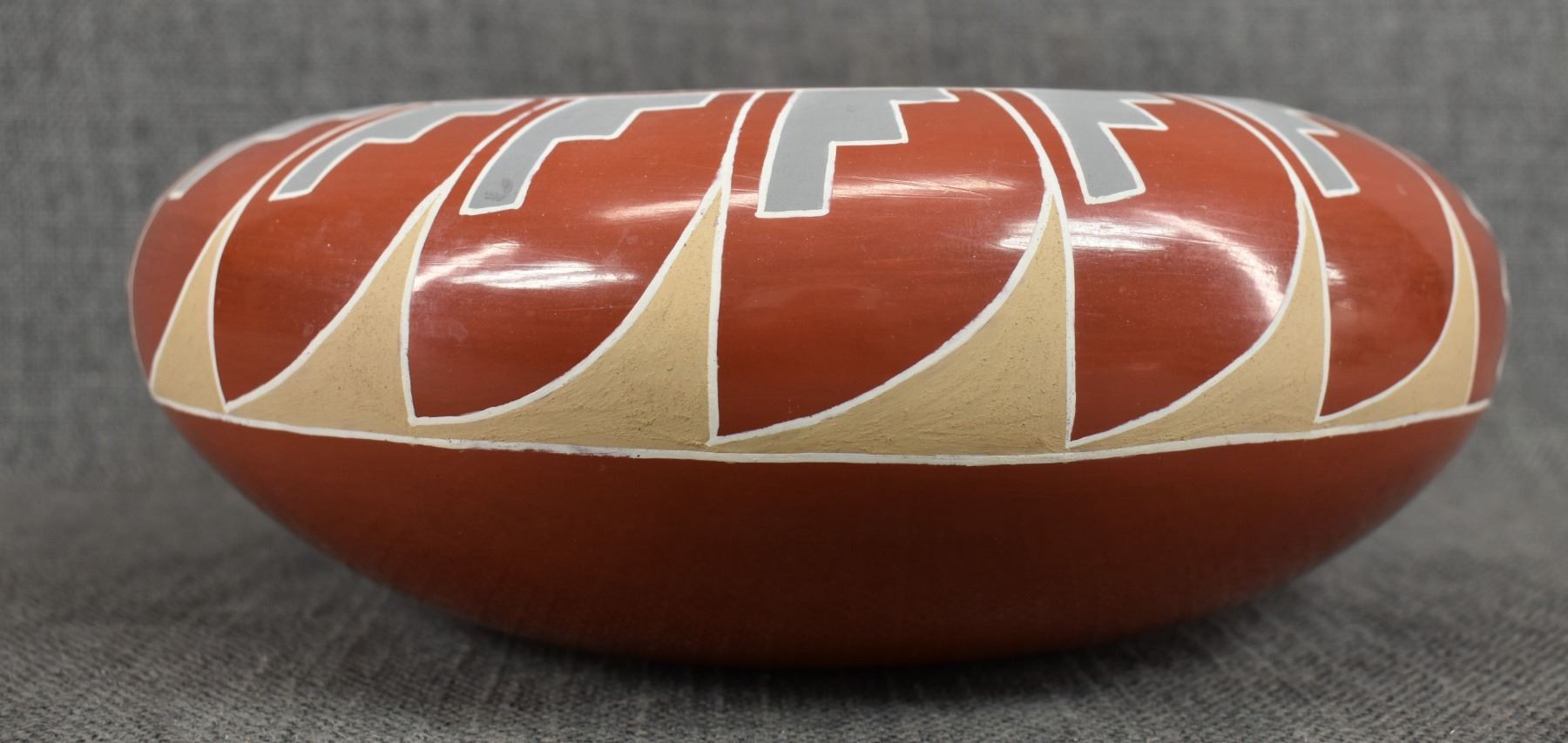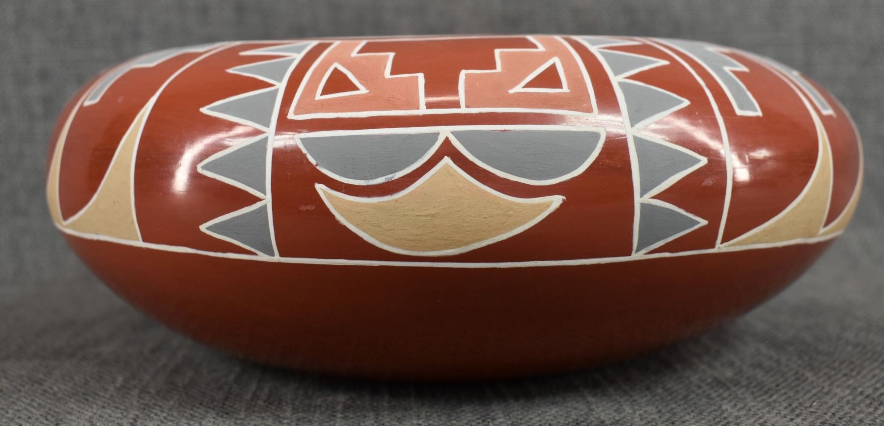 1960s 70s Santa Clara. Hand coiled and painted Polychrome design signed Belen Tapia 4" x 10"