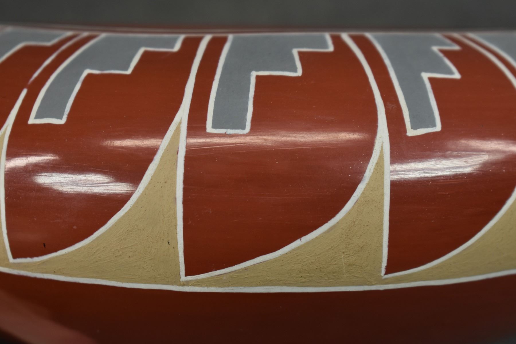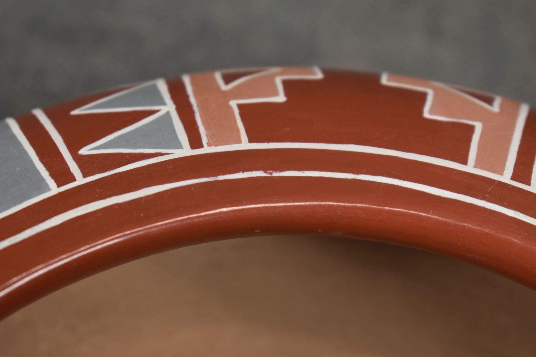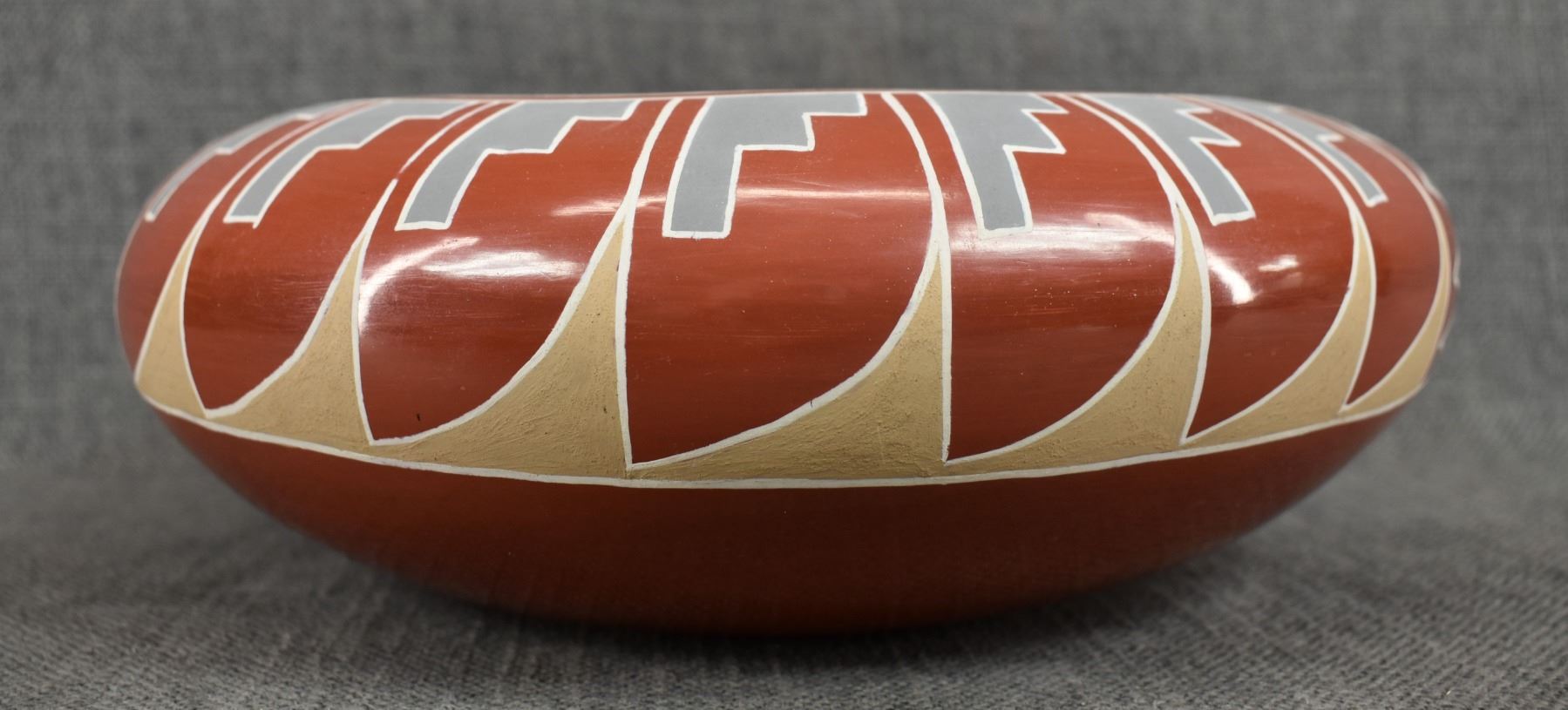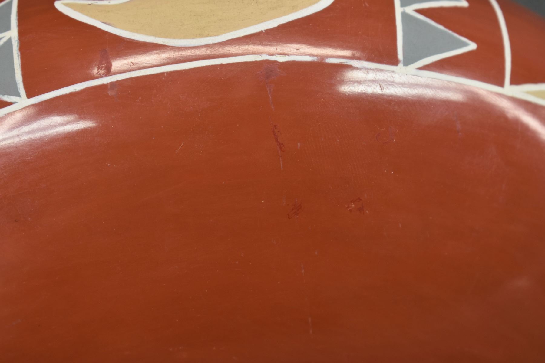 1960s 70s Santa Clara. Hand coiled and painted Polychrome design signed Belen Tapia 4" x 10"