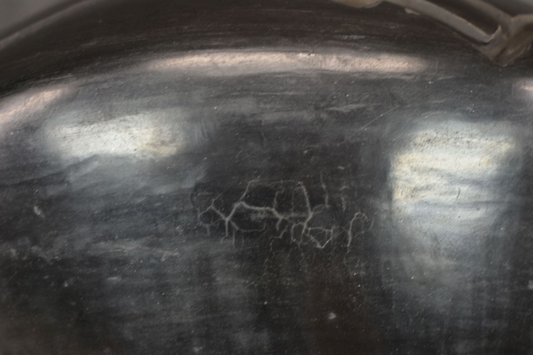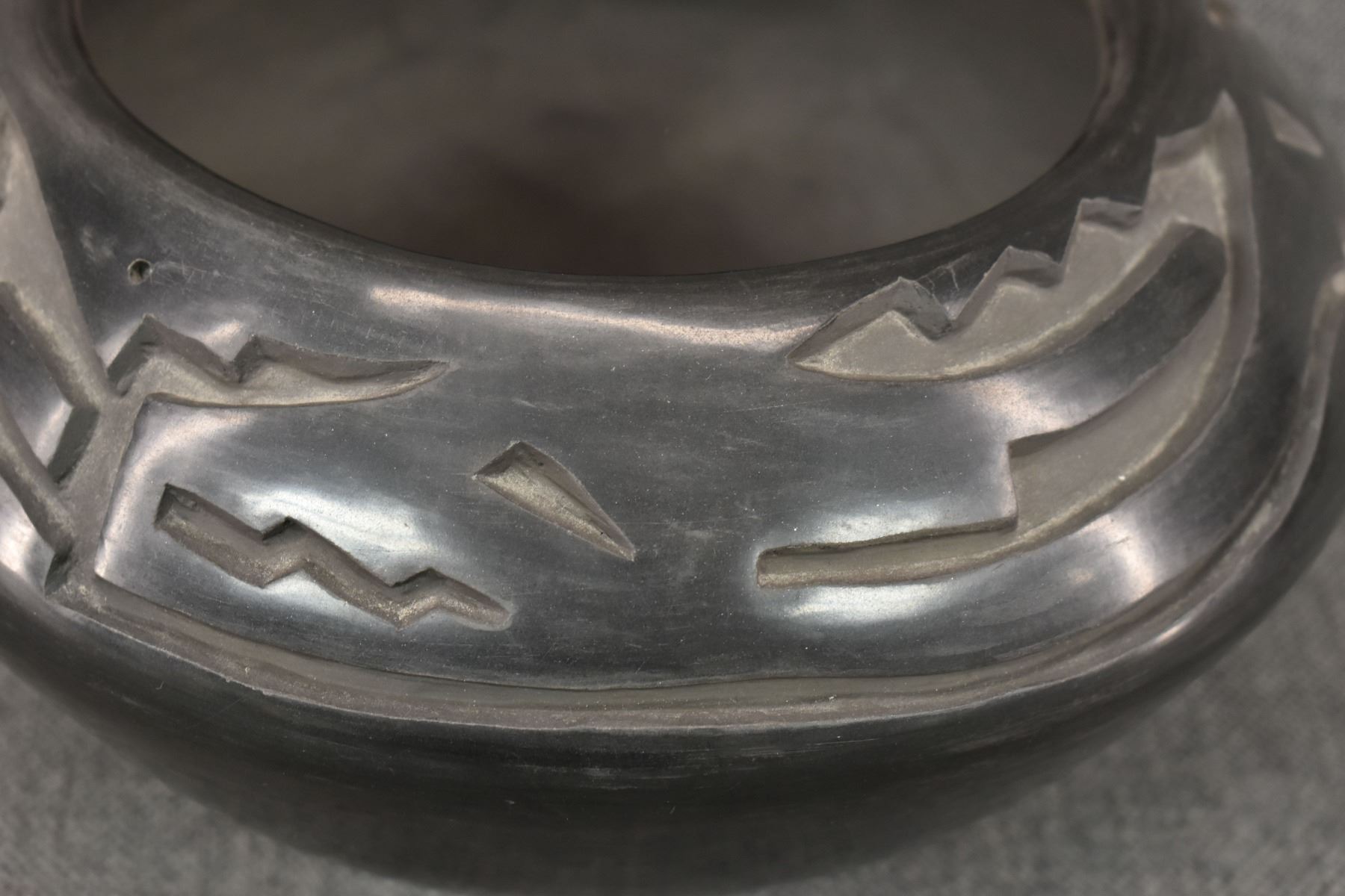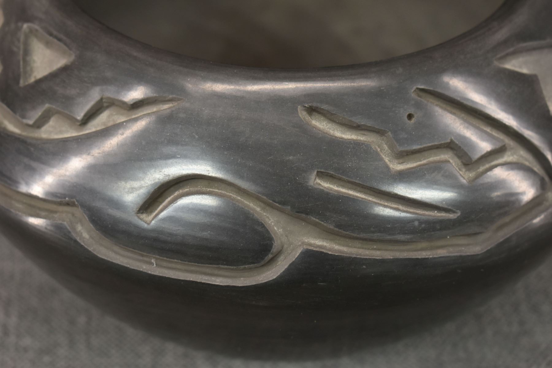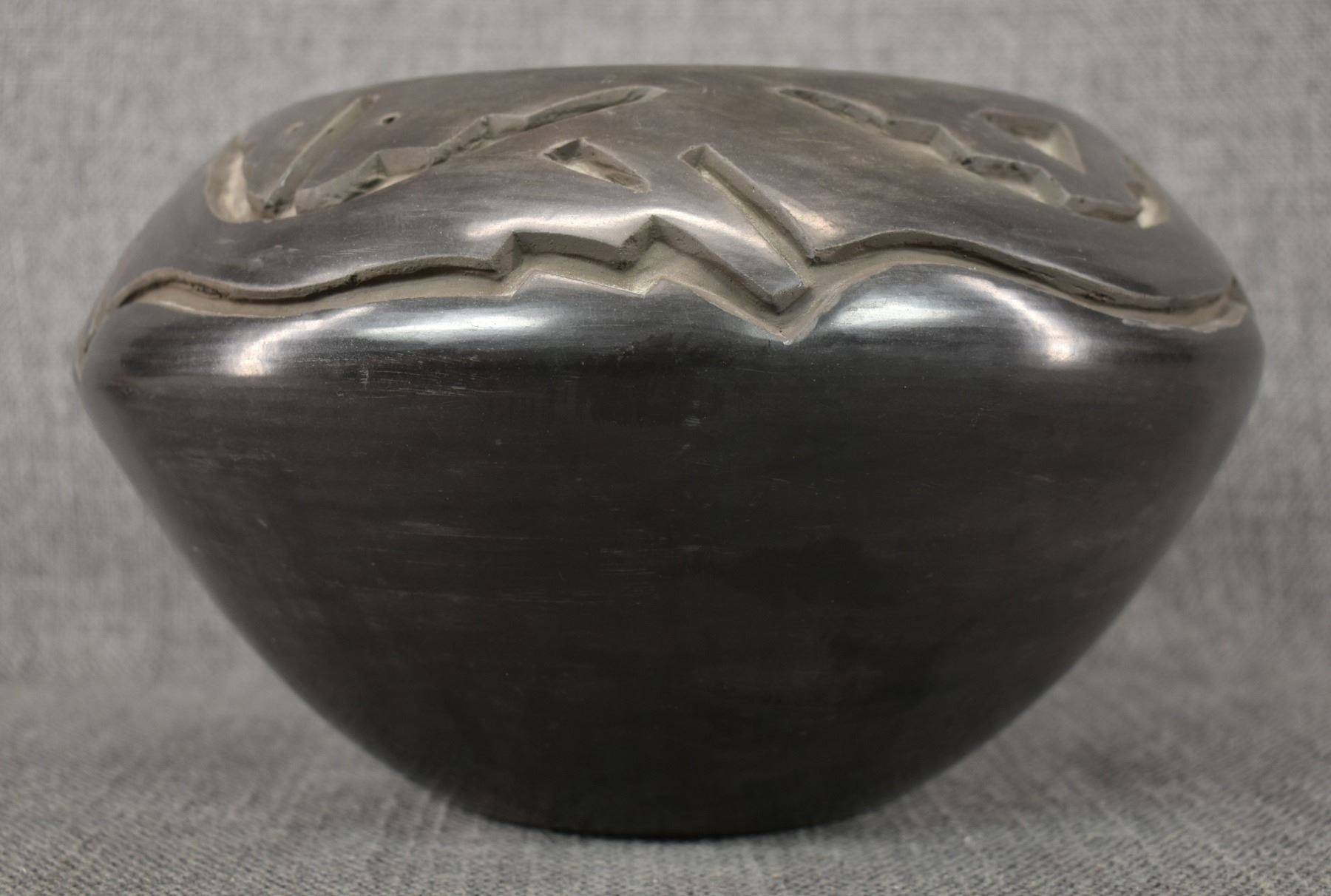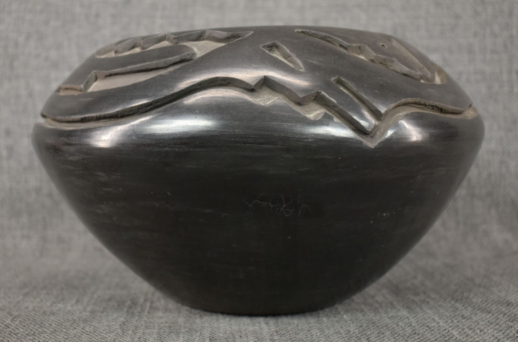 1980's Santa Clara, hand coiled with carved avanyu design by Chris Martinez, 5.5" x 9.5"