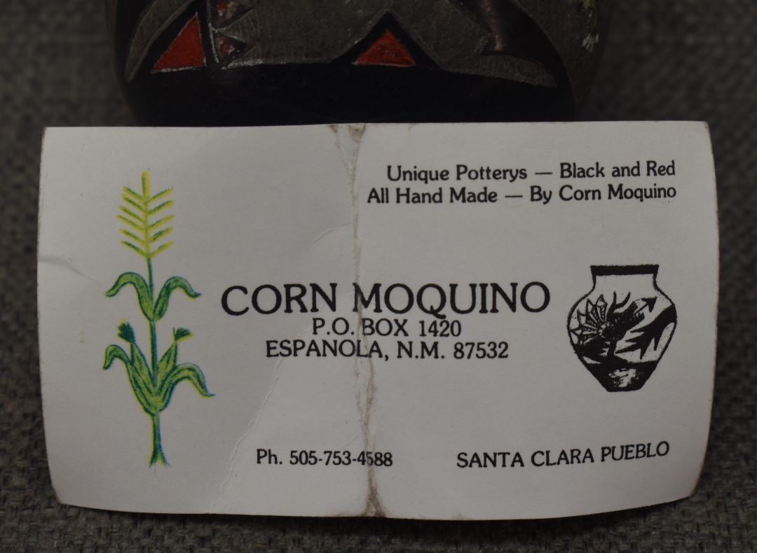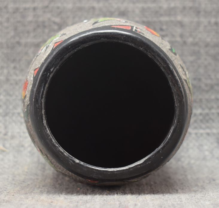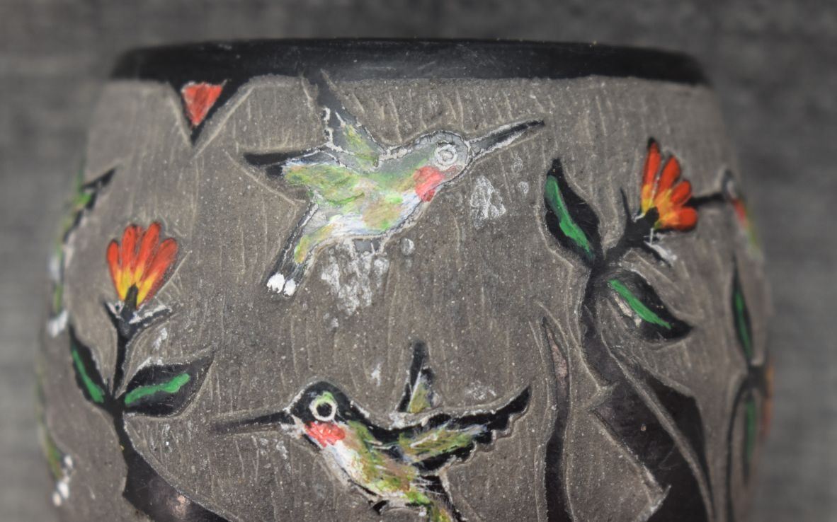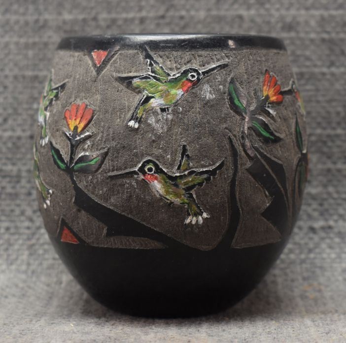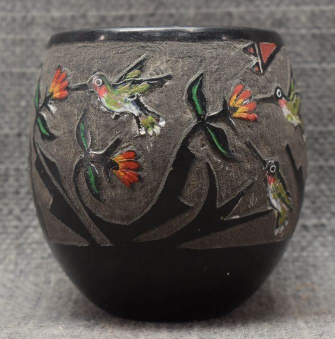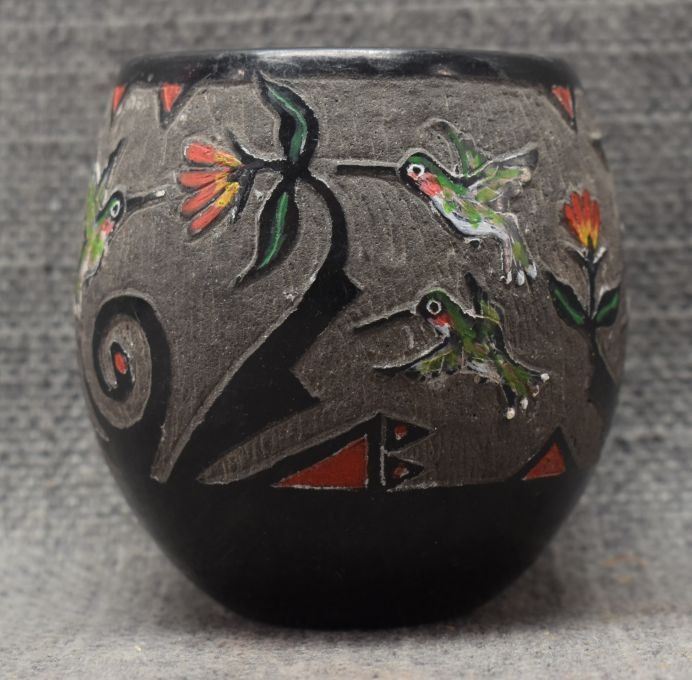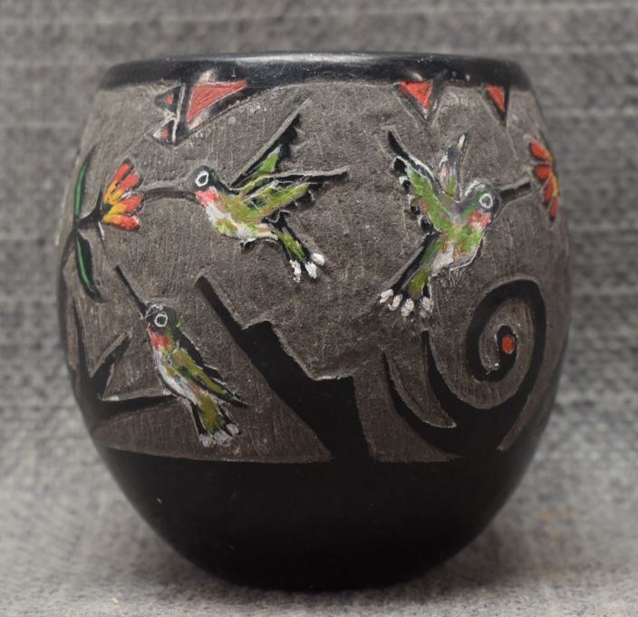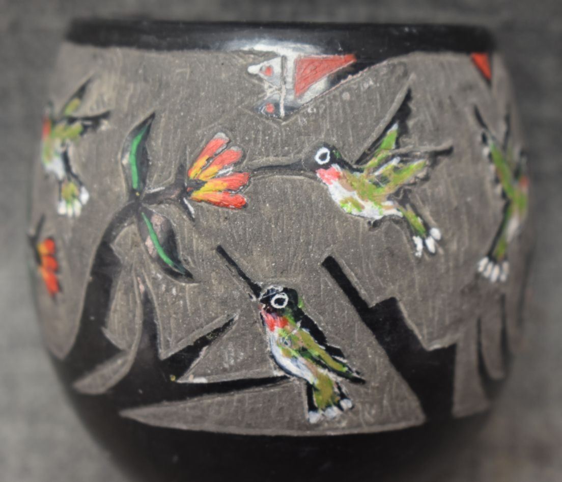 1990's Santa Clara, hand coiled with sgraffito and painted hummingbird and floral design by Corn Moquino 2.75" x 2.75"