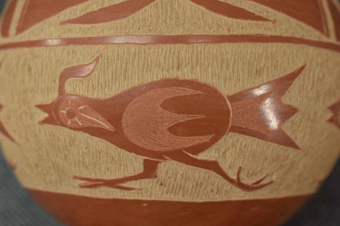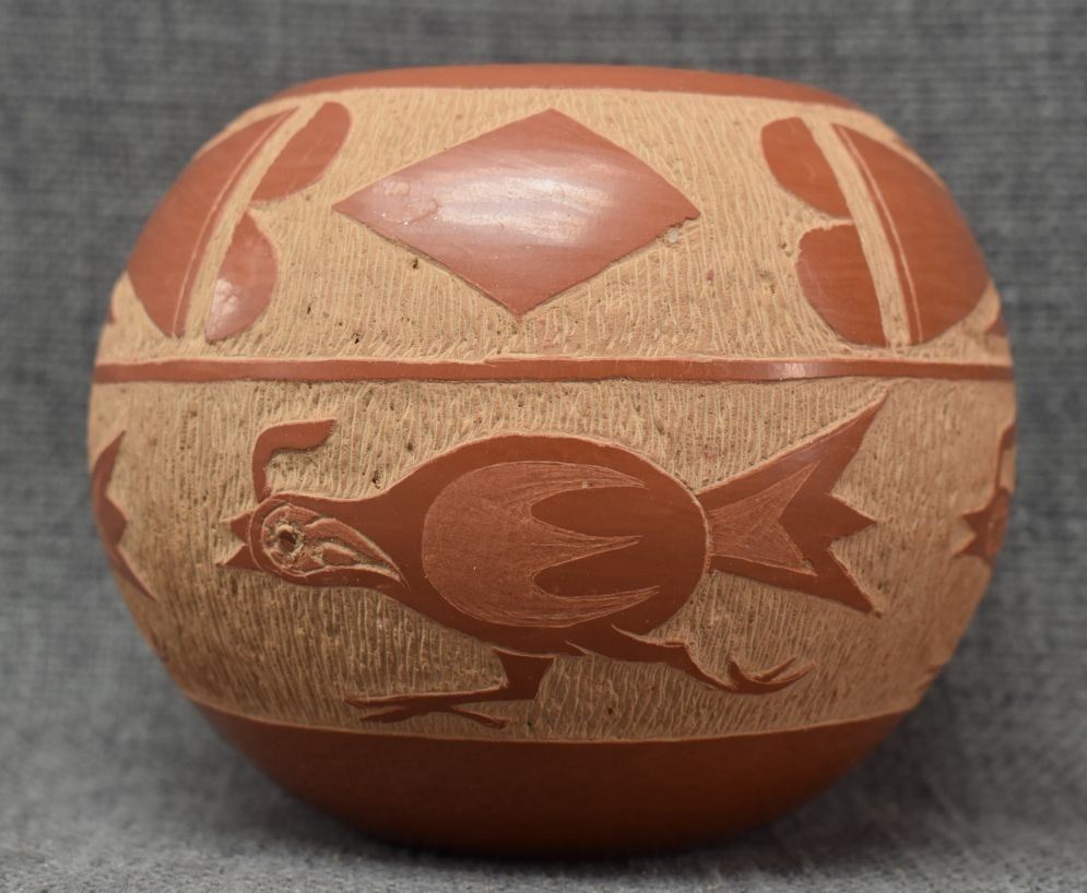 1980-90's Santa Clara, hand coiled with sgraffito Bird and geometric design signed Corn Moquino 3.5" x 4.25"