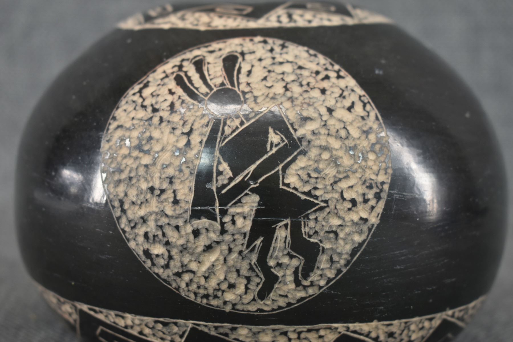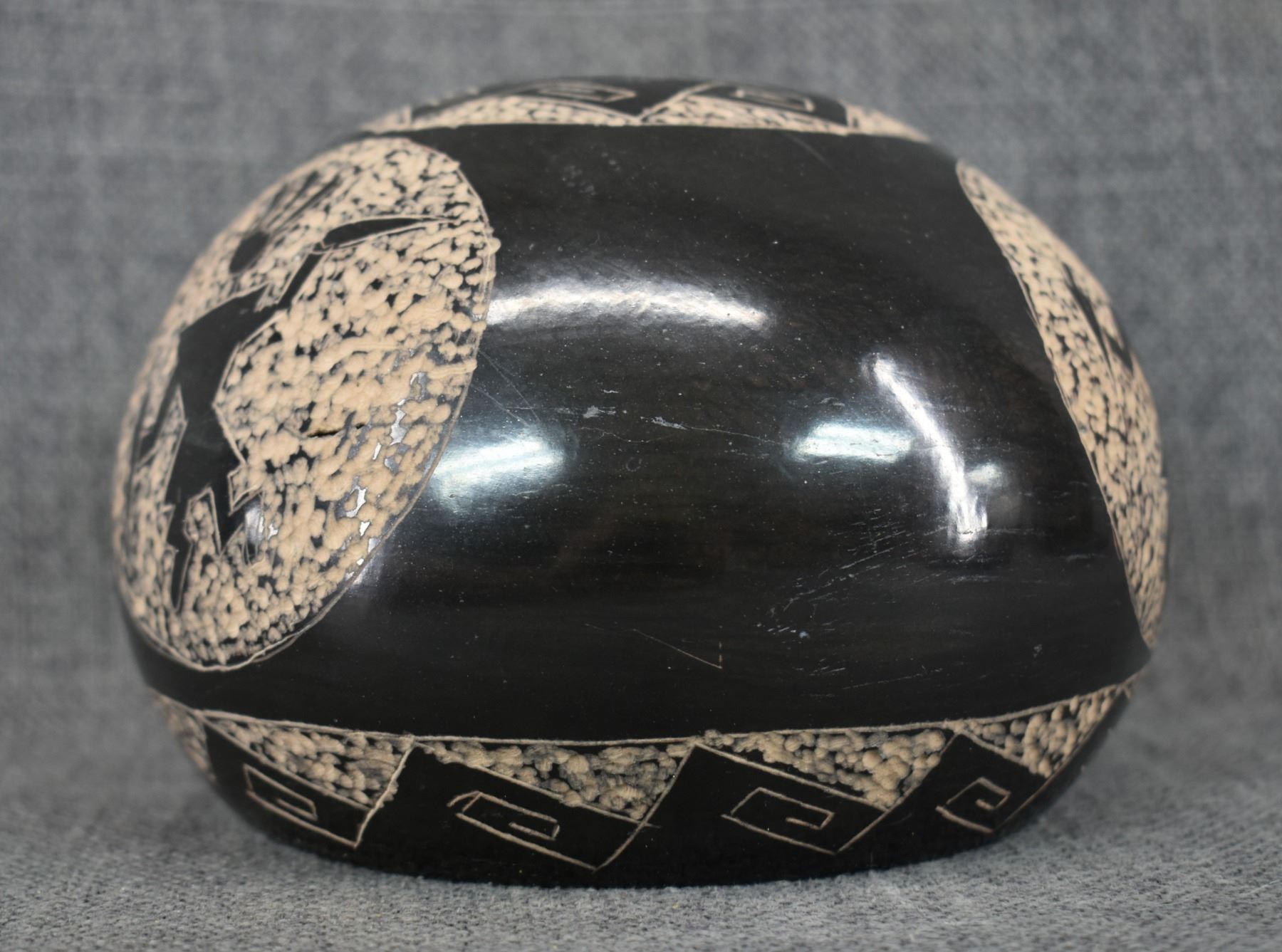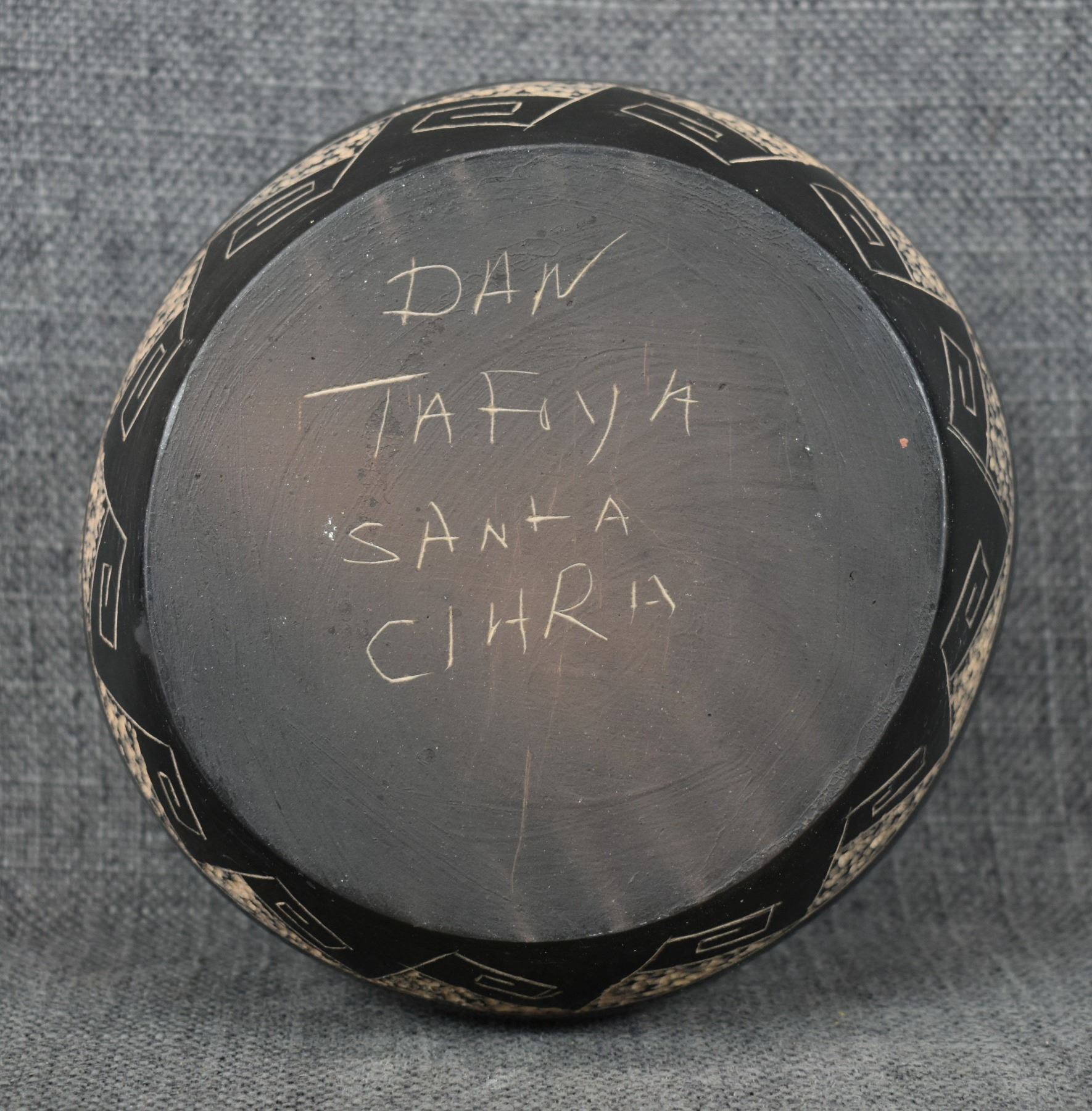 1990's Santa Clara. Hand coiled and sgraffito design pottery bowl. Signed Dan Tafoya. 4'' x 6''