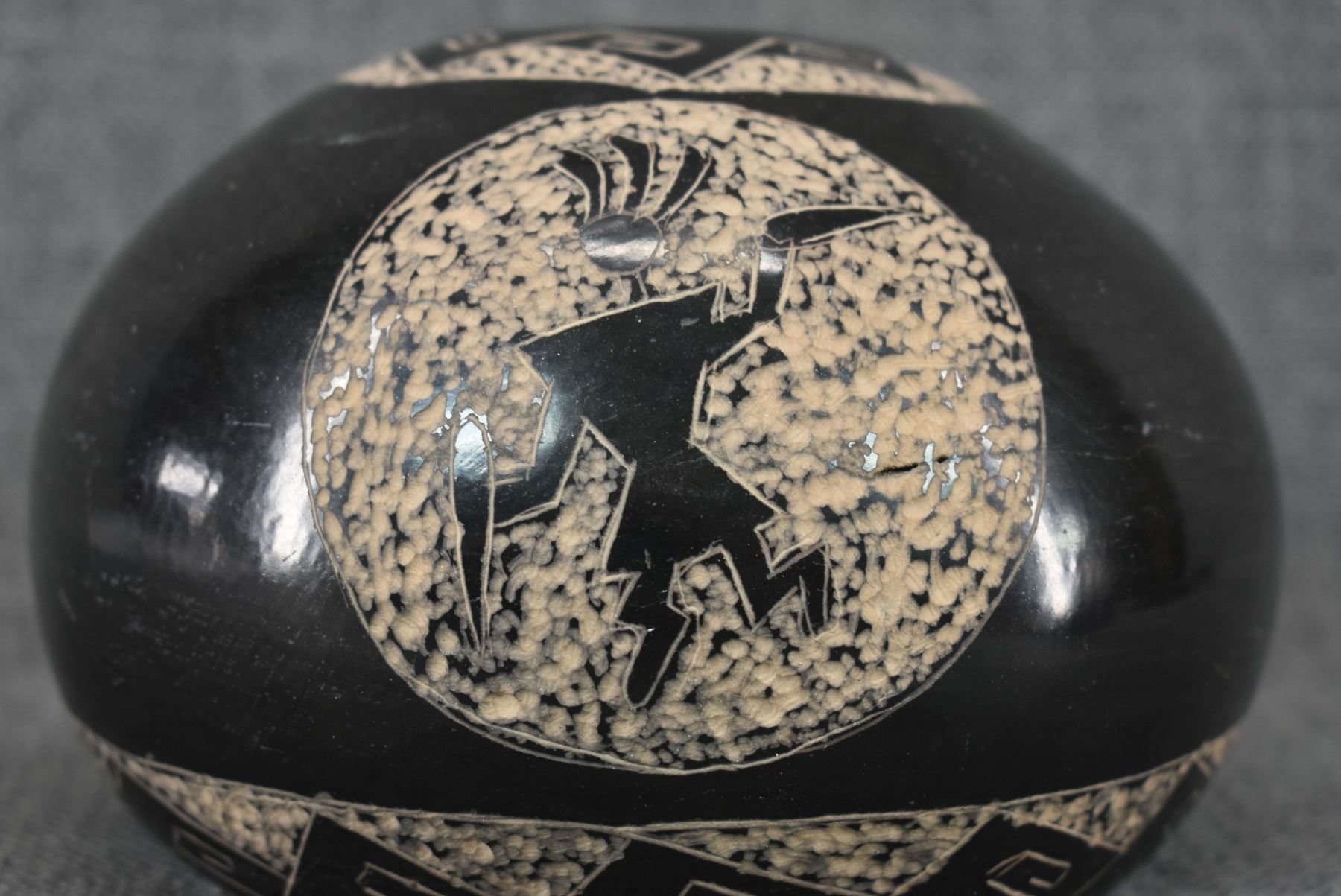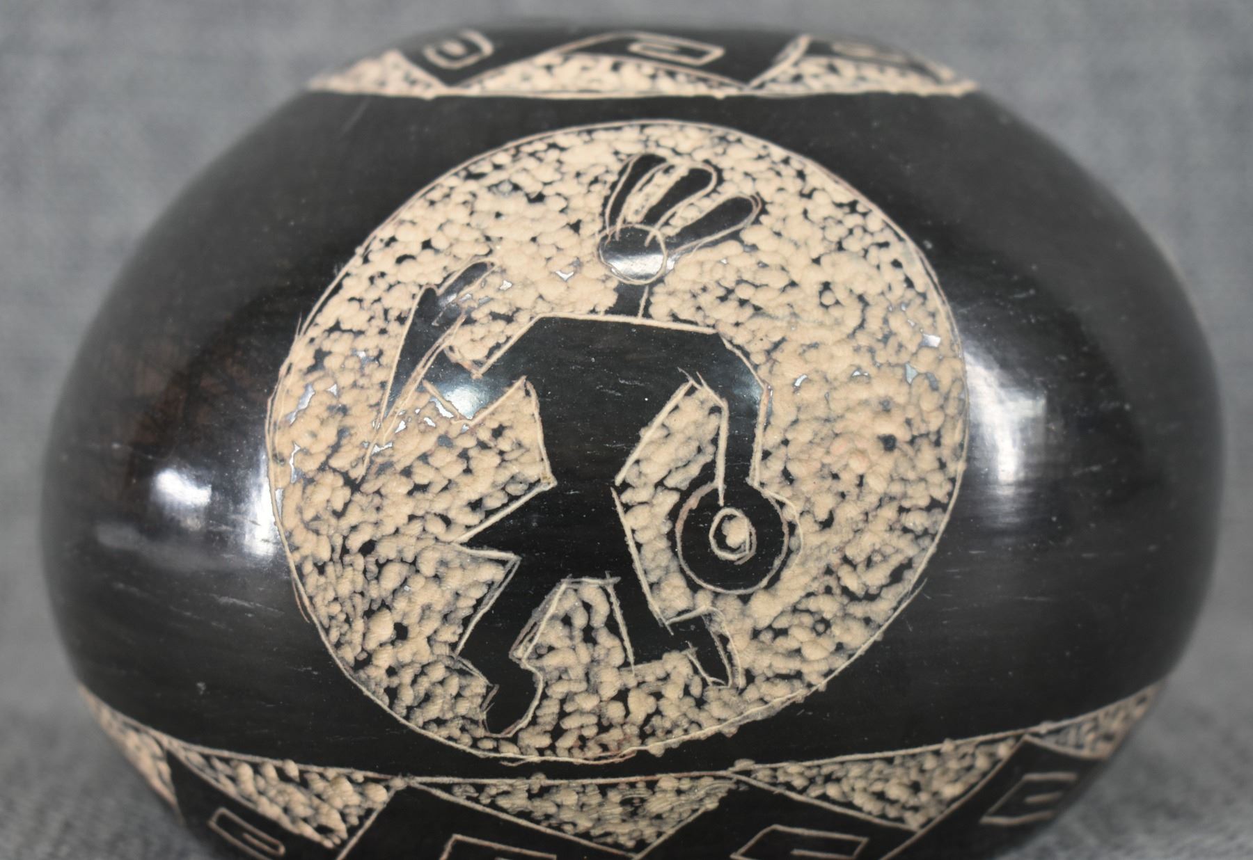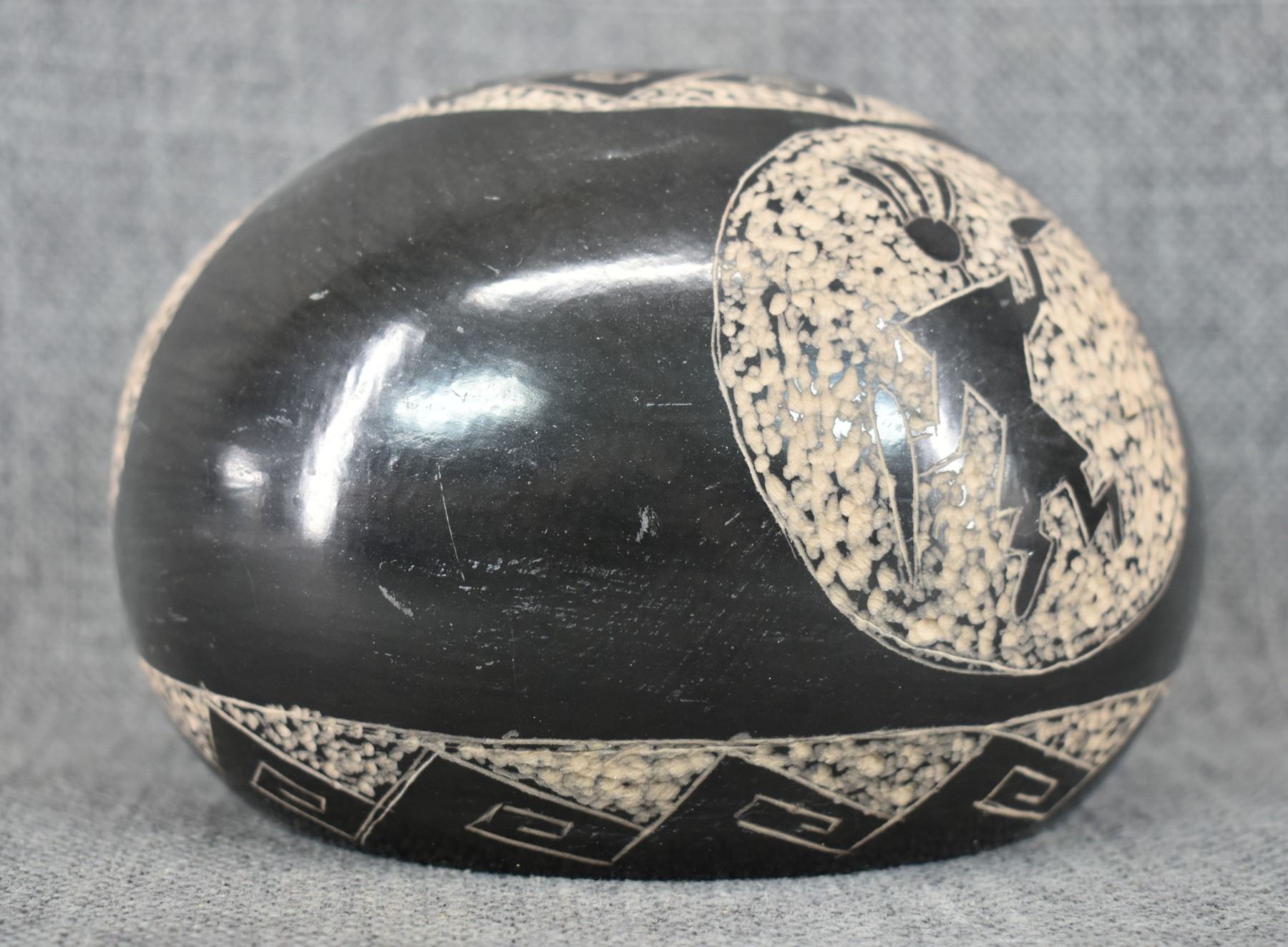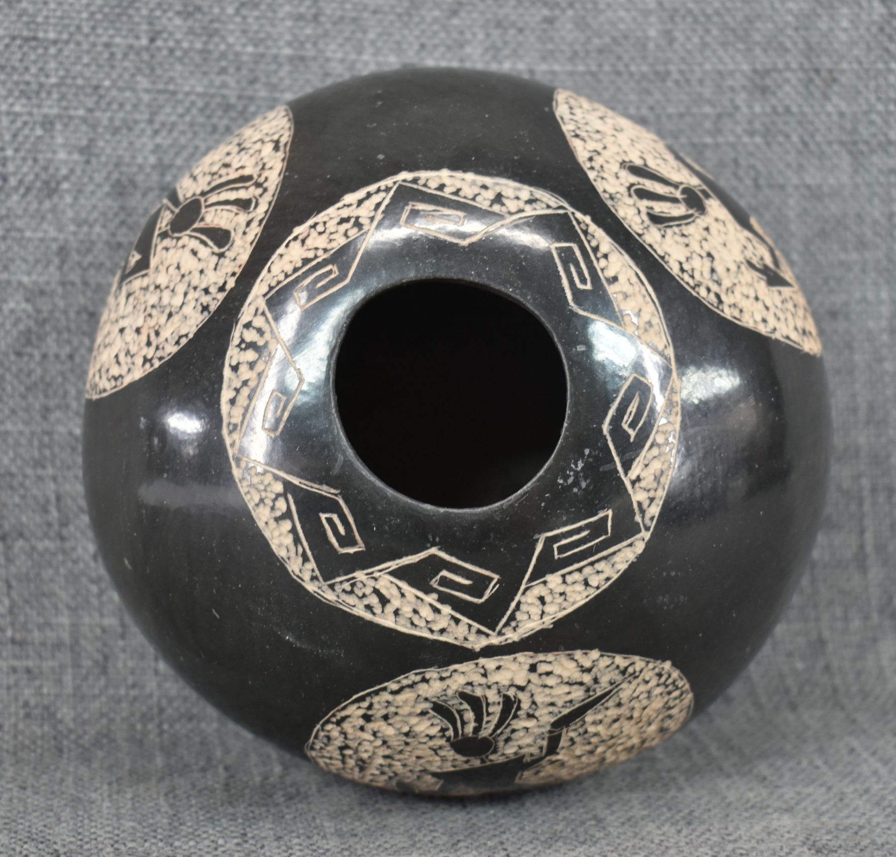 1990's Santa Clara. Hand coiled and sgraffito design pottery bowl. Signed Dan Tafoya. 4'' x 6''