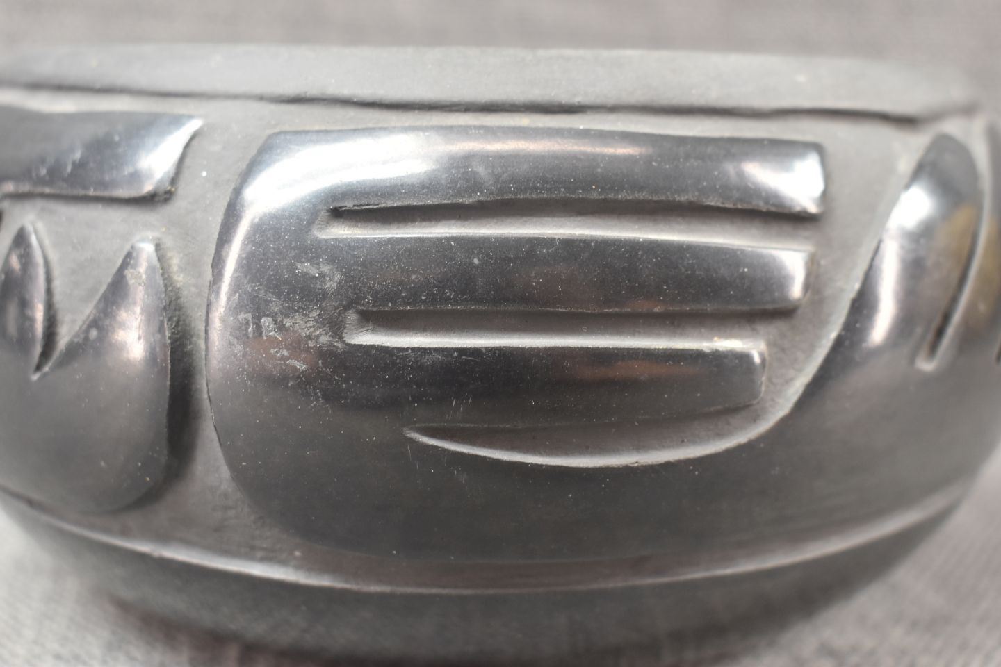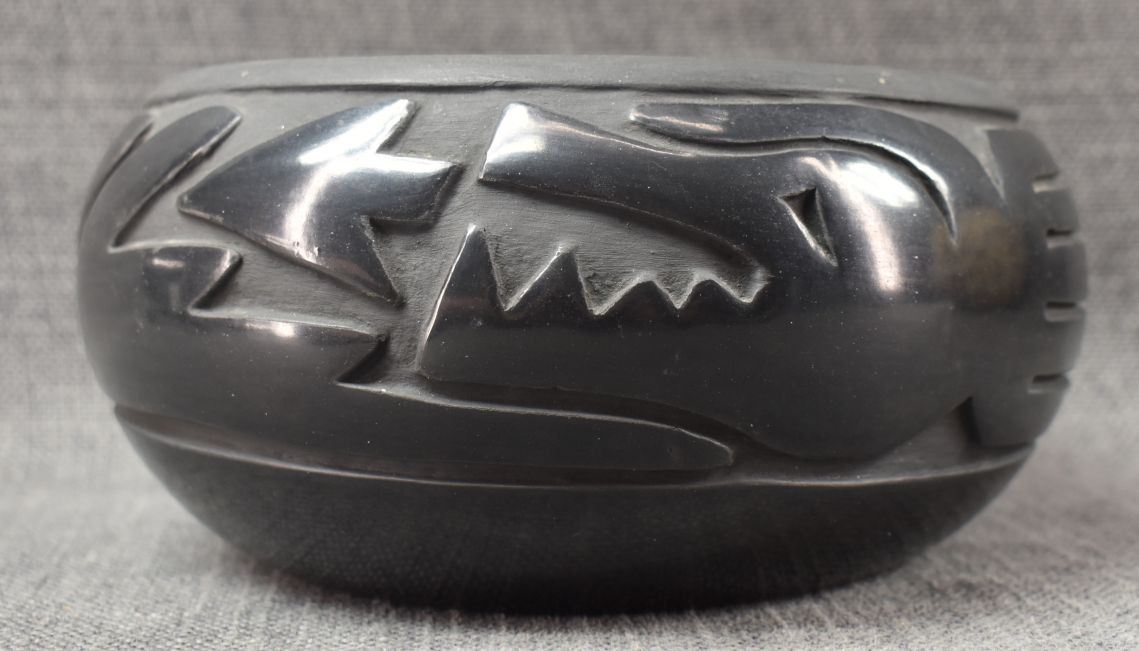 1960's Santa Clara, hand coiled with carved avanyu design signed Grace and a flower & Camilio Tafoya 3.75" x 7.5"