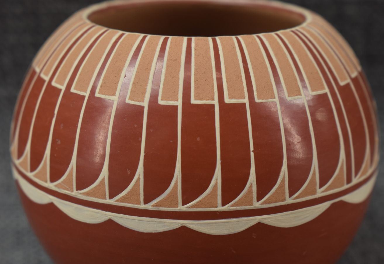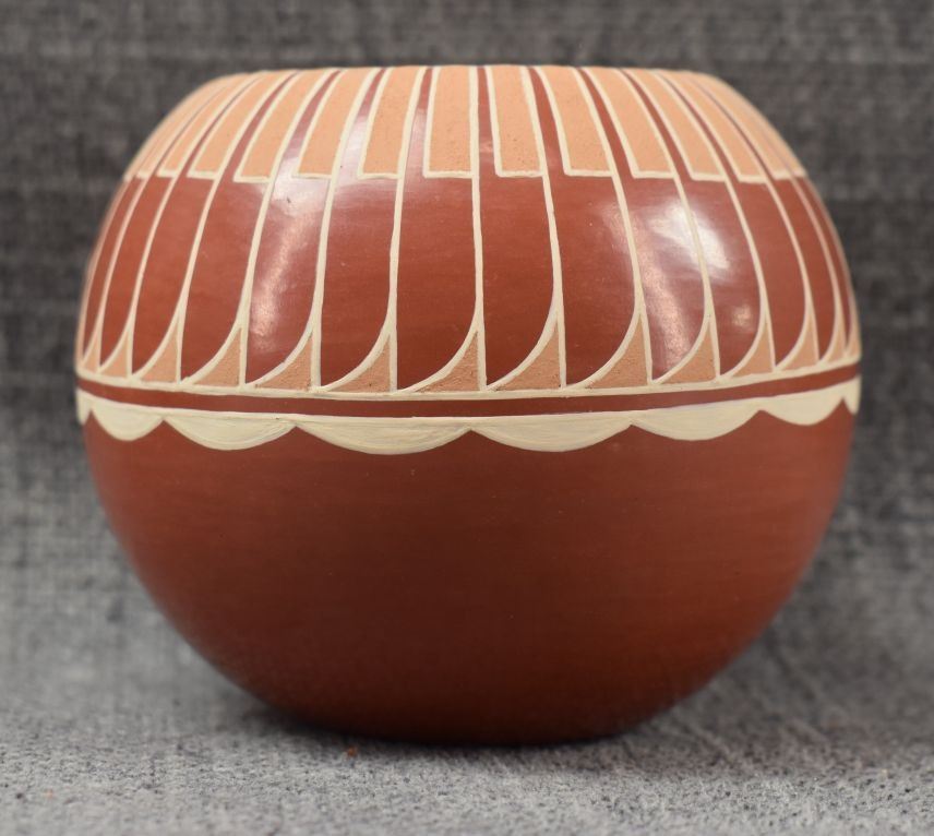 1994 Santa Clara, hand coiled with polychrome painted feather design by Janel BigCrow 2.75" x 3"