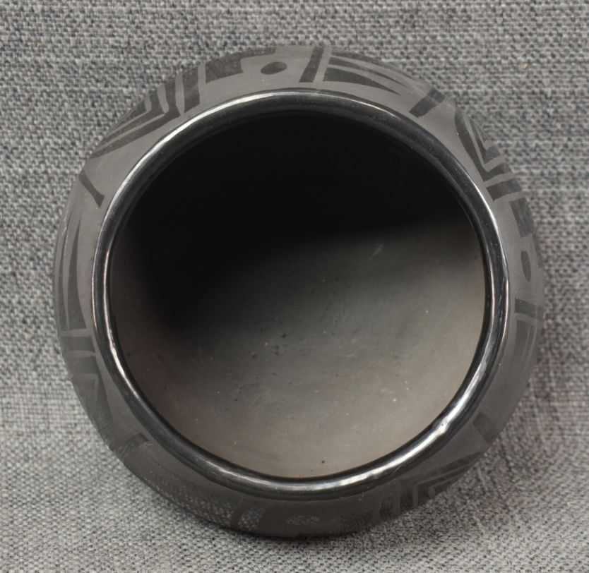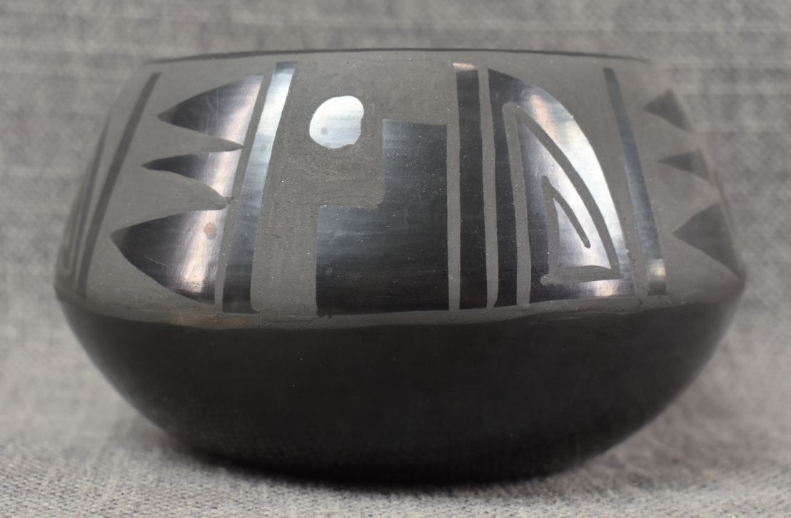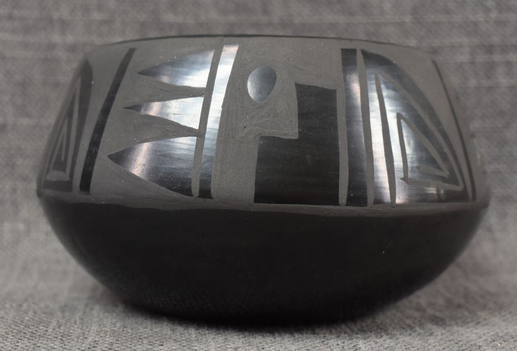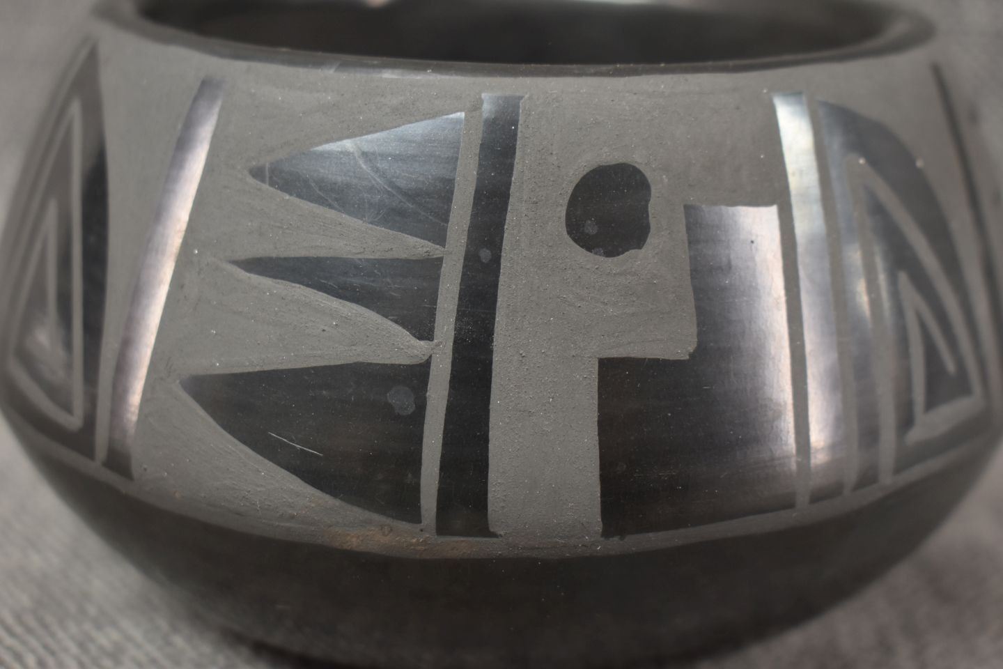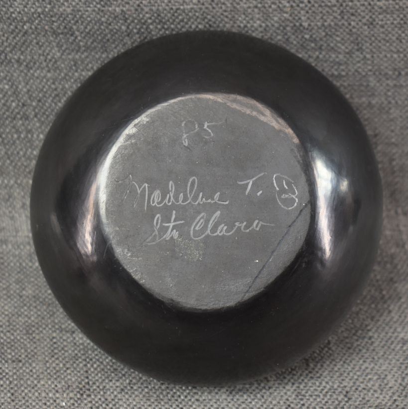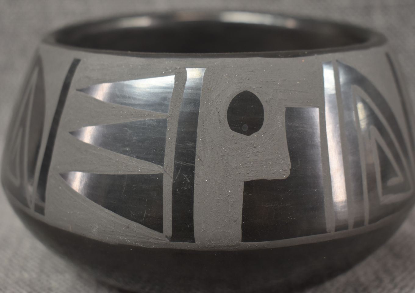 1980's Santa Clara. Hand coiled And painted geometric design pottery bowl. Signed Madeline. 3'' x 6''
