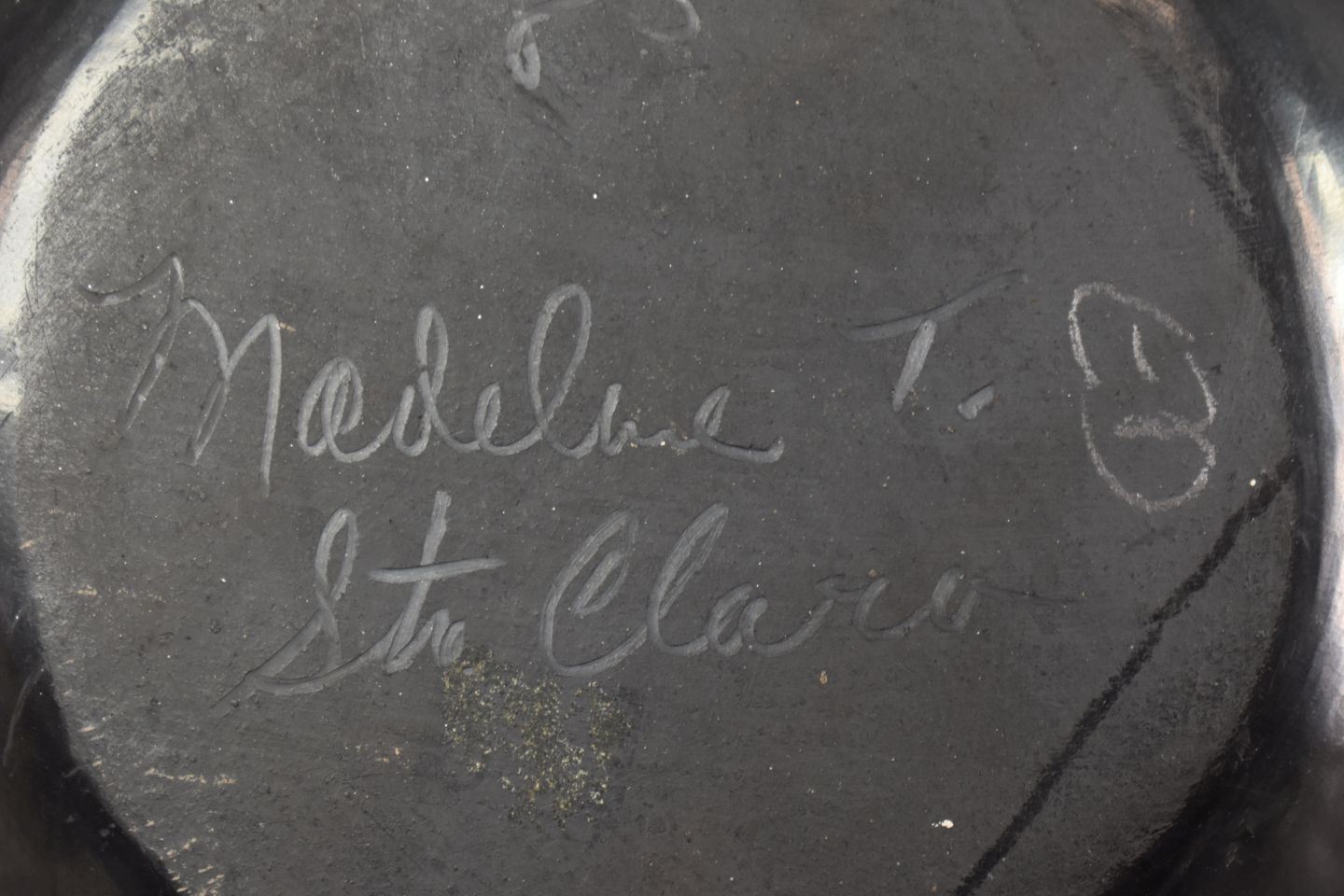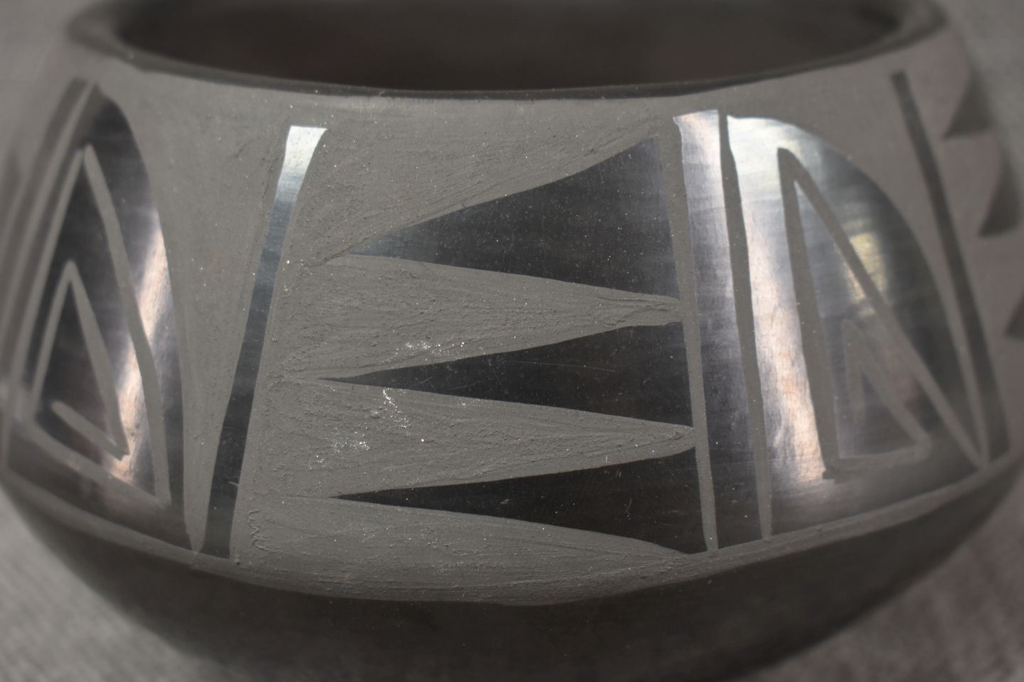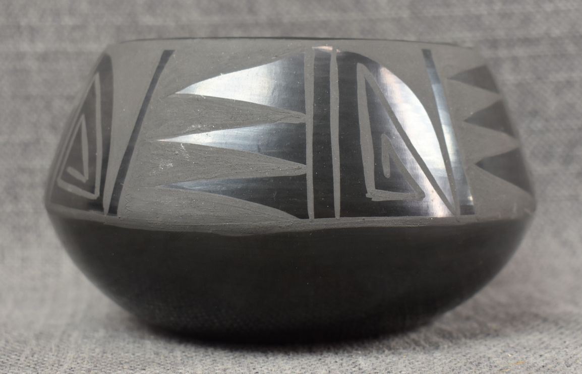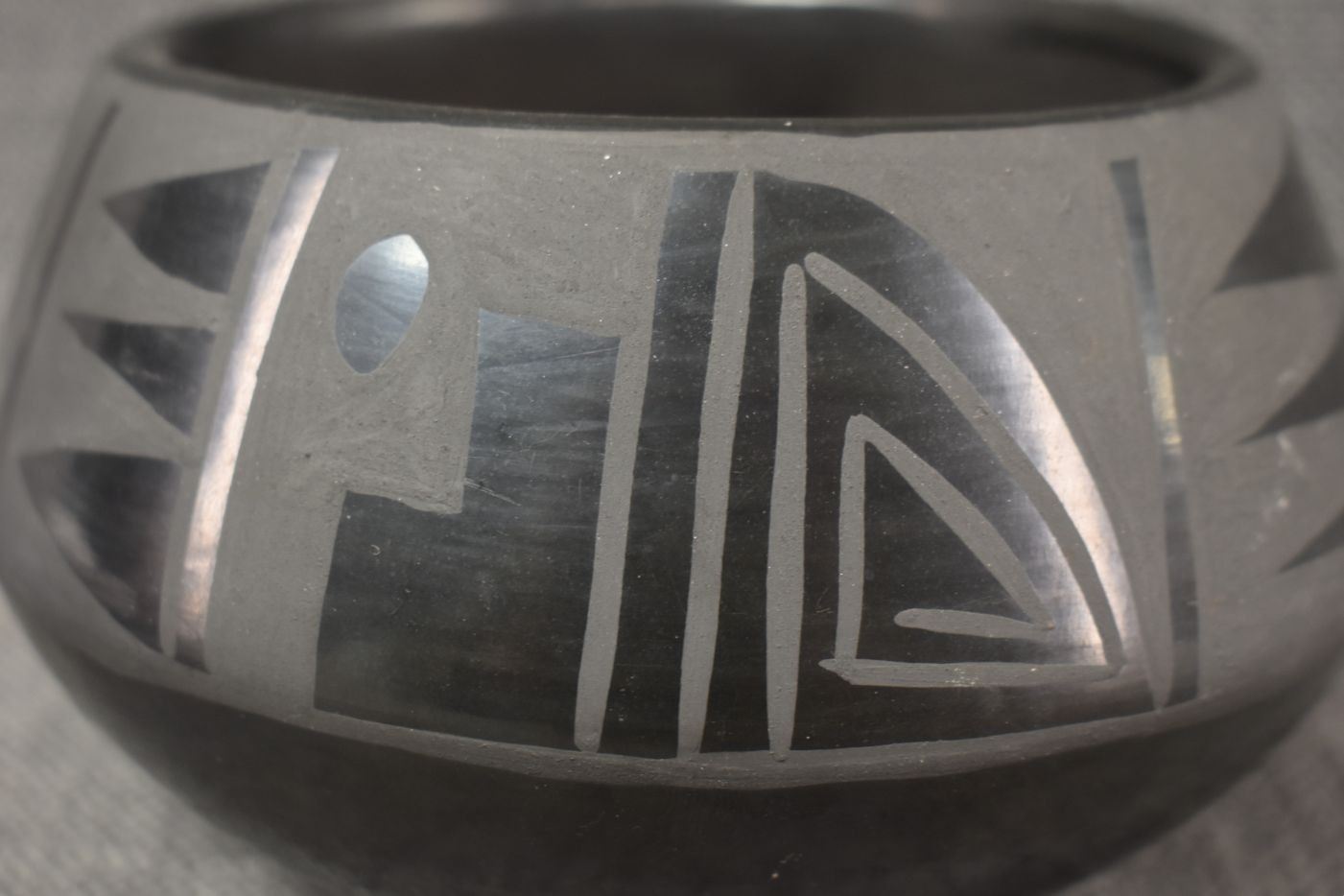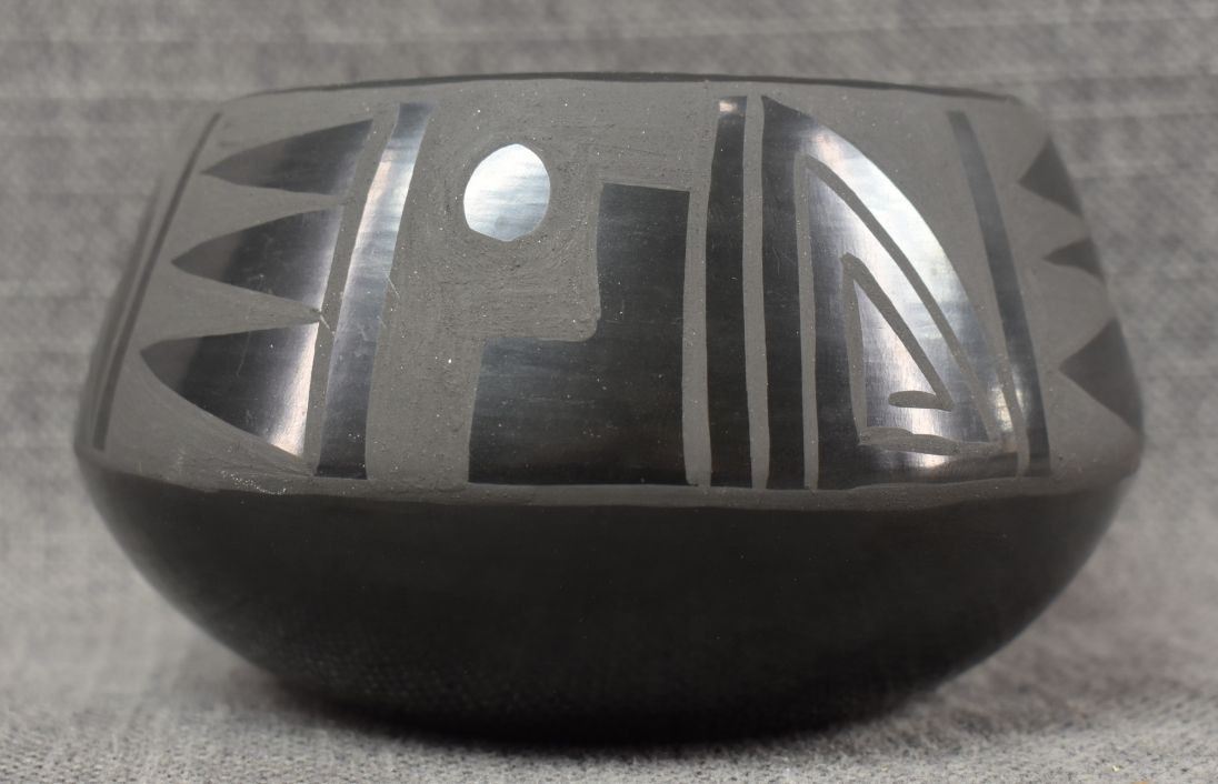 1980's Santa Clara. Hand coiled And painted geometric design pottery bowl. Signed Madeline. 3'' x 6''