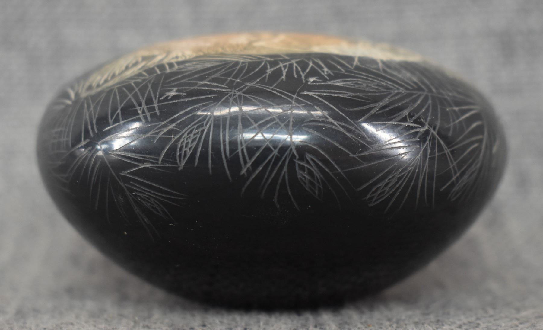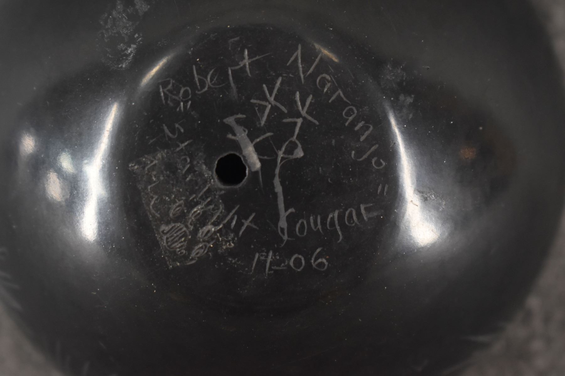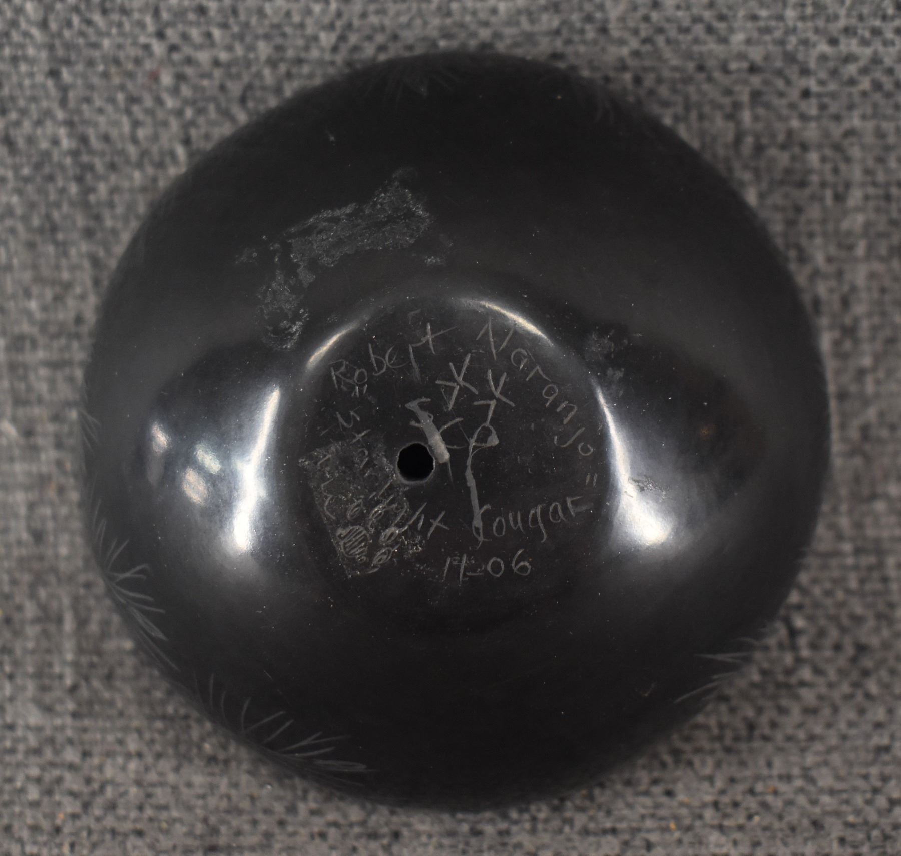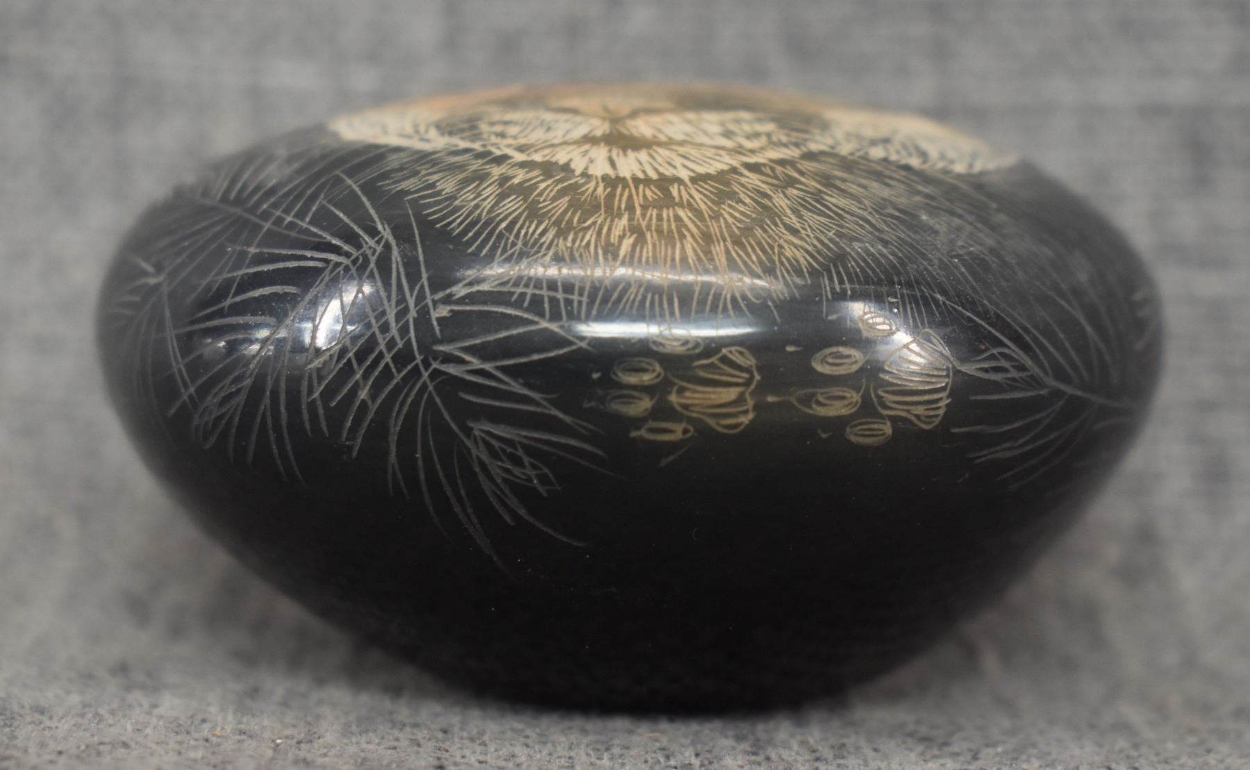 2004 Santa Clara. Hand coiled and sgraffito design pottery bowl. Signed Makowa Ko Naranjo. 1.75'' x 3.5''