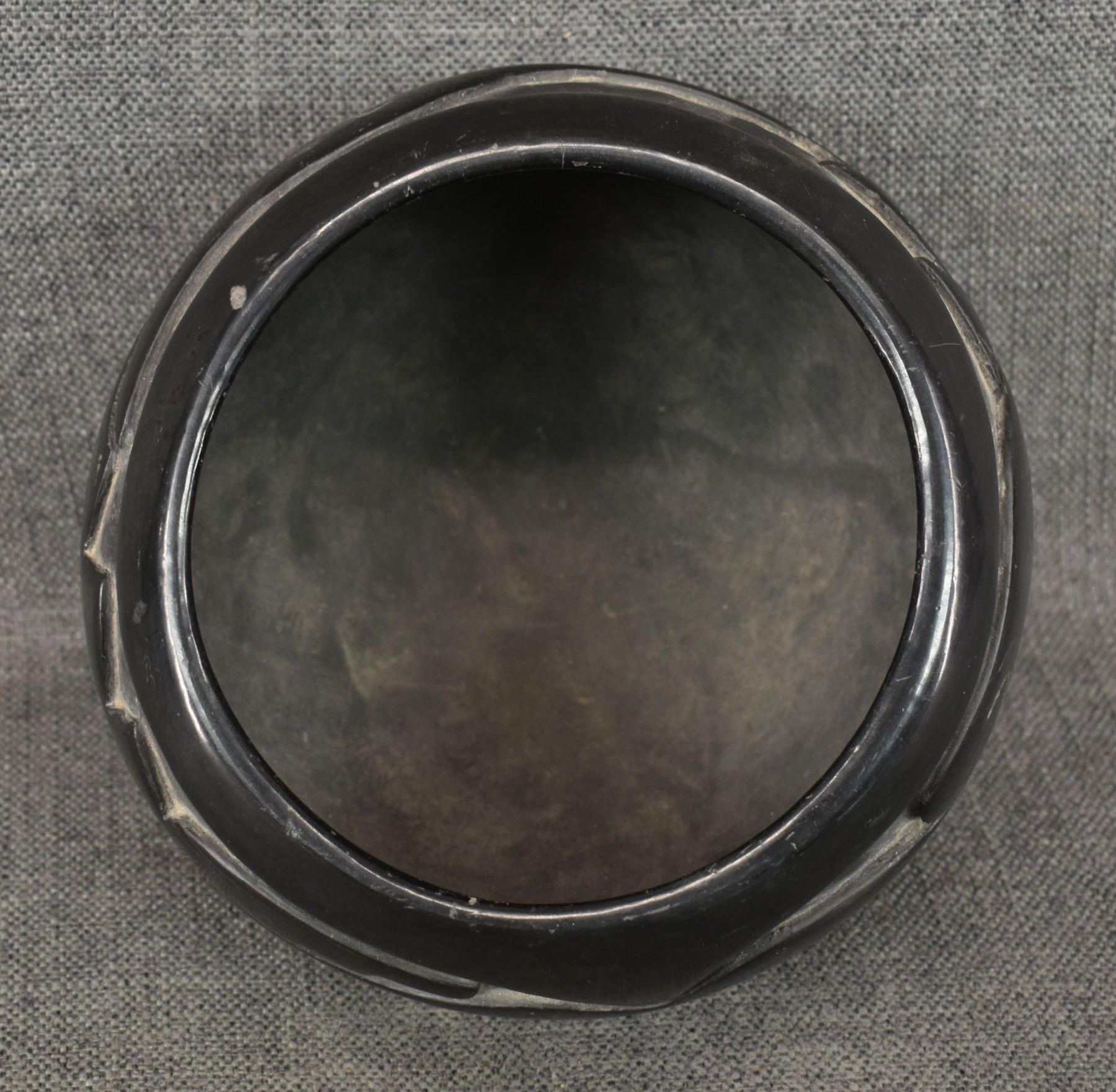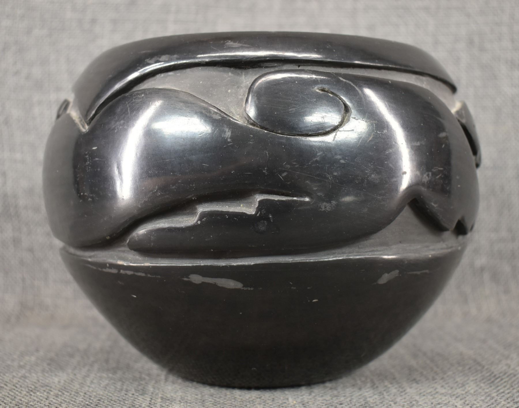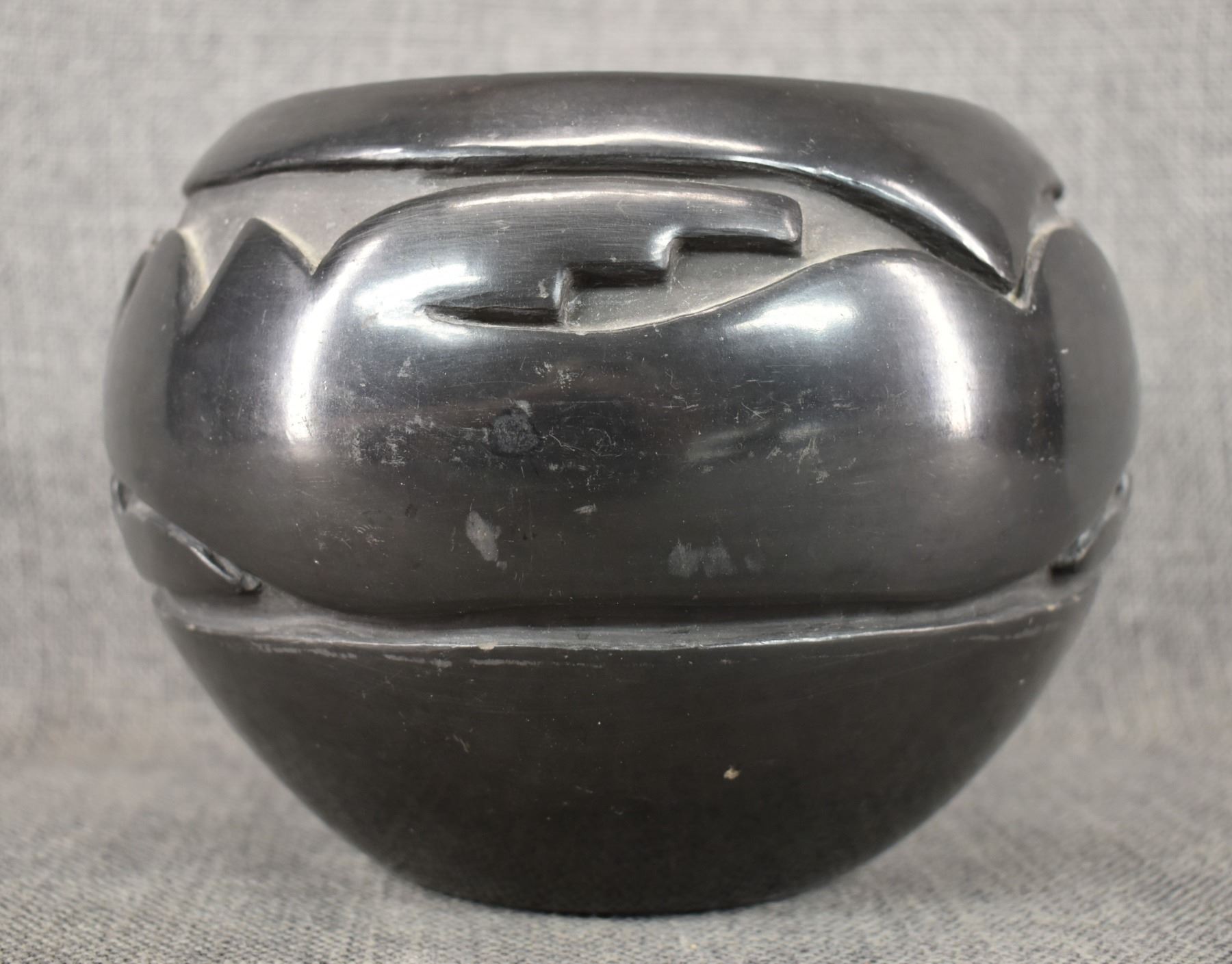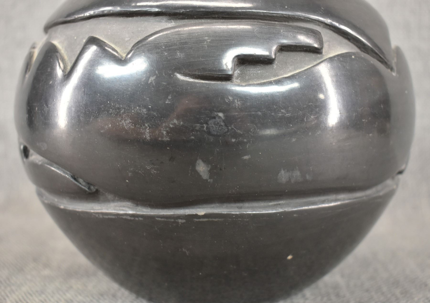 1980's Santa Clara, hand coiled with carved avanyu design signed Mida Tafoya. 6" x 8" has surface damage.