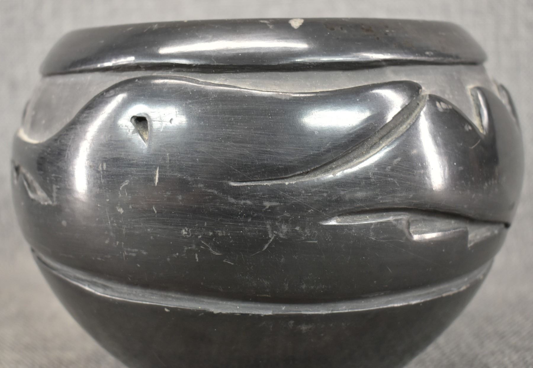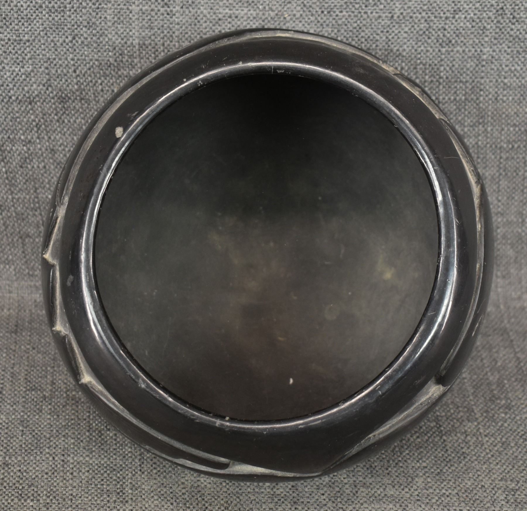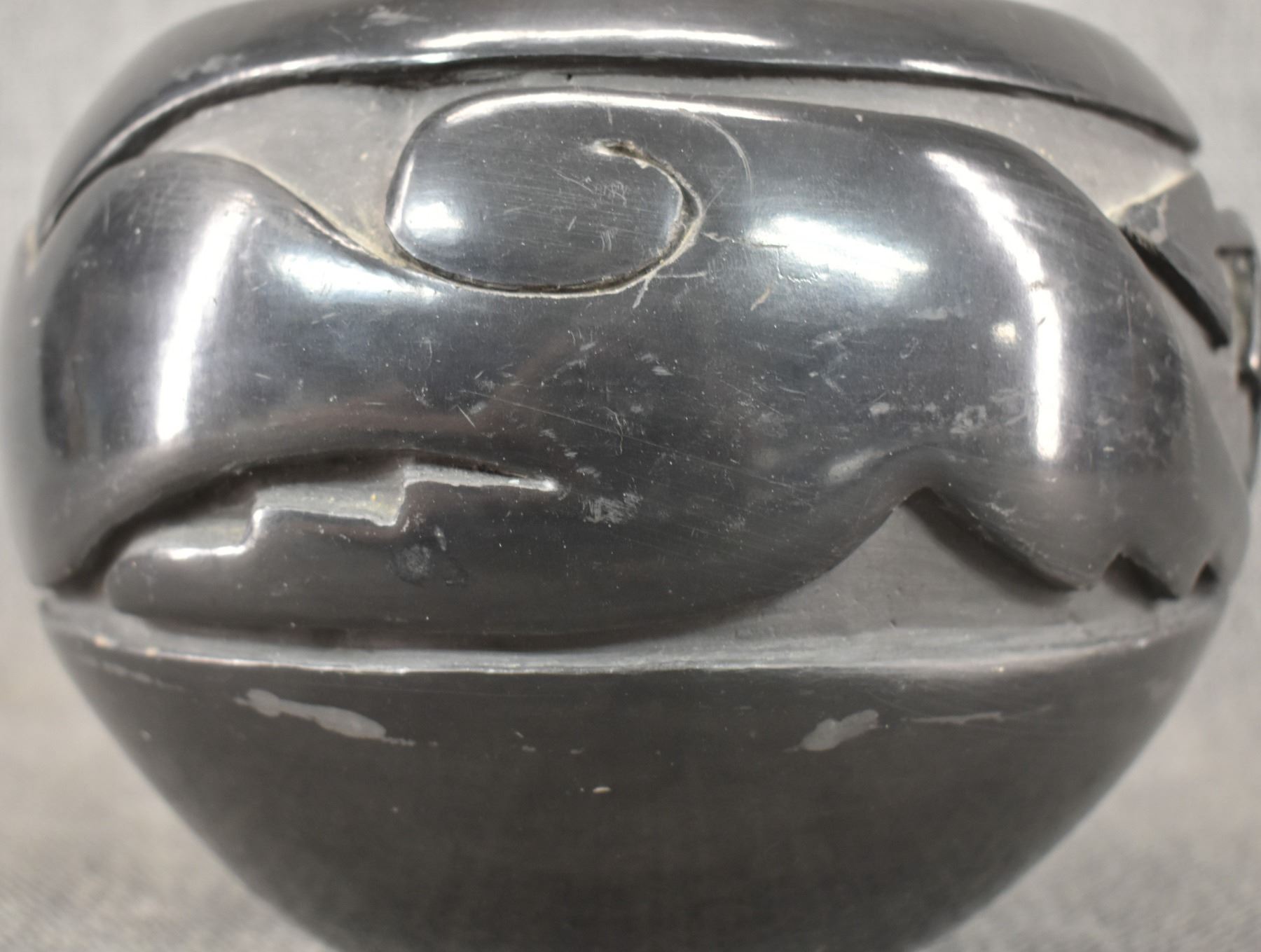 1980's Santa Clara, hand coiled with carved avanyu design signed Mida Tafoya. 6" x 8" has surface damage.