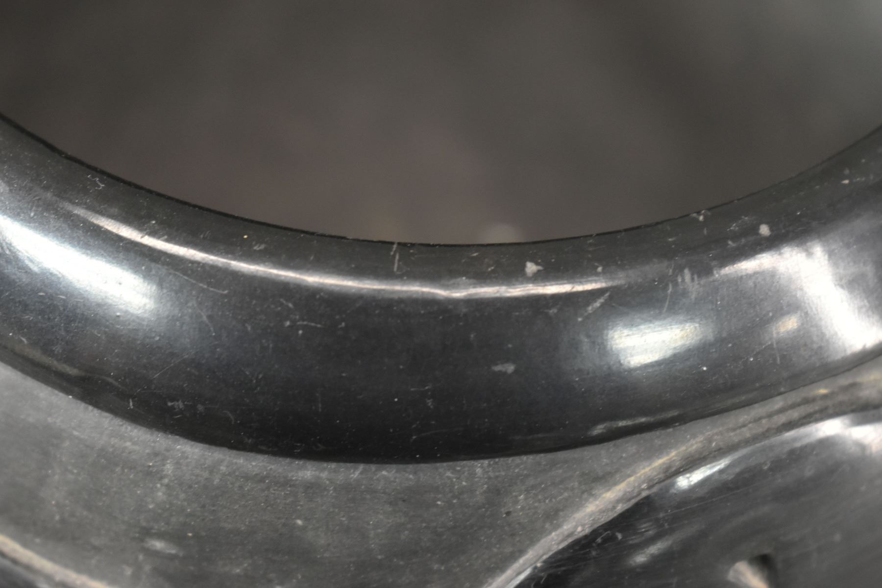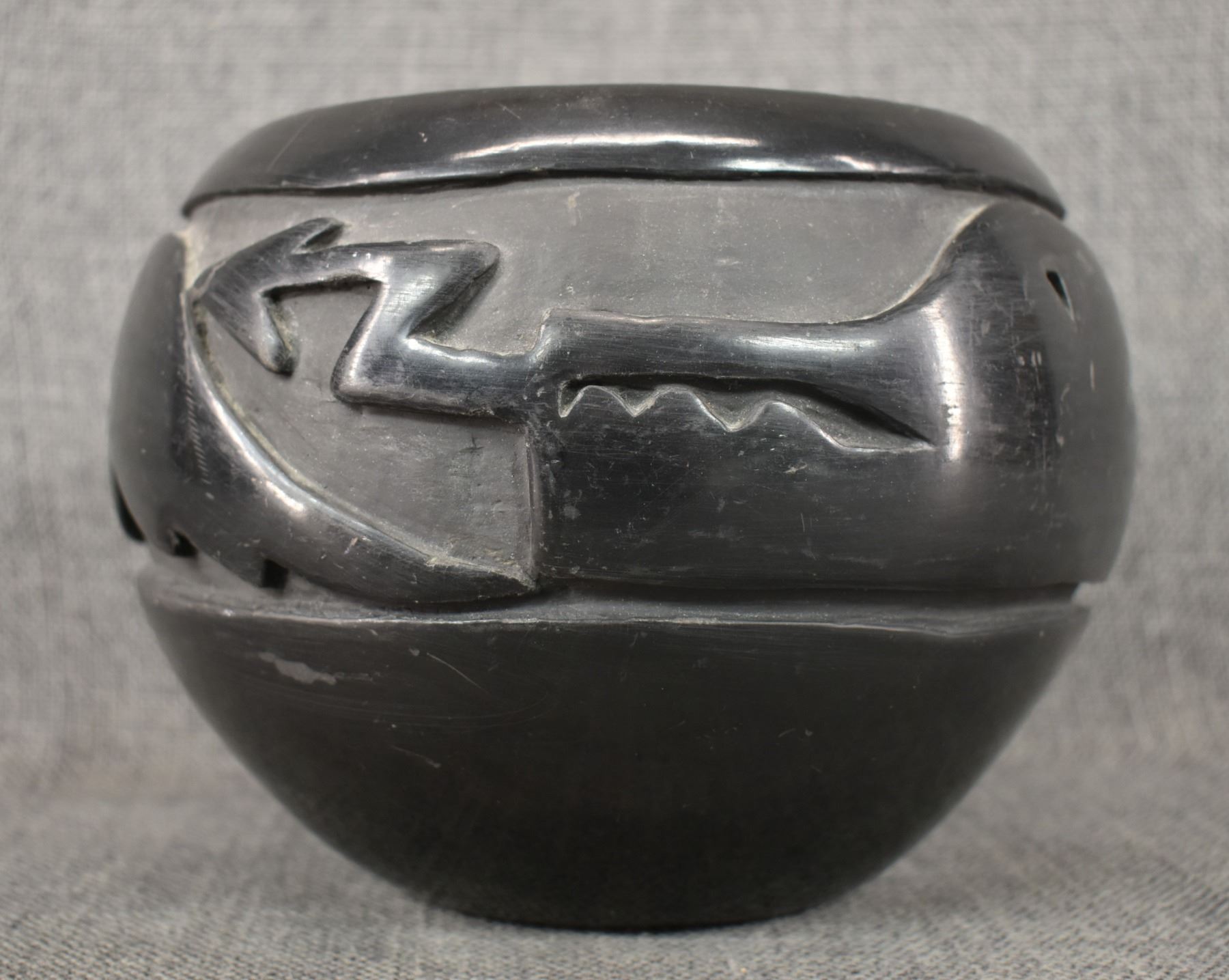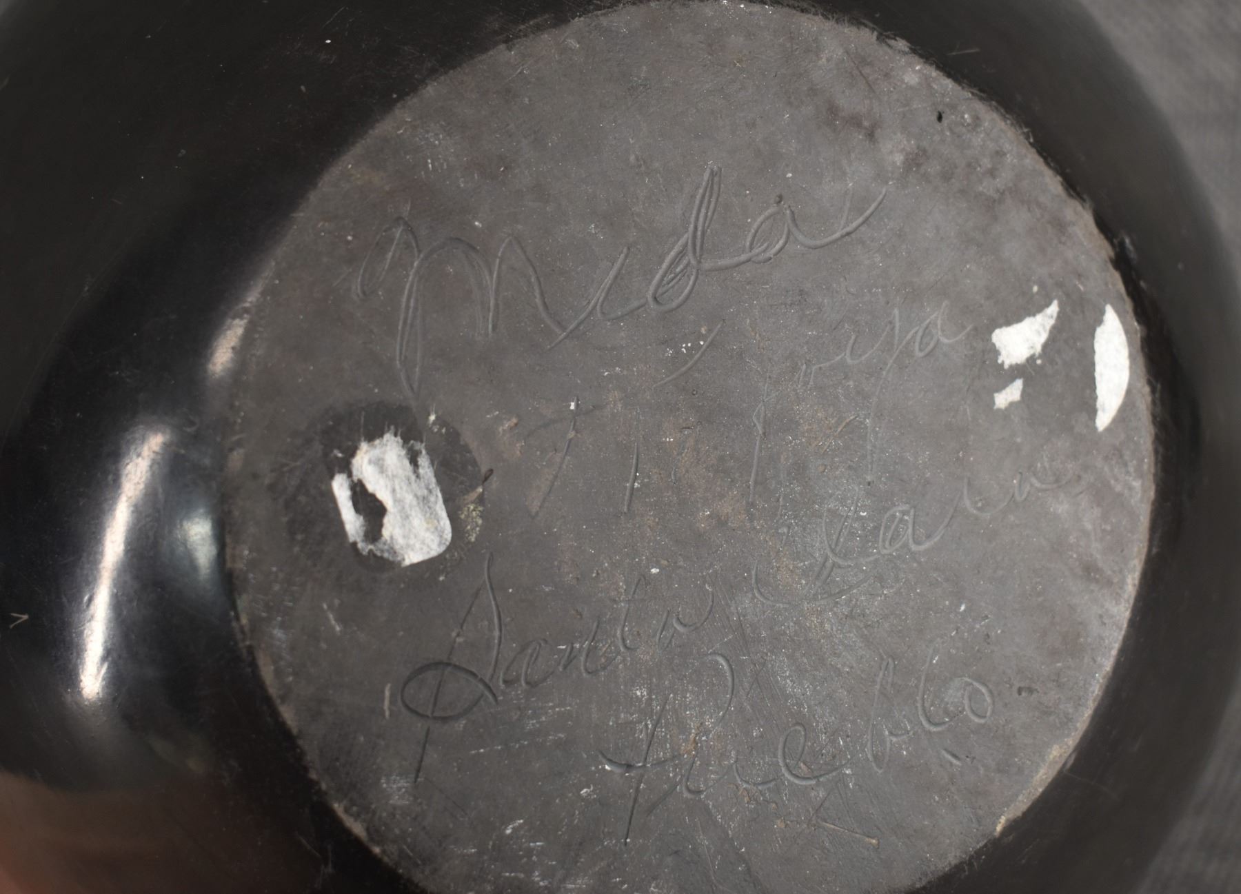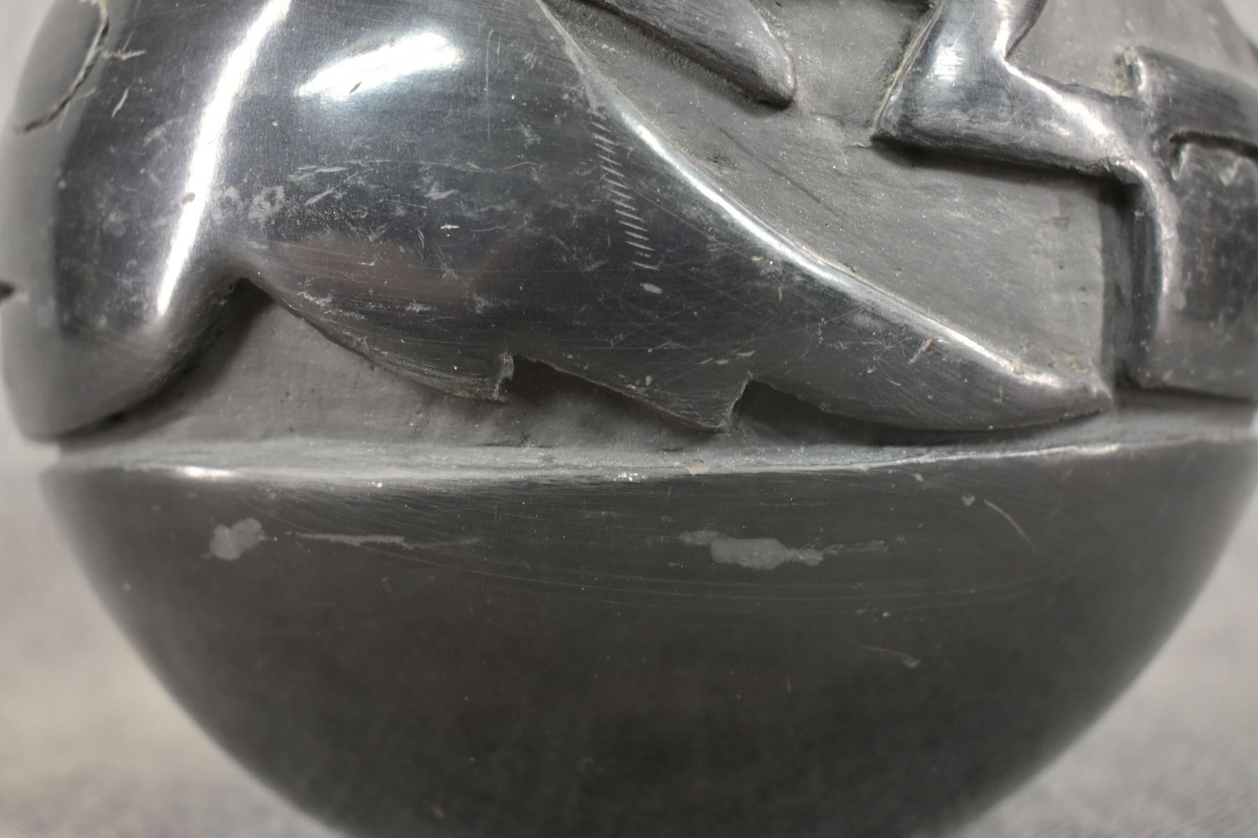 1980's Santa Clara, hand coiled with carved avanyu design signed Mida Tafoya. 6" x 8" has surface damage.