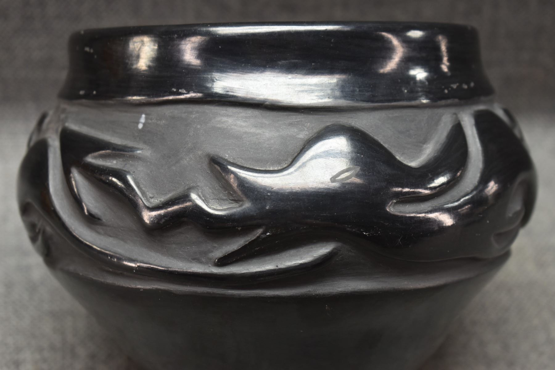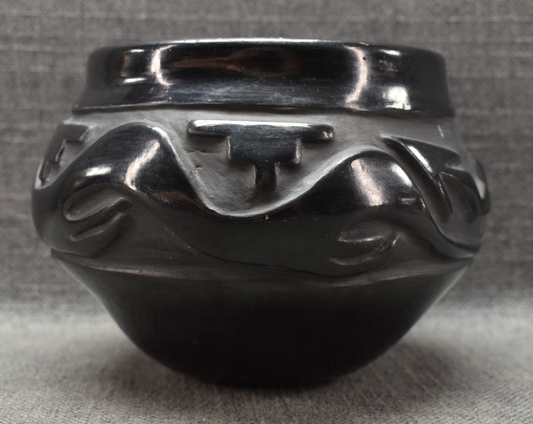 1960's Santa Clara. Hand coiled and carved avanyu design pottery bowl. 5'' x 6''