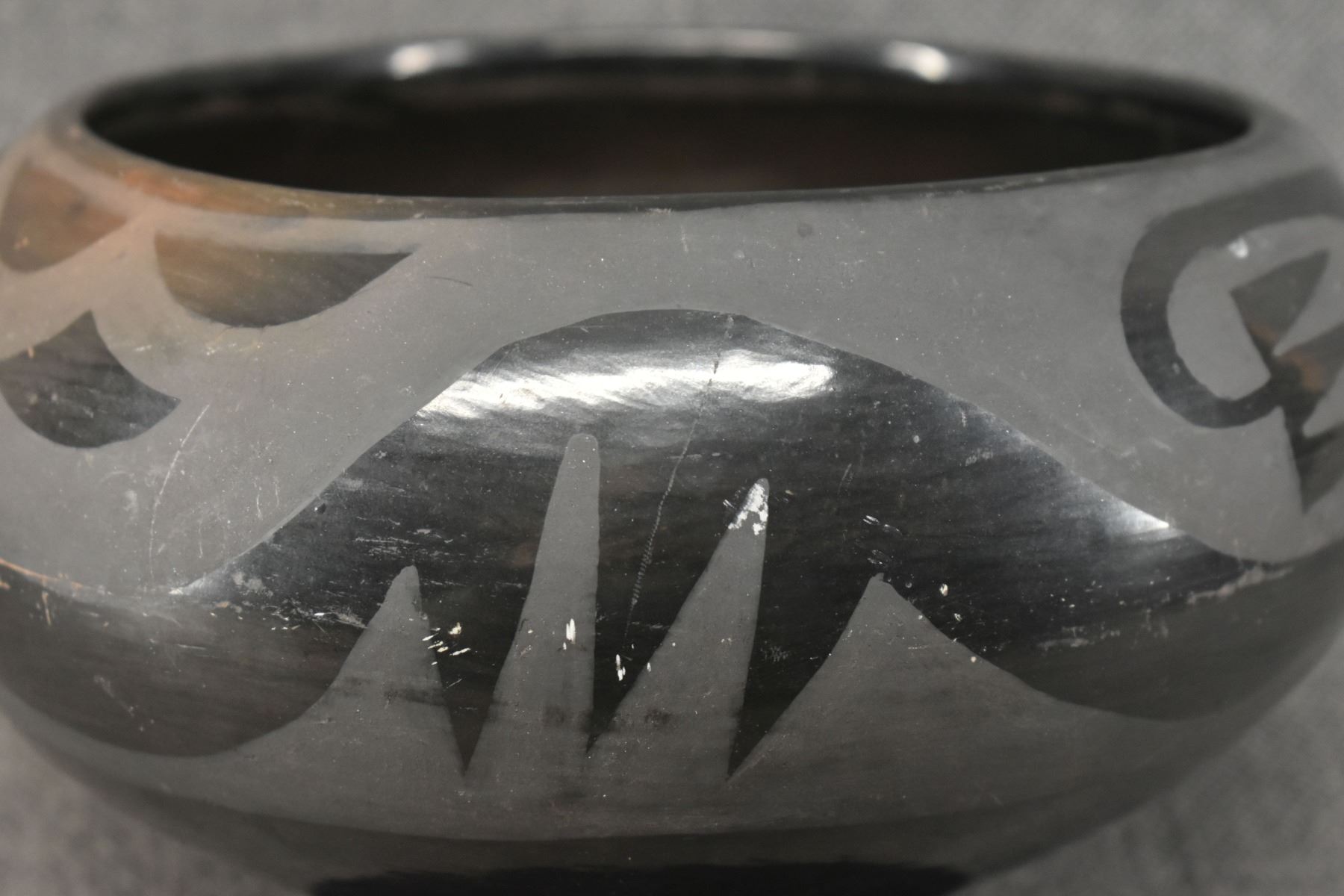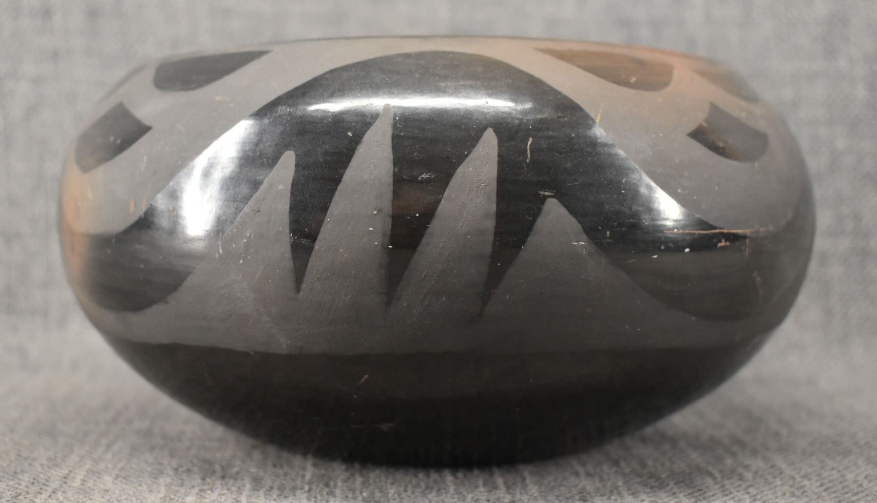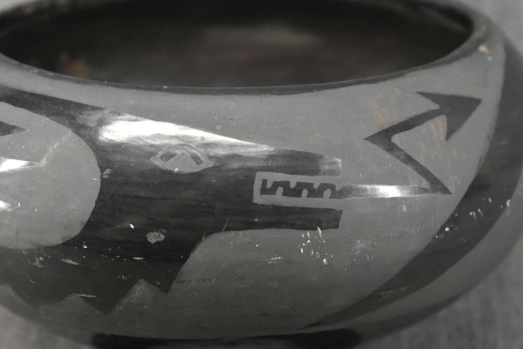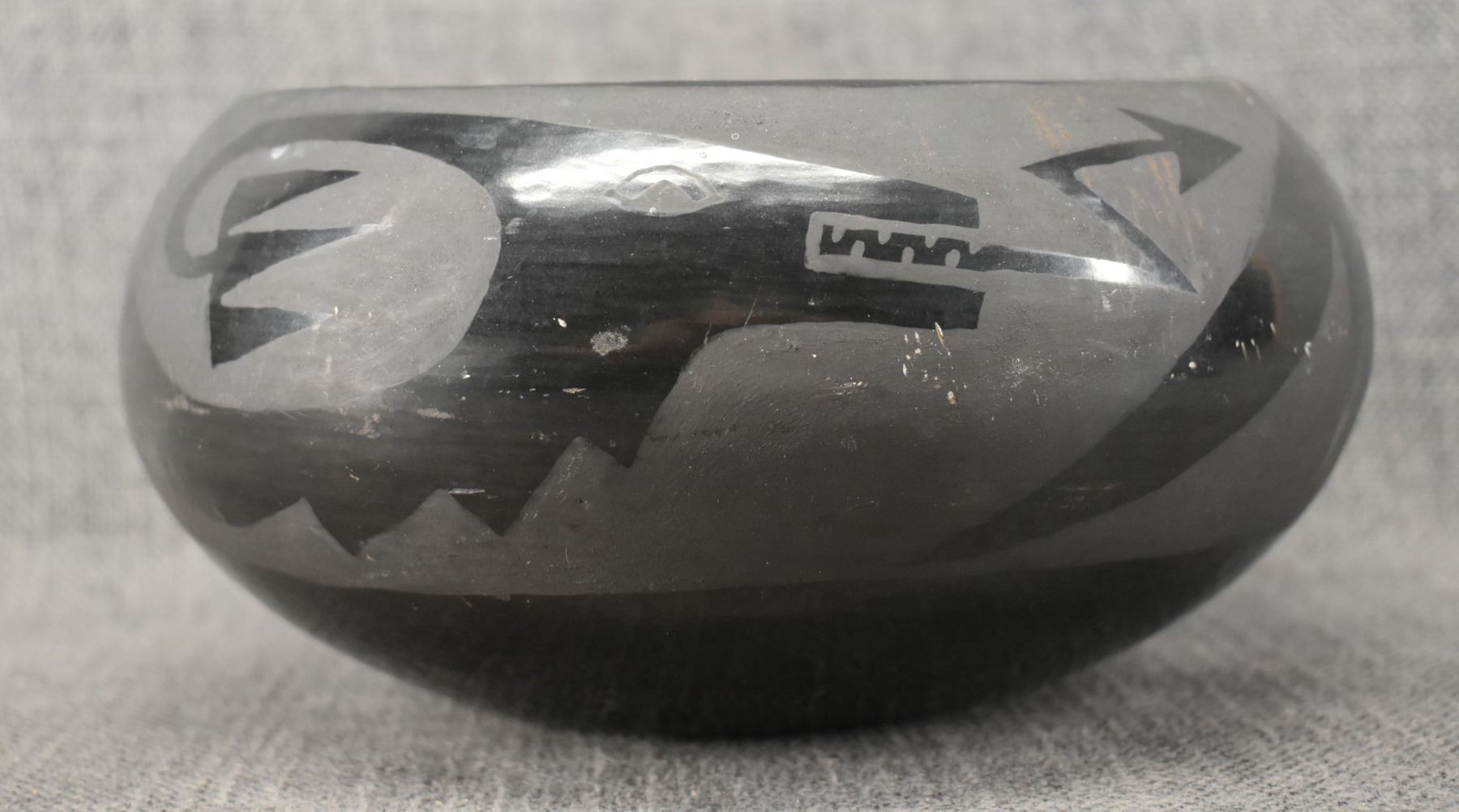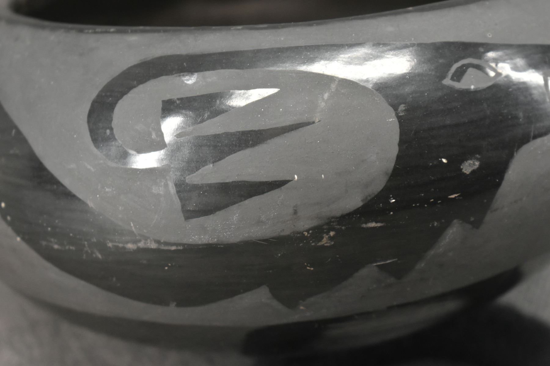1980's Santa Clara, hand coiled with matte on black painted avanyu design 3.75" x 8"
