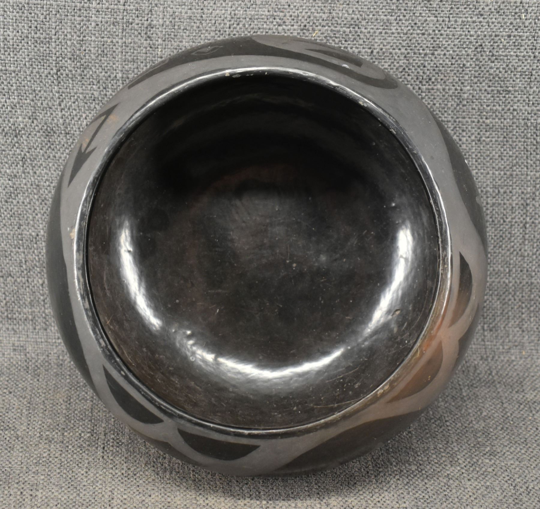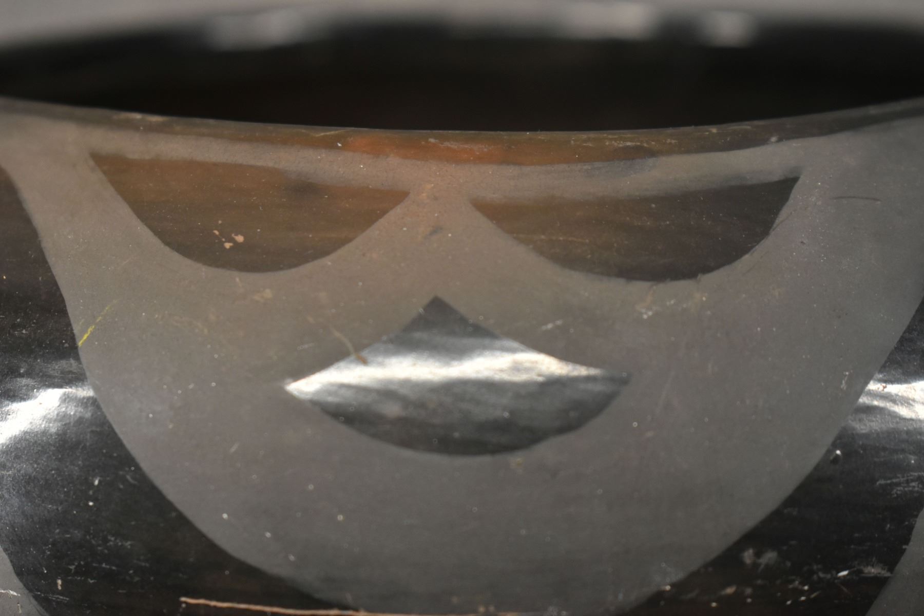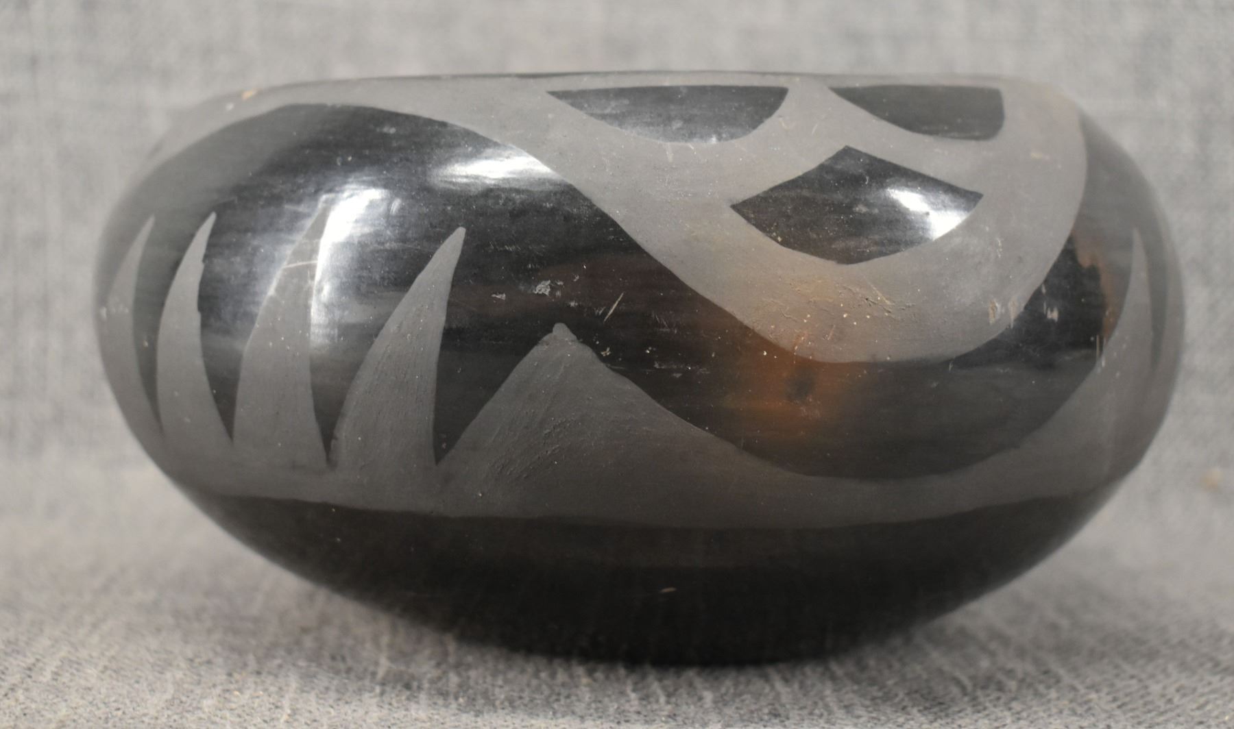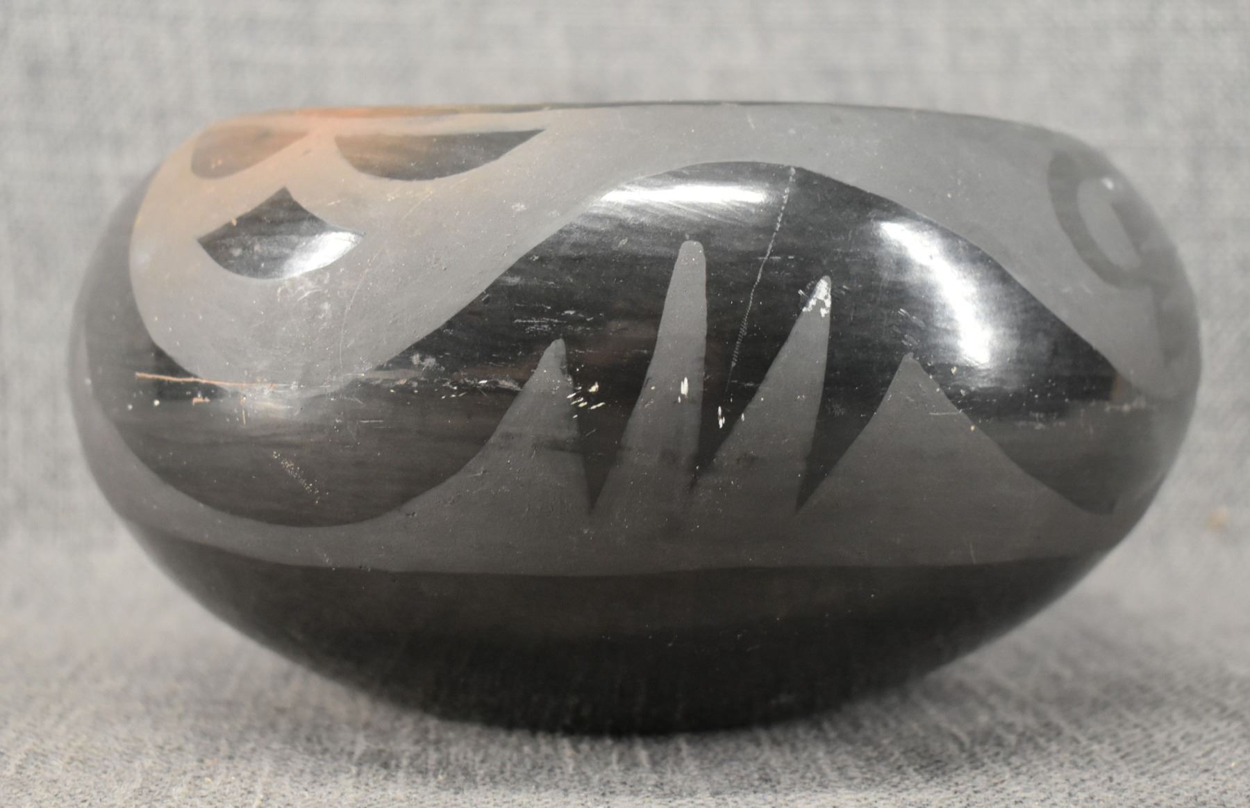 1980's Santa Clara, hand coiled with matte on black painted avanyu design 3.75" x 8"