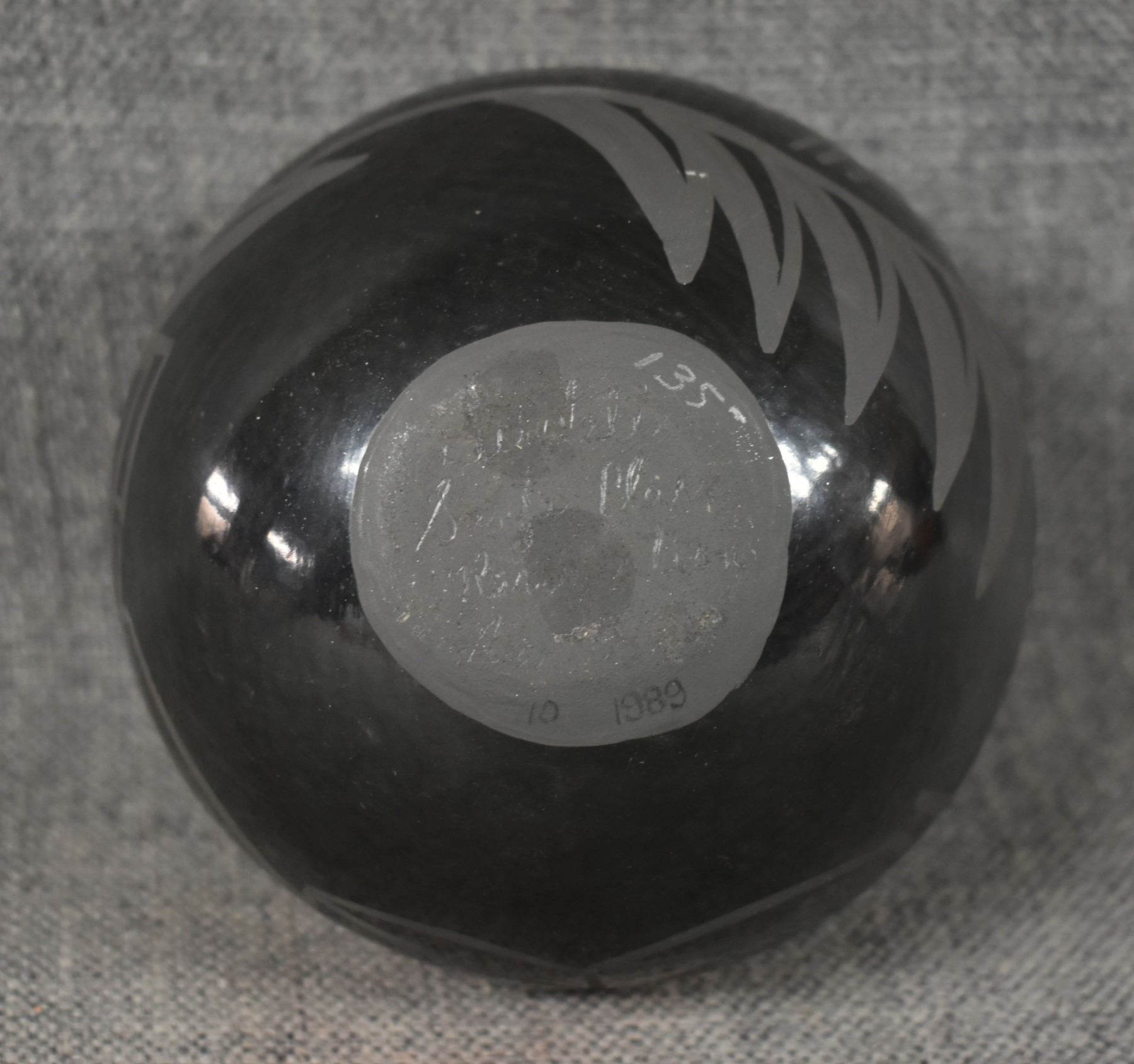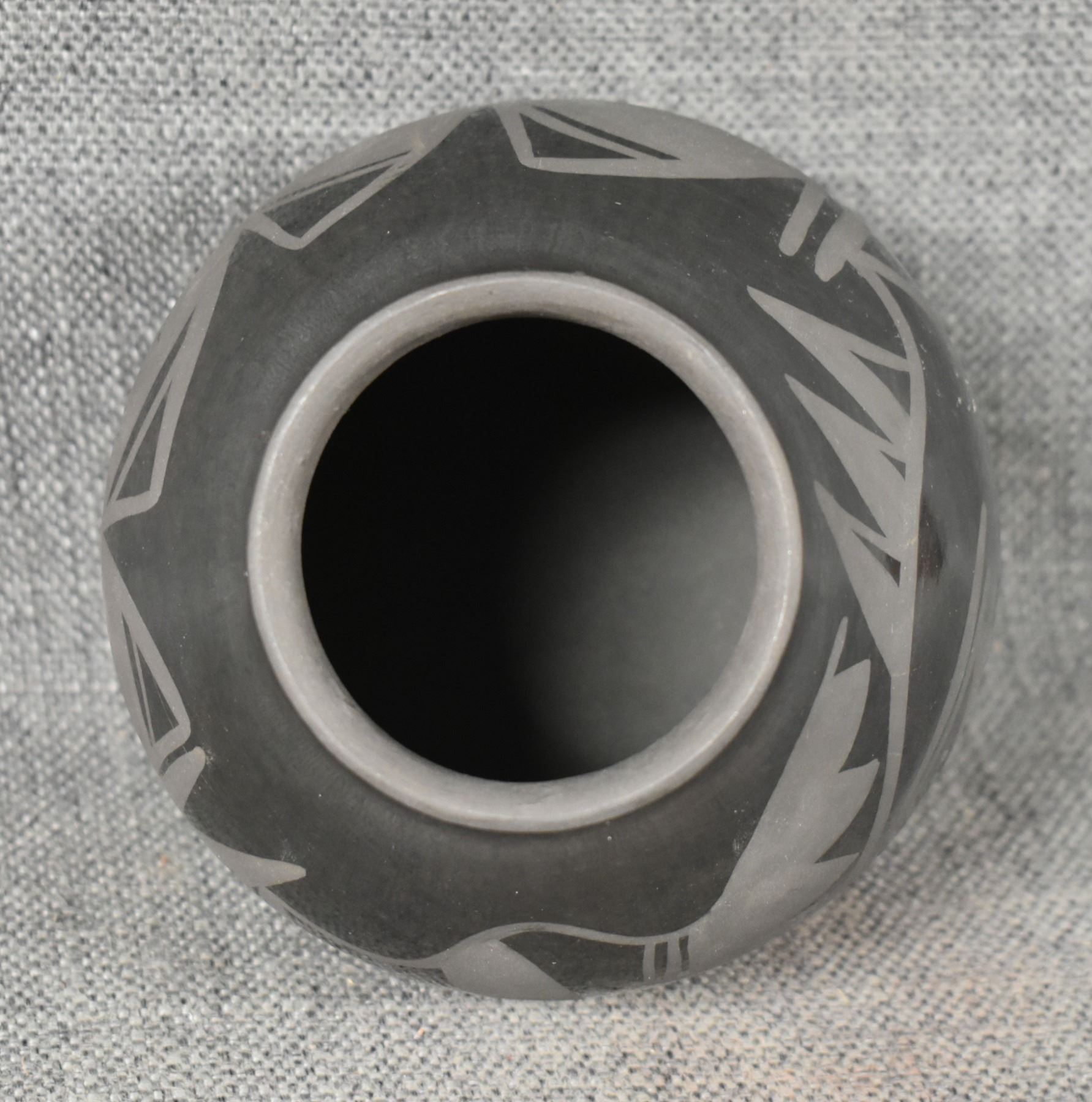 1989 Santa Clara, hand coiled with matte on black painted geometric design by Birdell, 4.5" x 4.5"