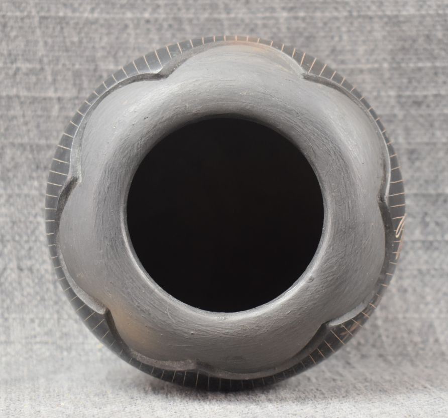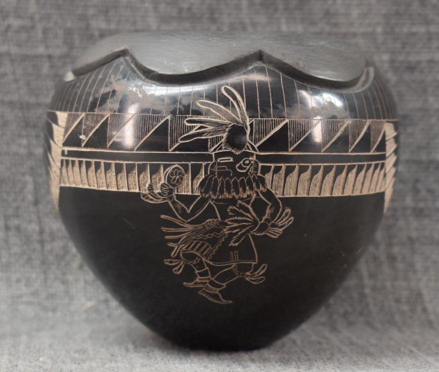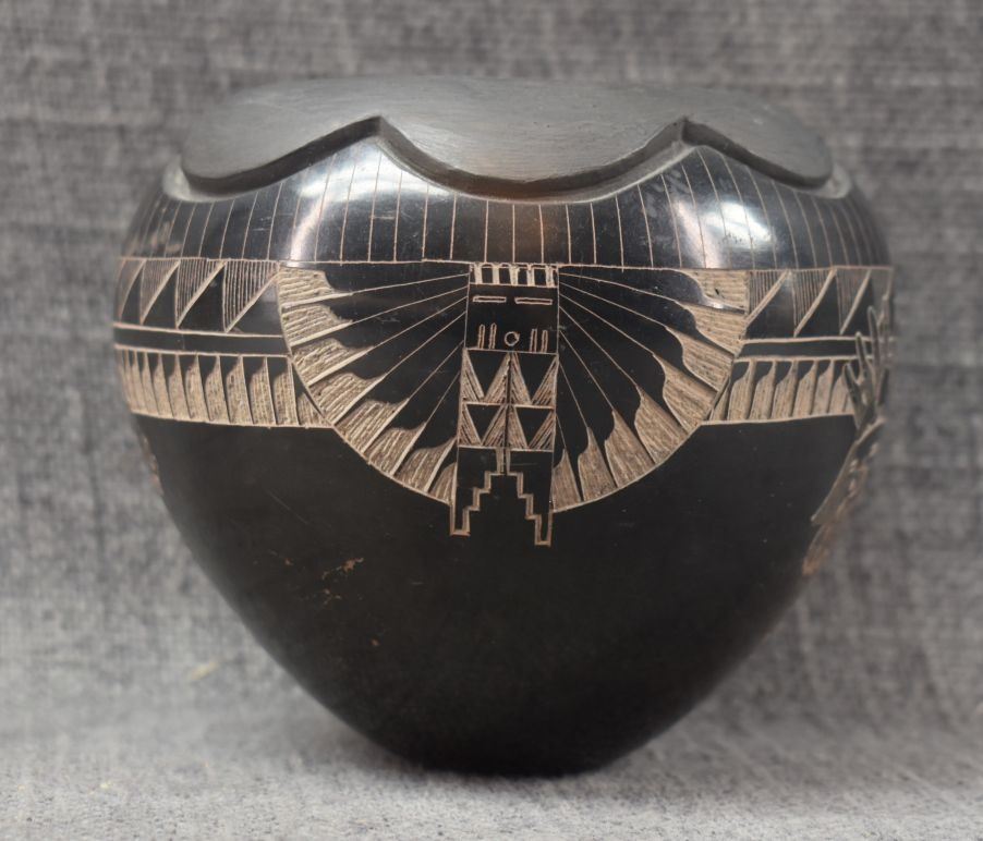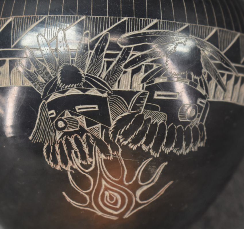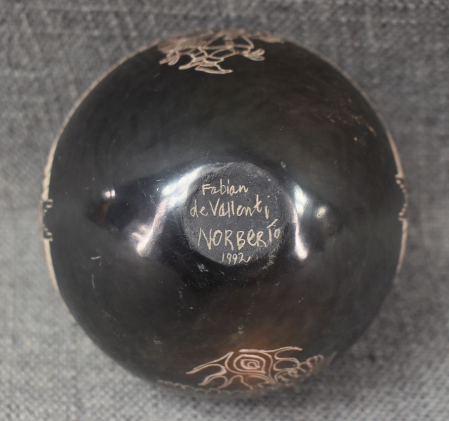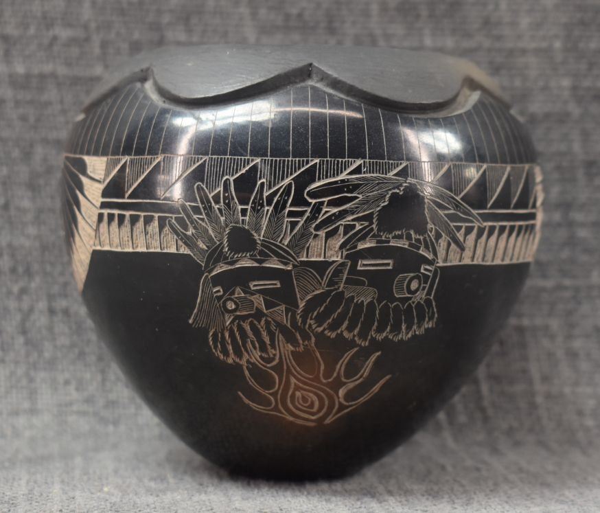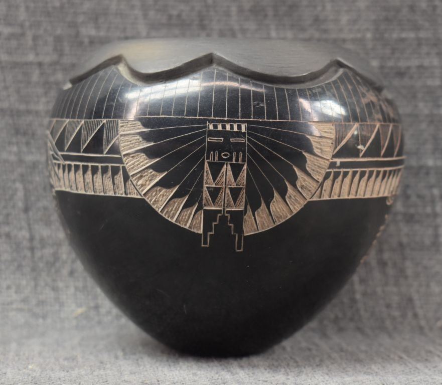 1992 Santa Clara, hand coiled with sgraffito kachina feather and geometric design with carved rim by Fabian de Vallenti Norberto 3.5" x 4"