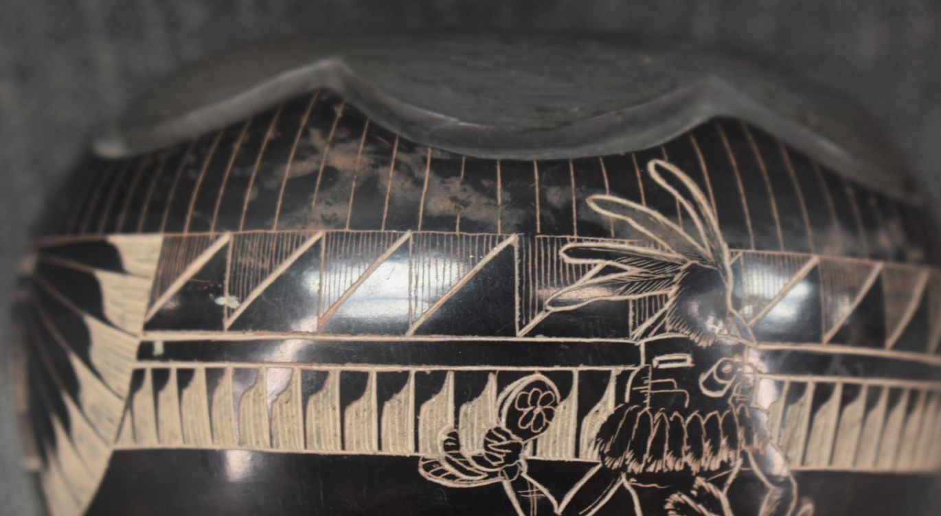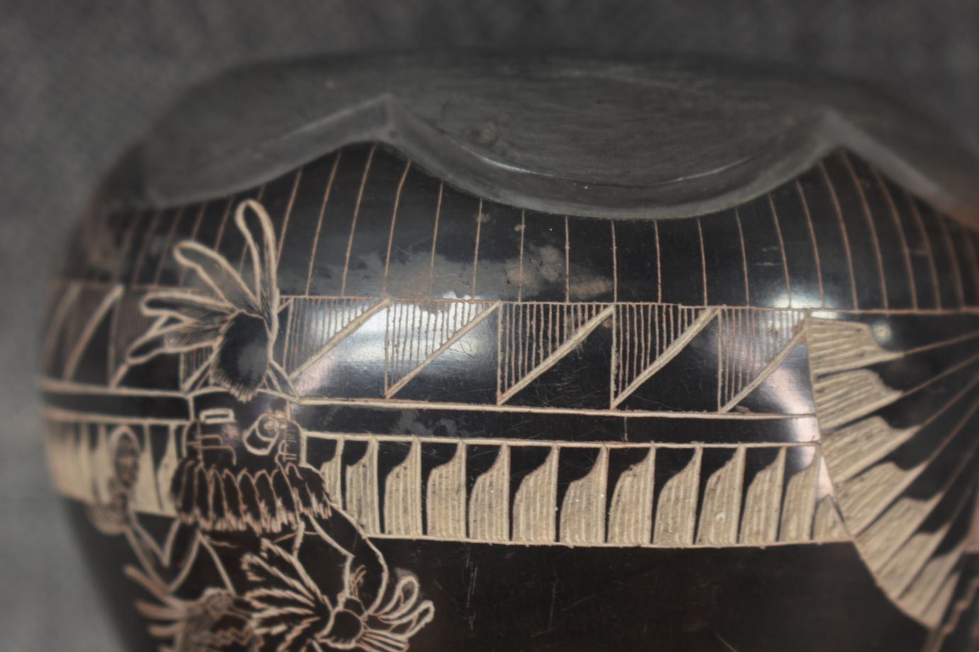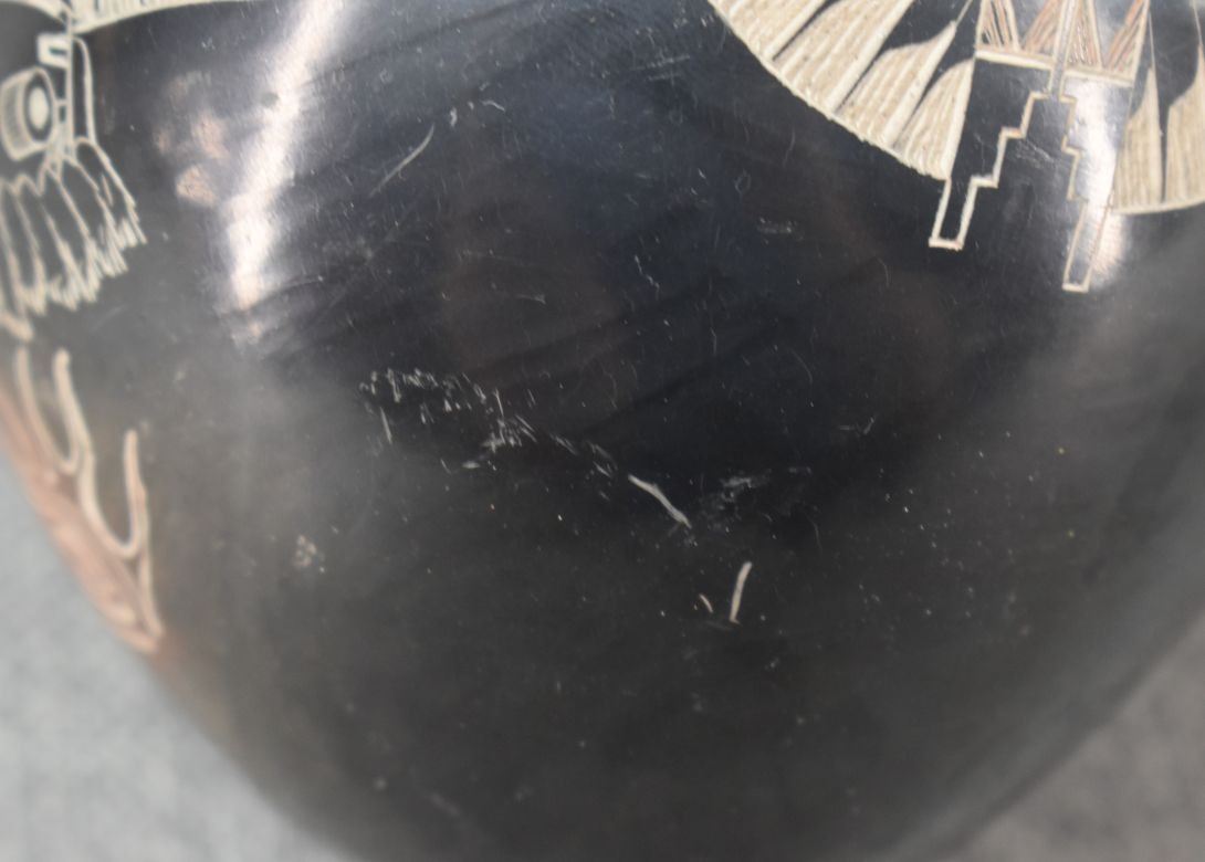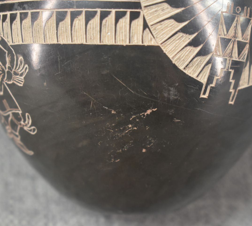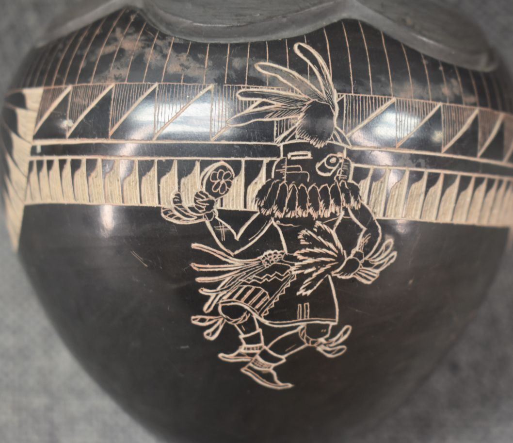 1992 Santa Clara, hand coiled with sgraffito kachina feather and geometric design with carved rim by Fabian de Vallenti Norberto 3.5" x 4"