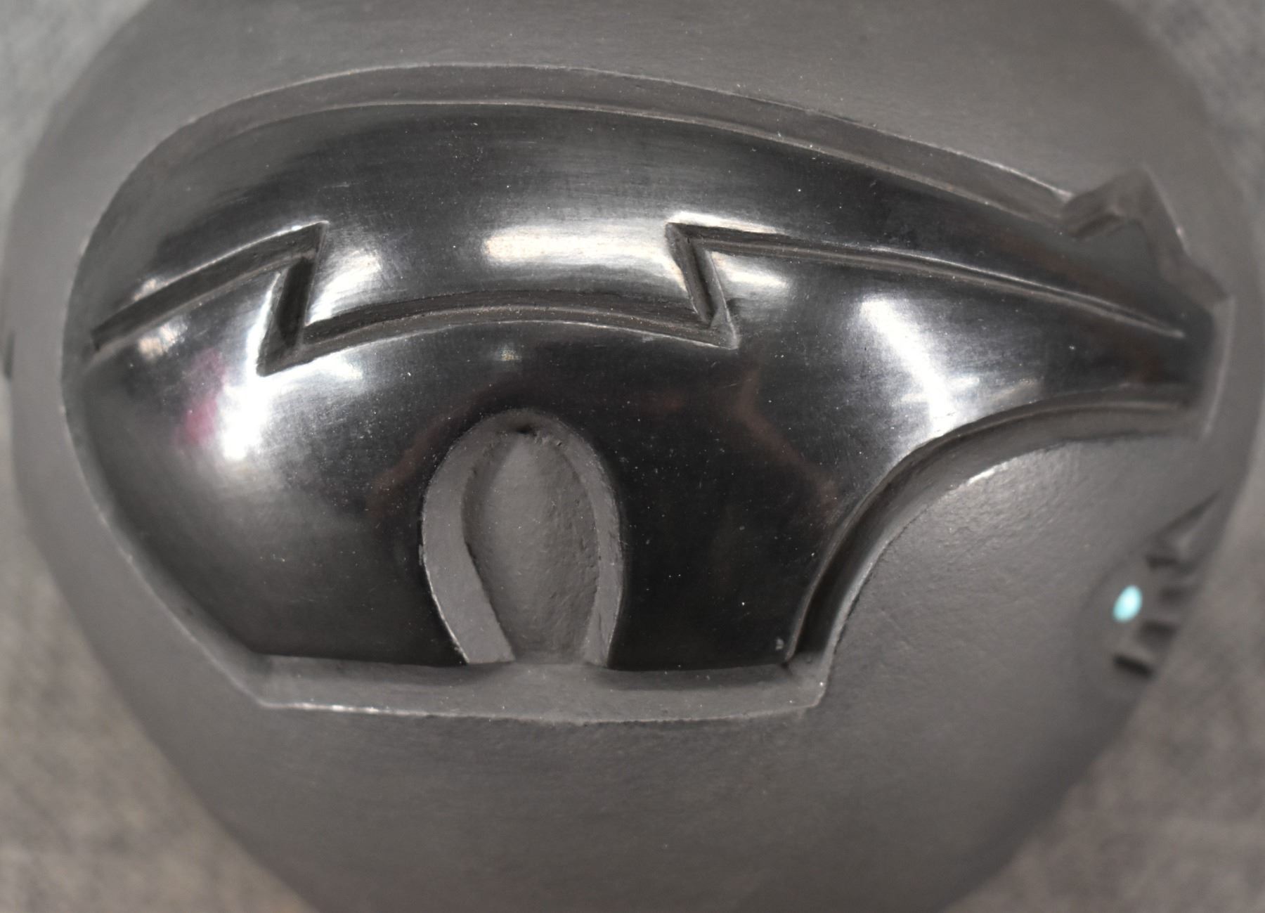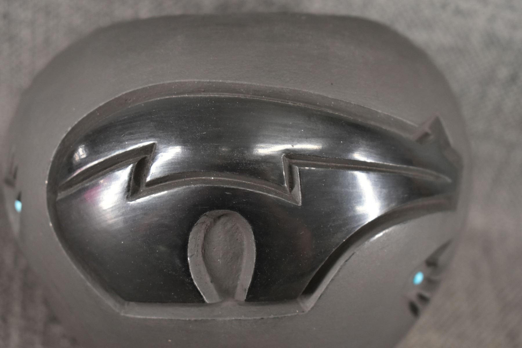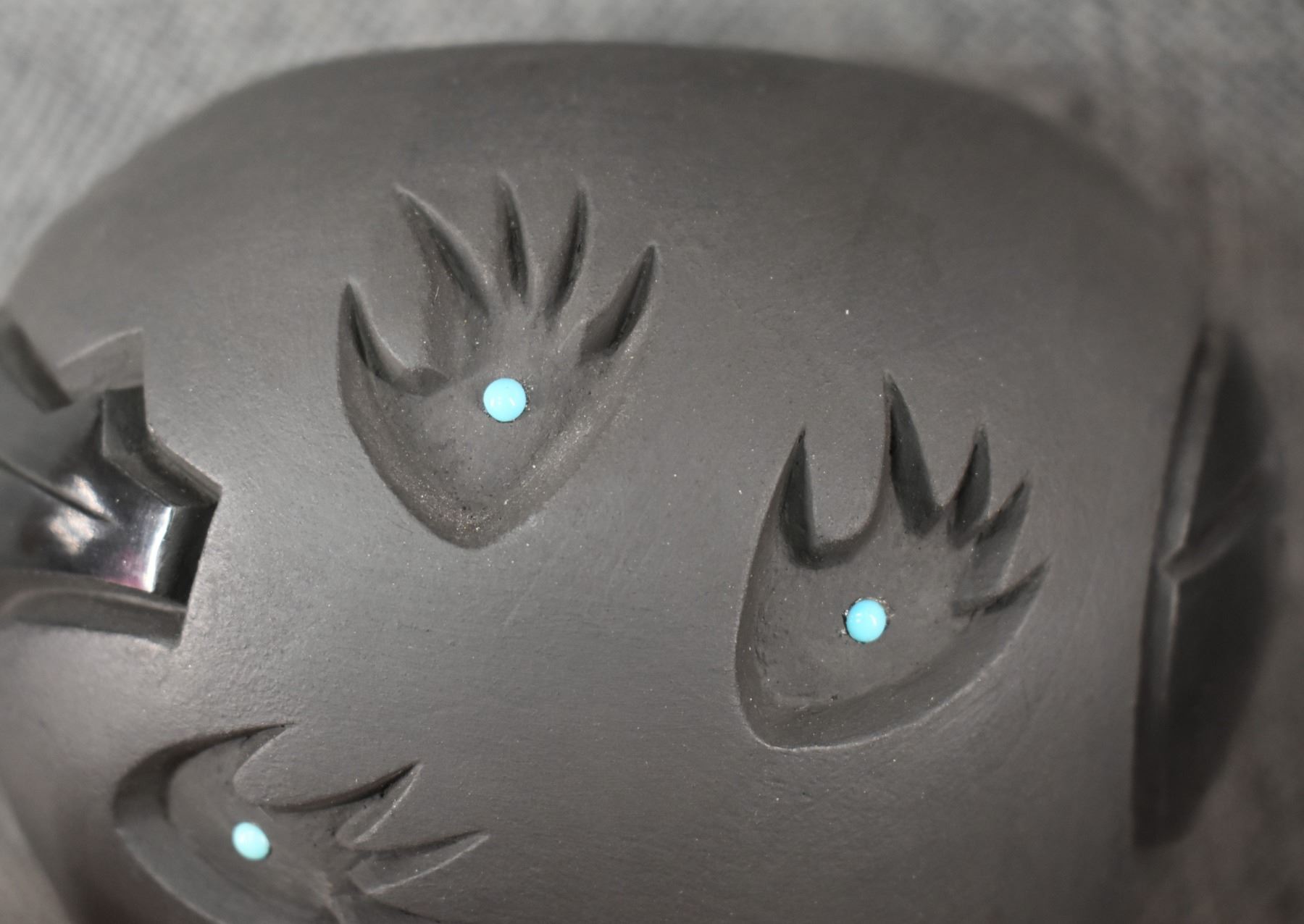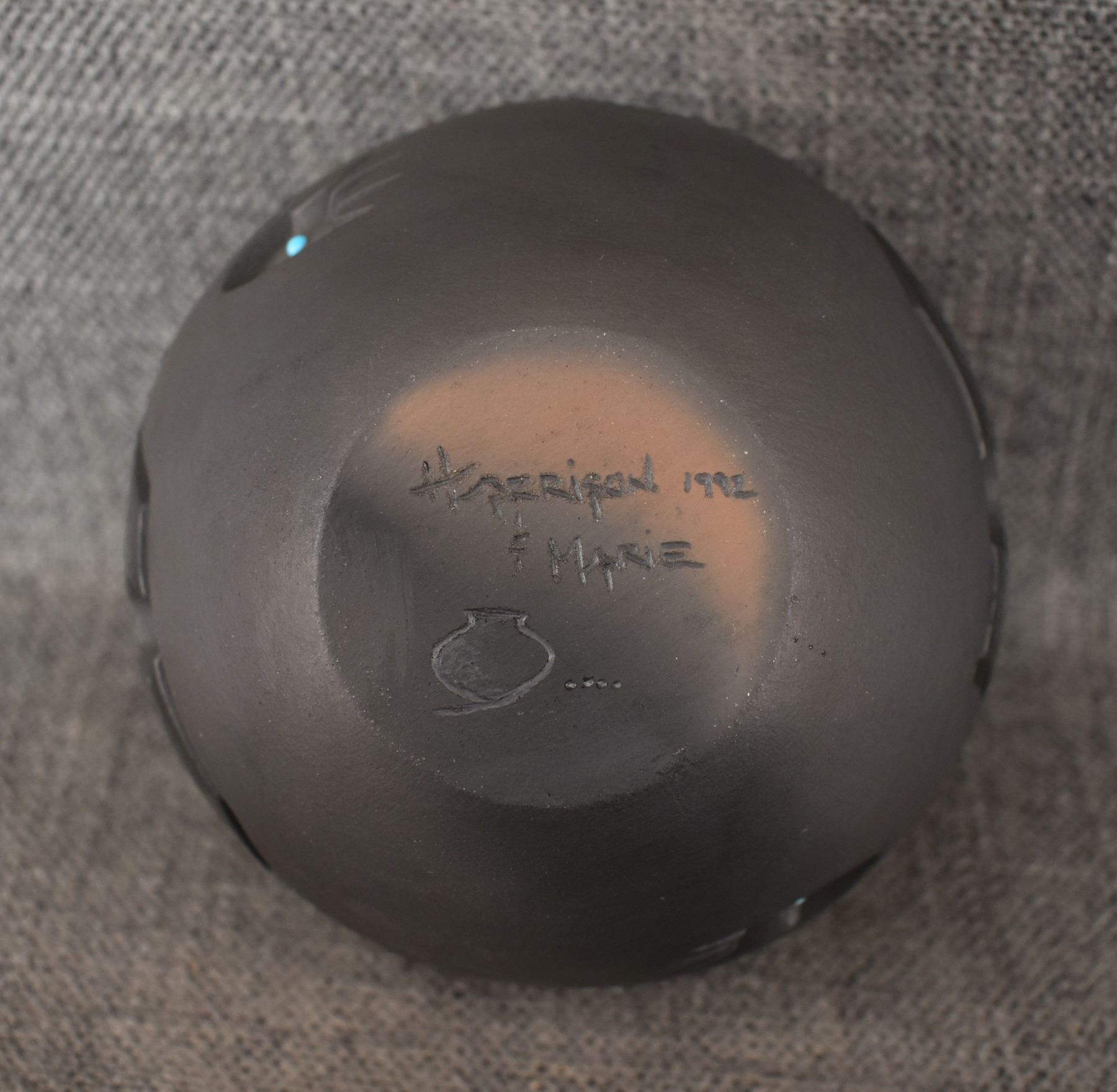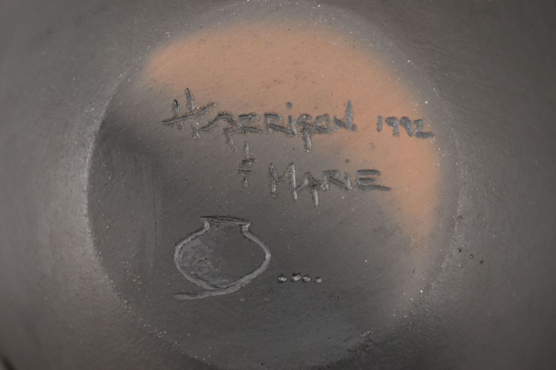 1992 Santa Clara. hand carved design depicting Kokopelli signed Harrison and Marie. 4'' x 5''