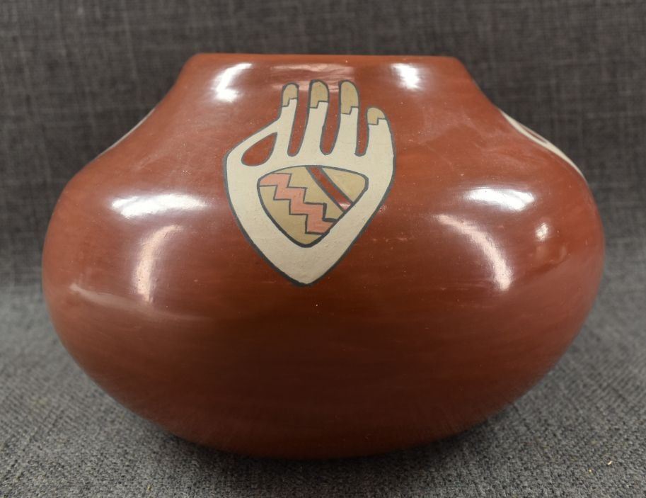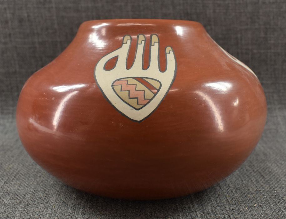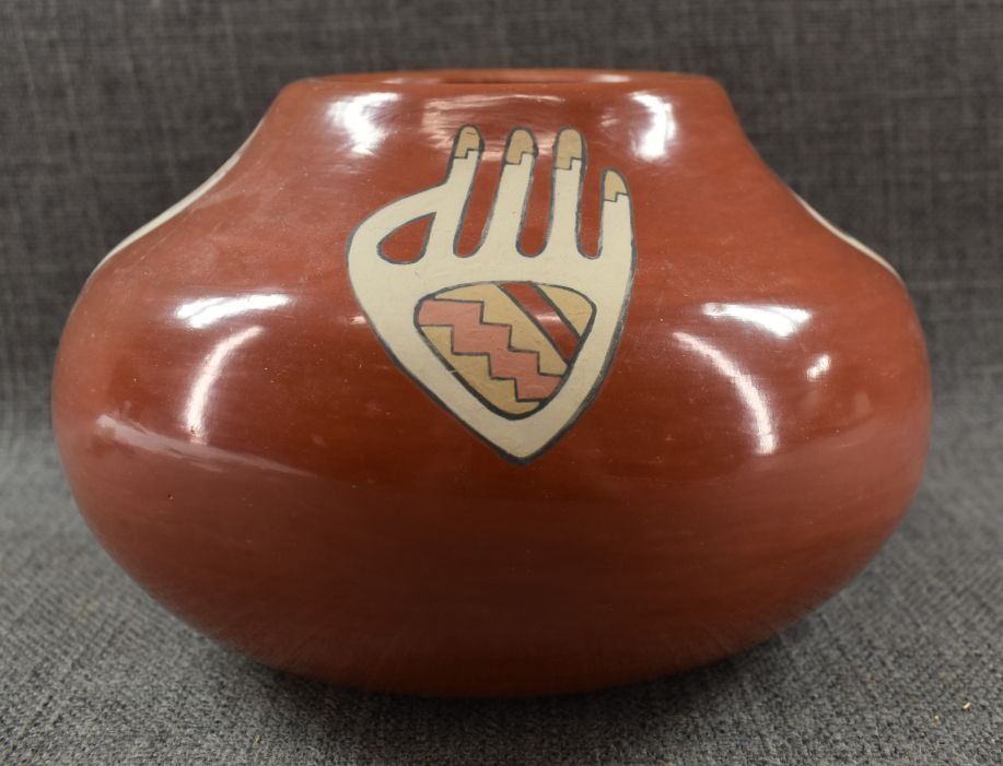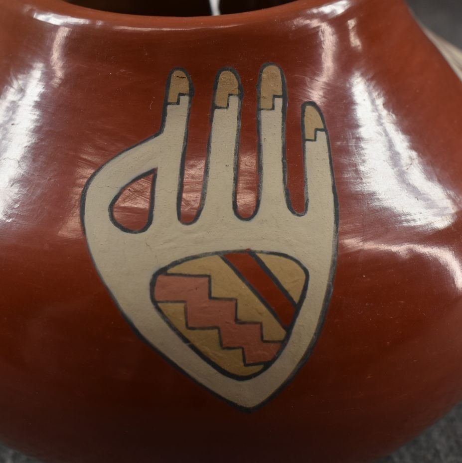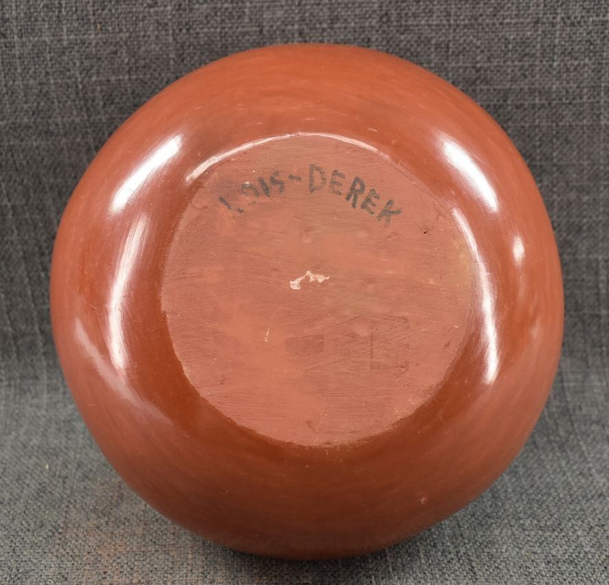 1970's Santa Clara. Hand coiled and painted polychrome design, signed Lois & Derek. 5'' x 8''