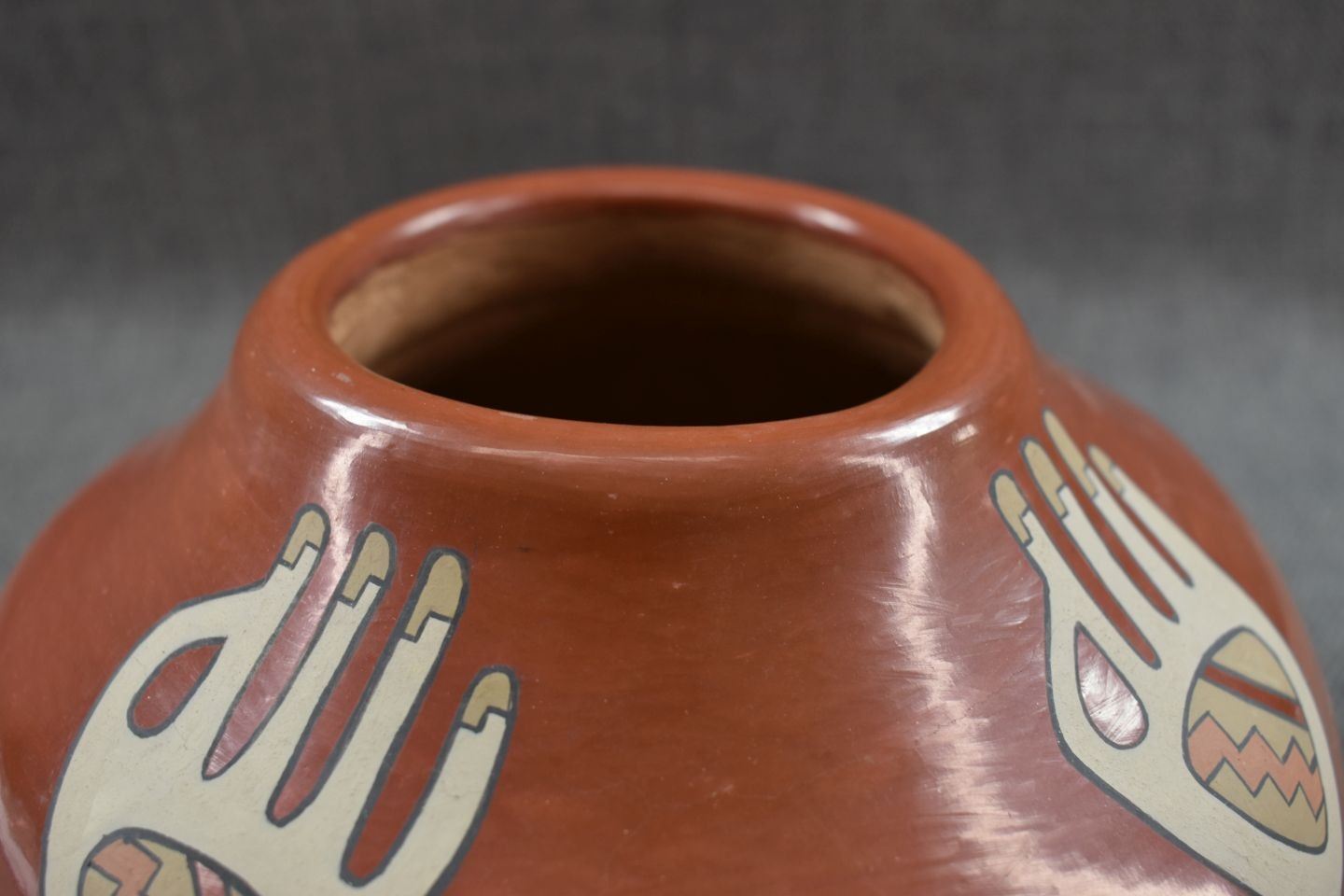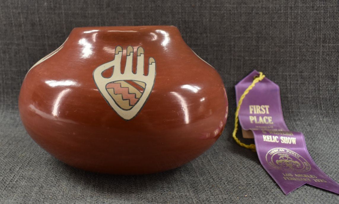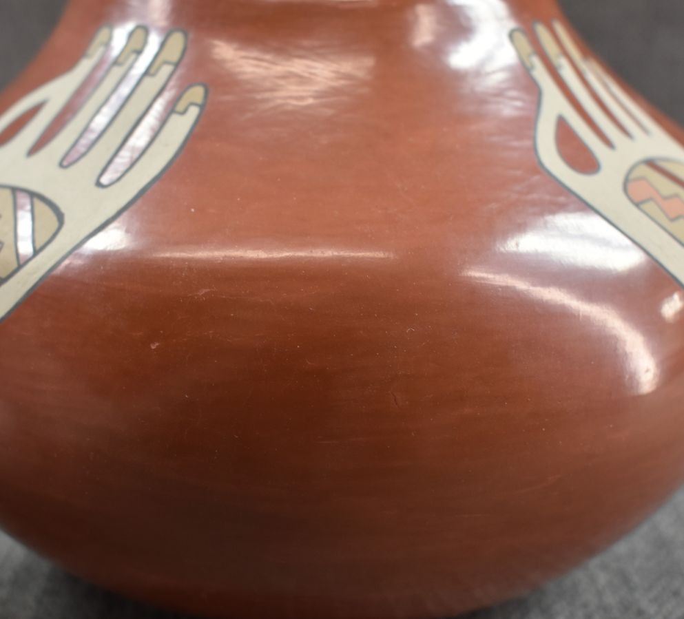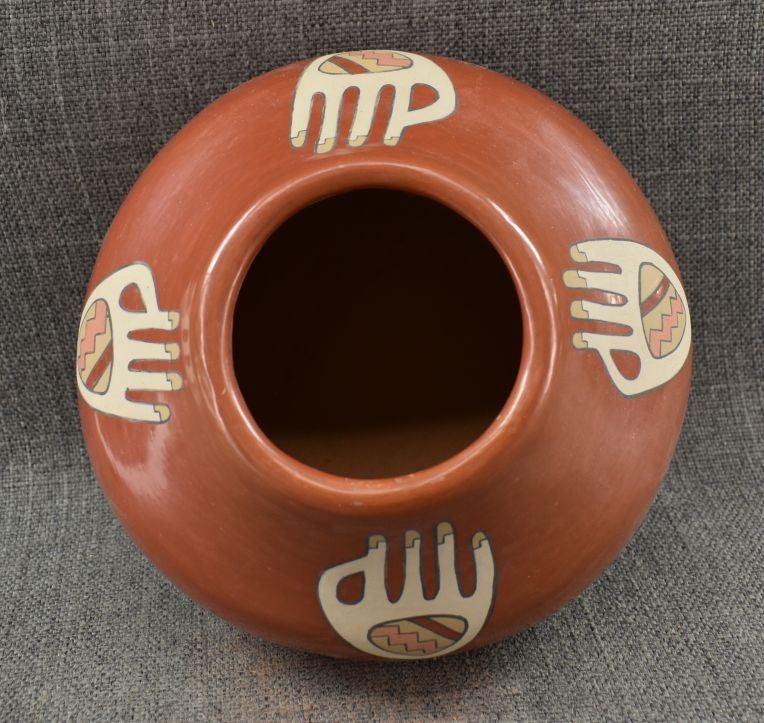 1970's Santa Clara. Hand coiled and painted polychrome design, signed Lois & Derek. 5'' x 8''