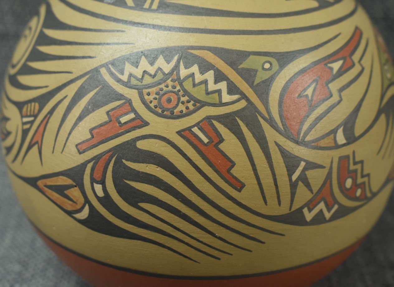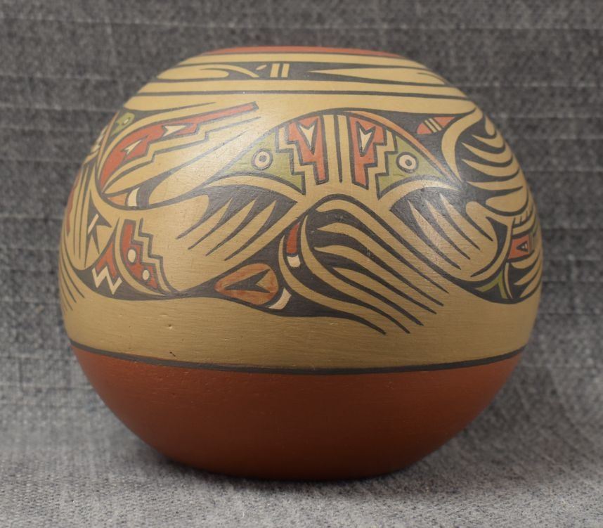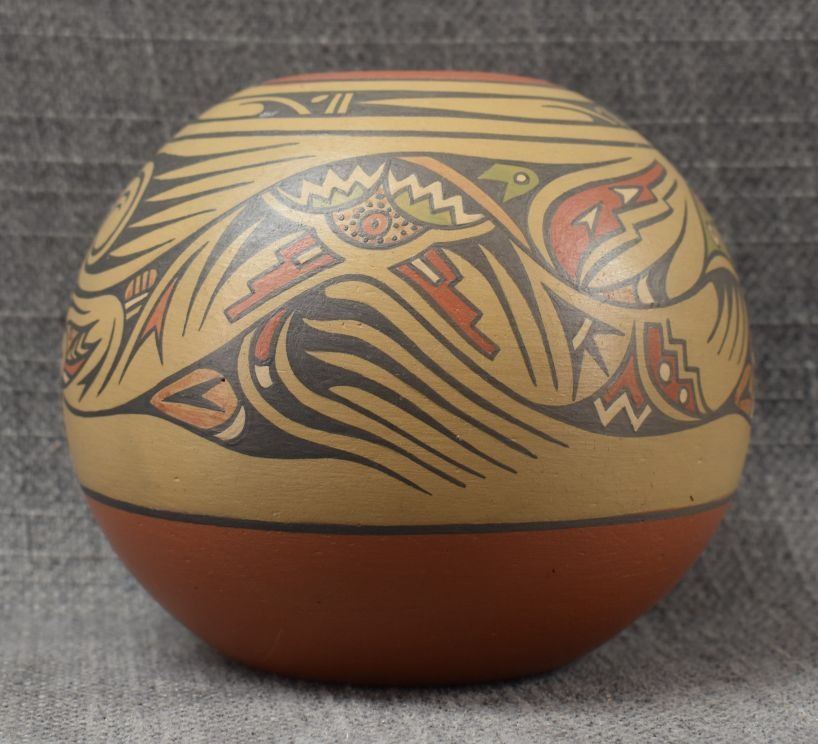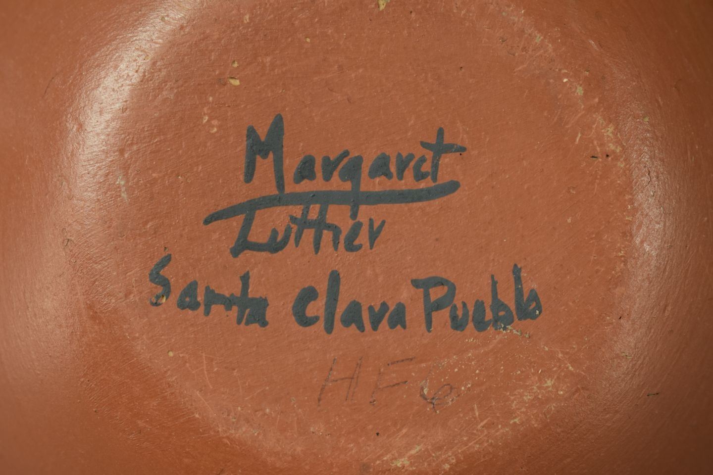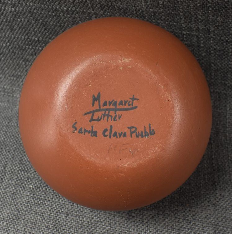 1980's Santa Clara, hand coiled with polychrome painted avanyu design by Margaret and Luther 4.25" x 5"