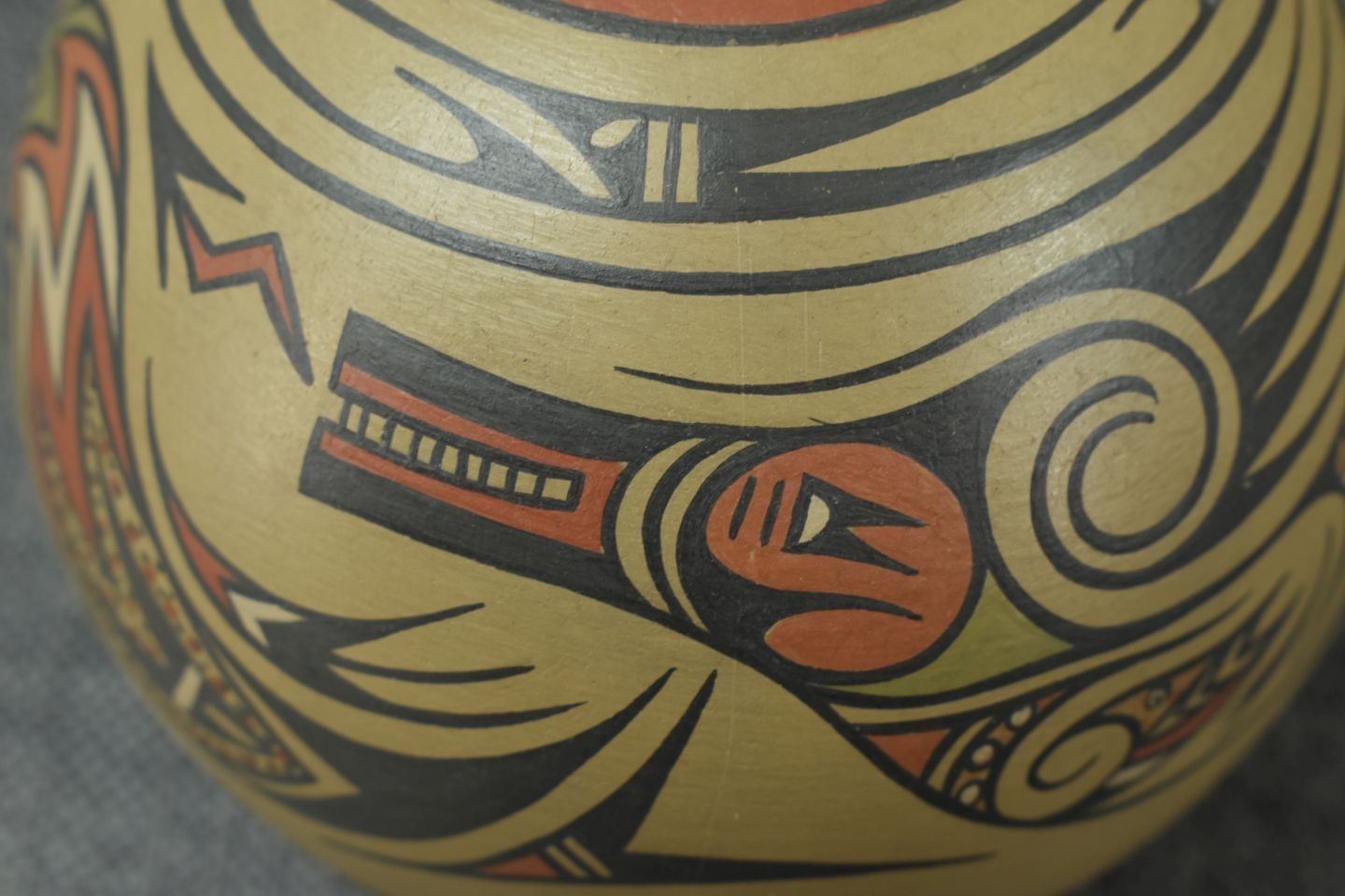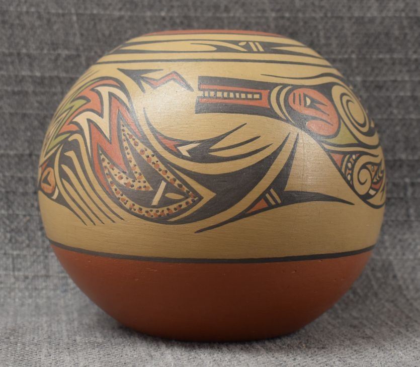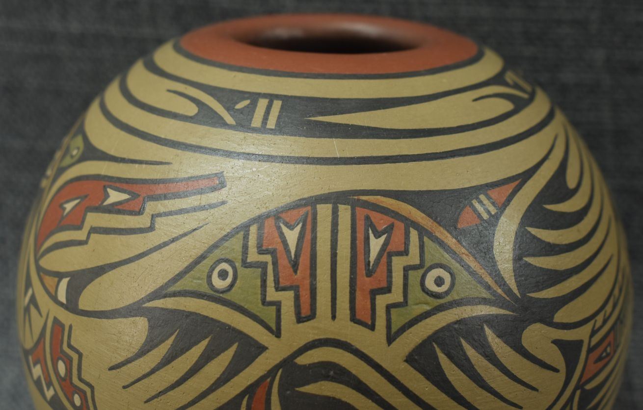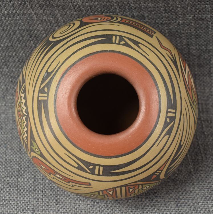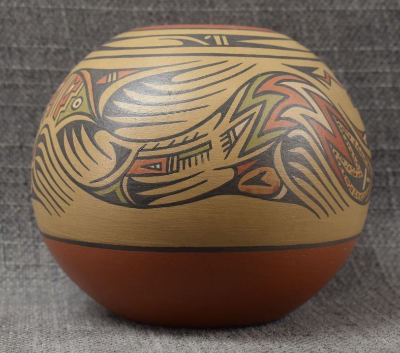 1980's Santa Clara, hand coiled with polychrome painted avanyu design by Margaret and Luther 4.25" x 5"