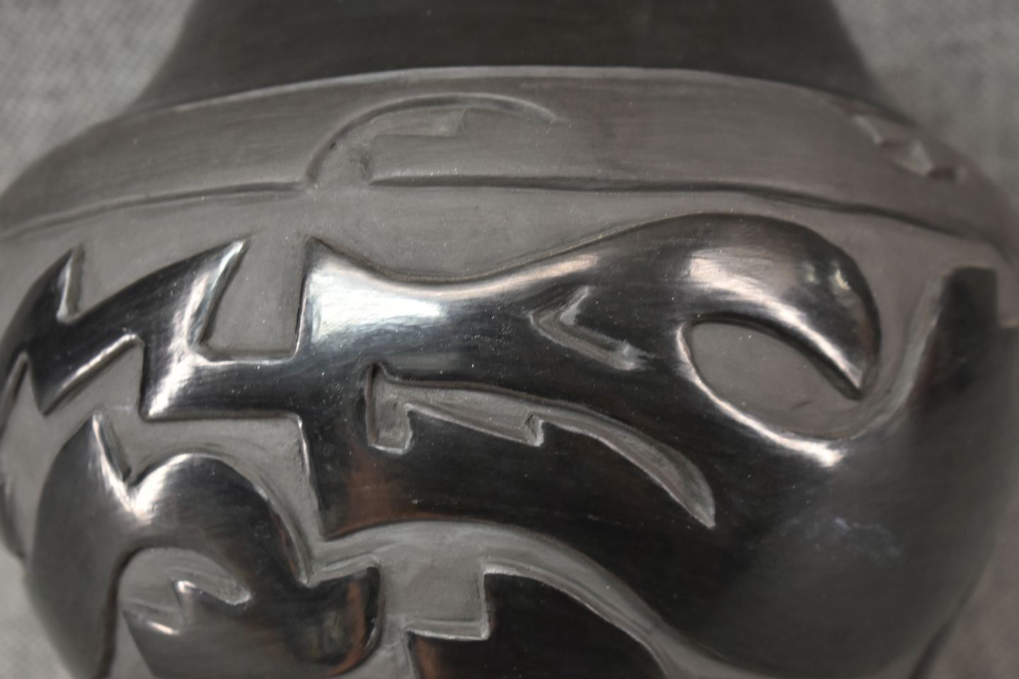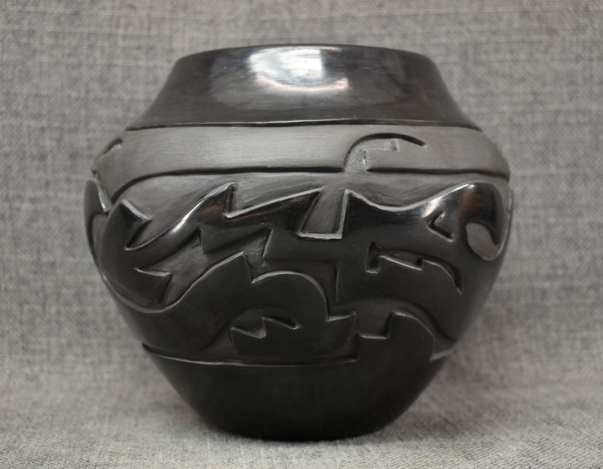 1980's Santa Clara, hand coiled with carved avanyu design signed Sharon Naranjo Garcia 6.25" x 7"