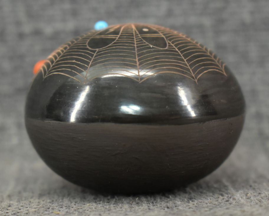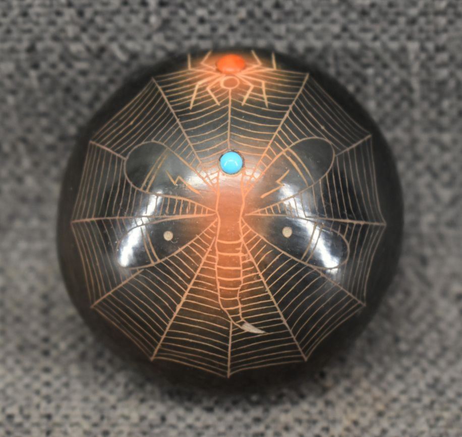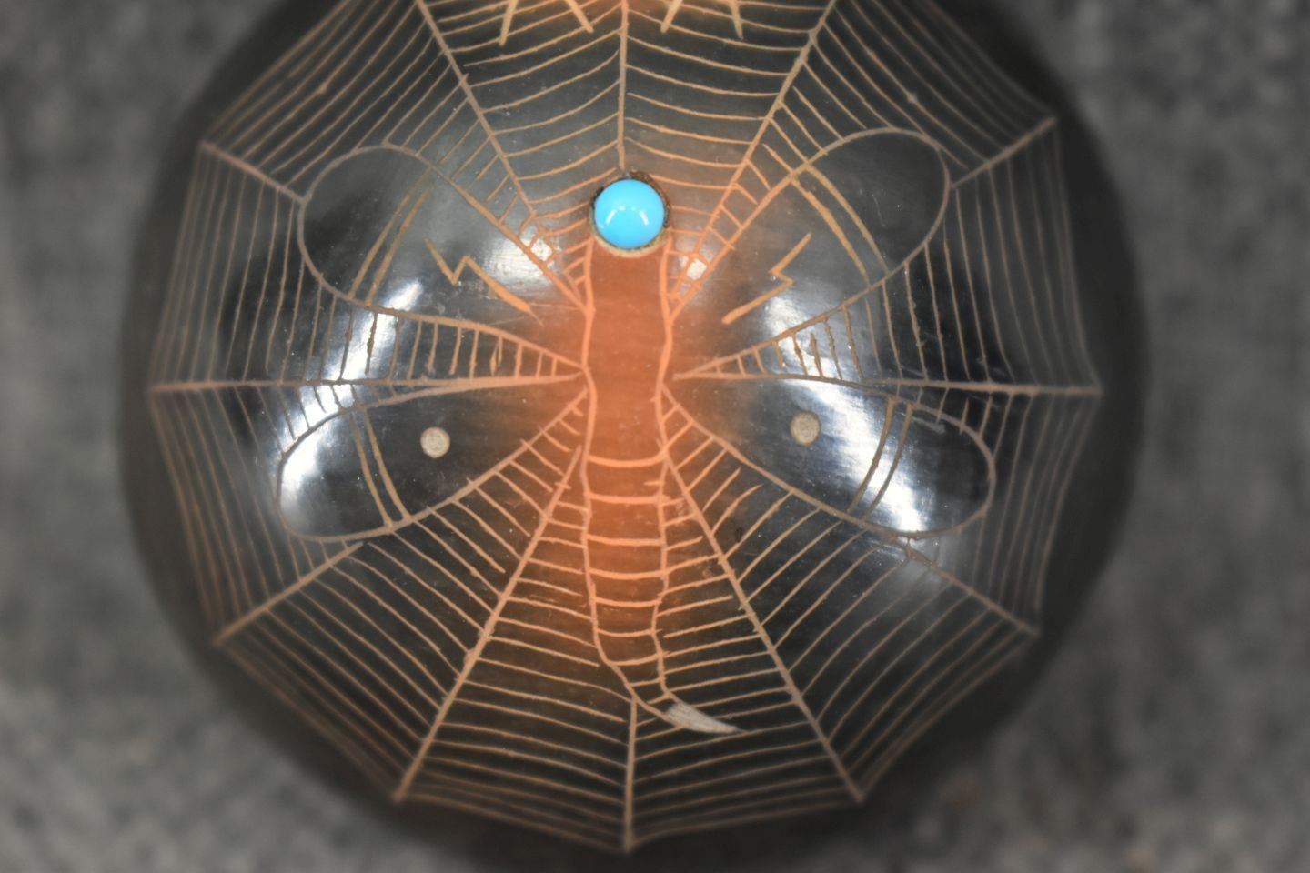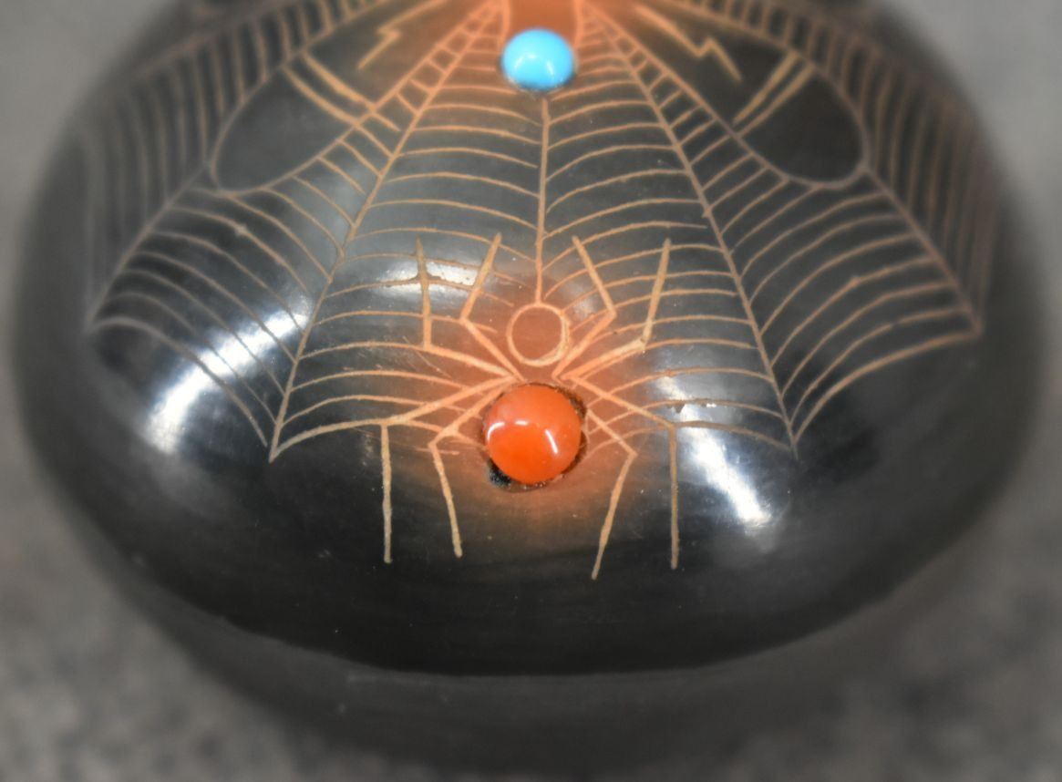 1970-80's Santa Clara, hand coiled with incised dragonfly and spider design with inlaid turquoise and coral signed Than-Moo-Whe for Barbara Gonzales 1.5" x 2"