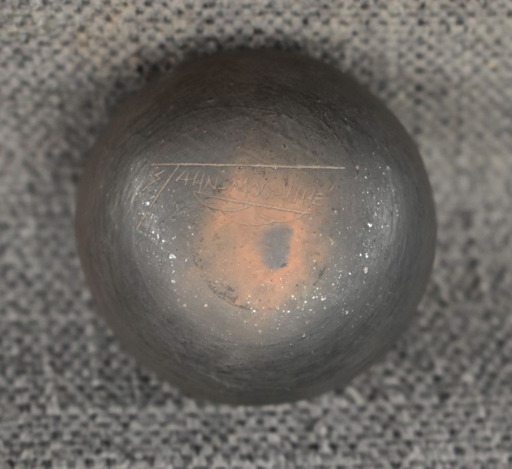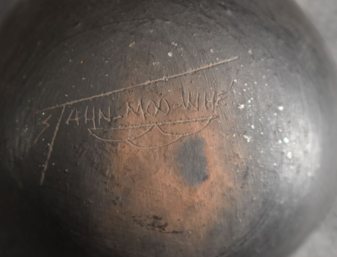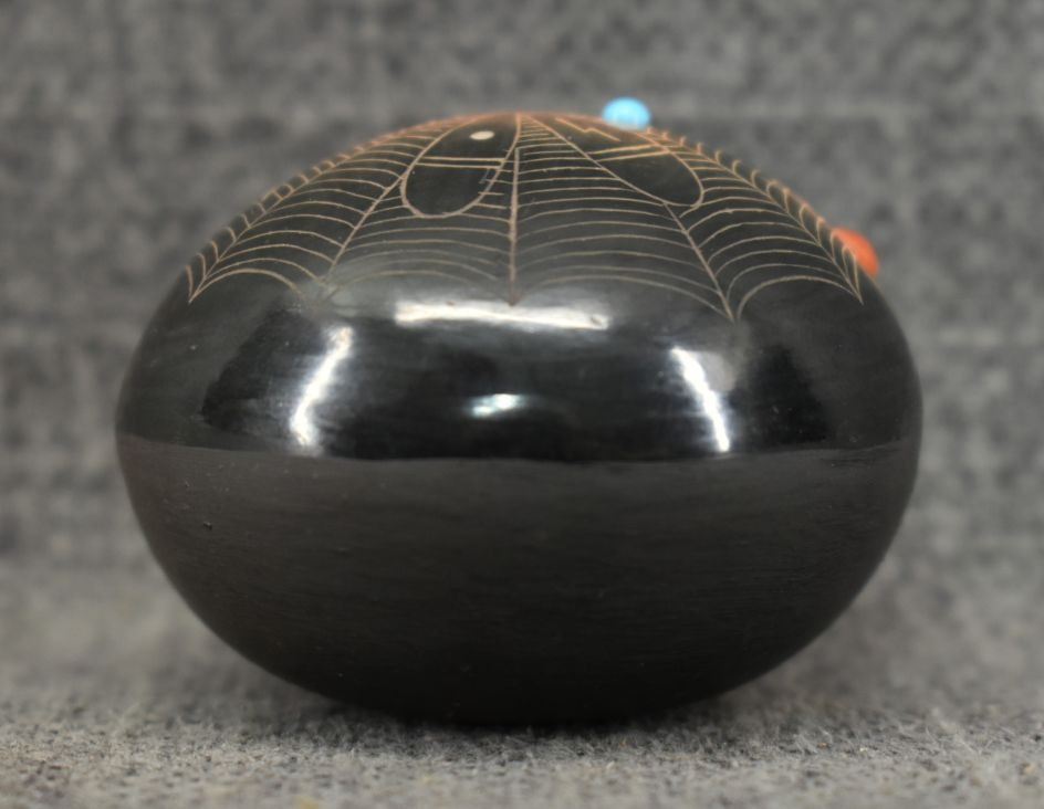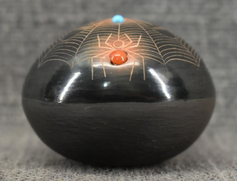 1970-80's Santa Clara, hand coiled with incised dragonfly and spider design with inlaid turquoise and coral signed Than-Moo-Whe for Barbara Gonzales 1.5" x 2"