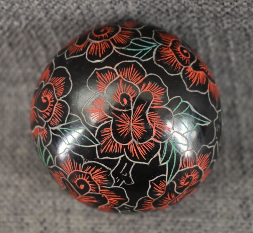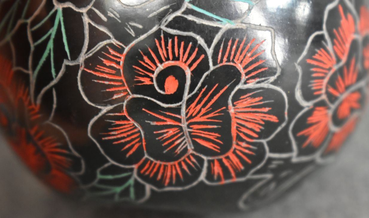 1990-2000's Santa Clara, hand coiled and painted with sgraffito floral design signed Bernice Moquino 2.25" x 2.5"