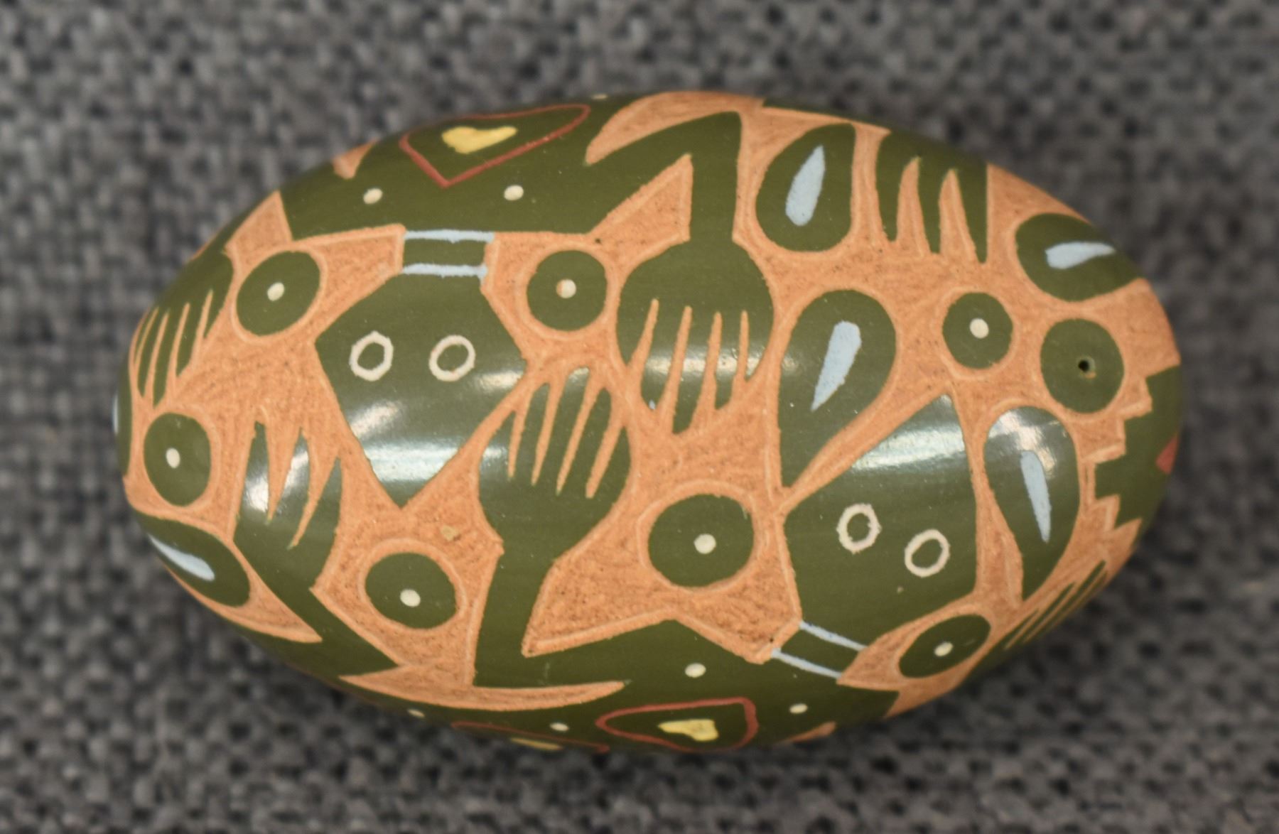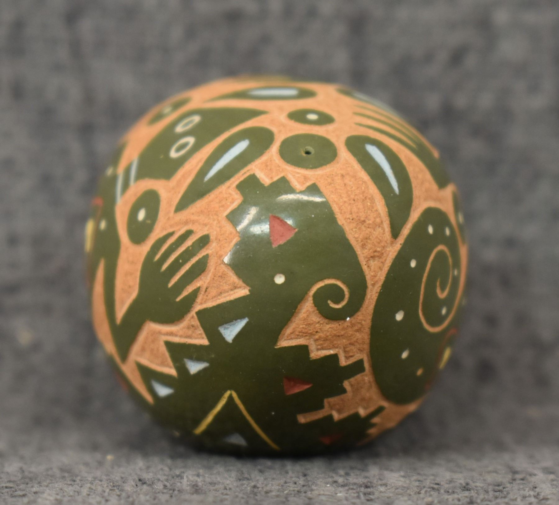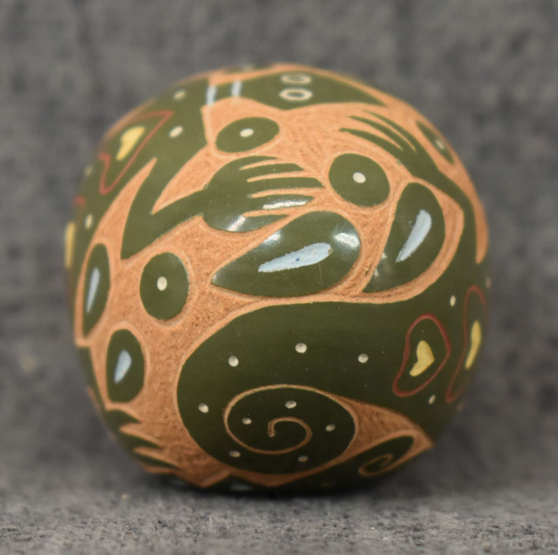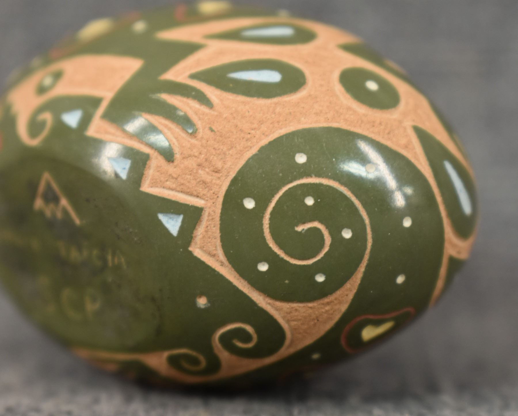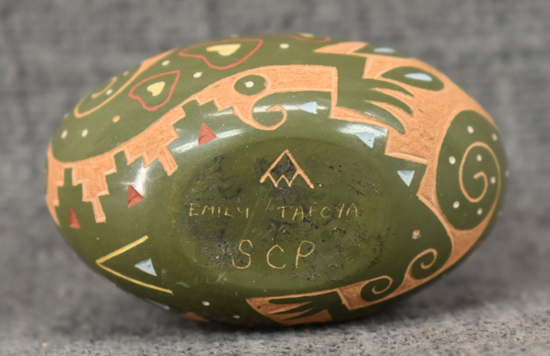1980's Santa Clara Indian. Hand coiled and sgraffito lizard design pottery seed jar. Signed Emily Tafoya. 1.25'' x 2.5'' x 1.5"