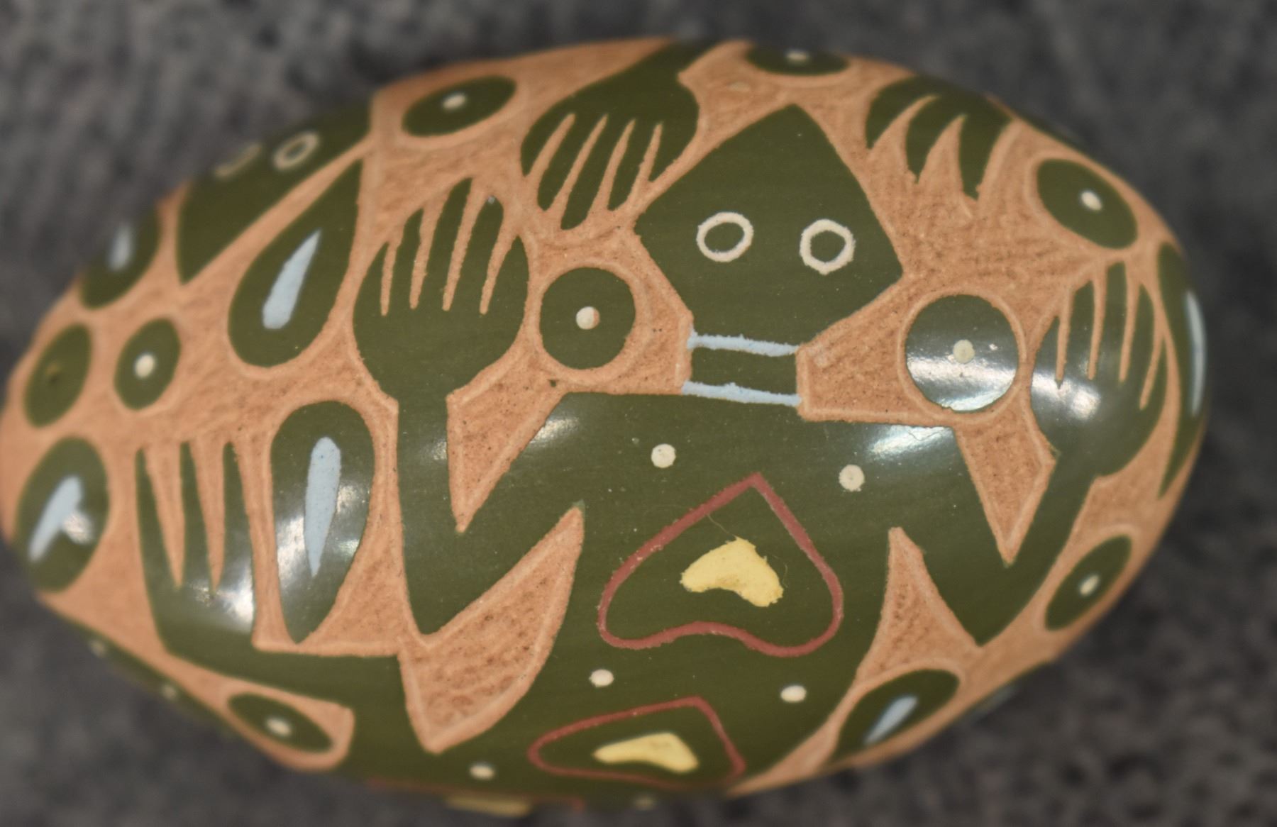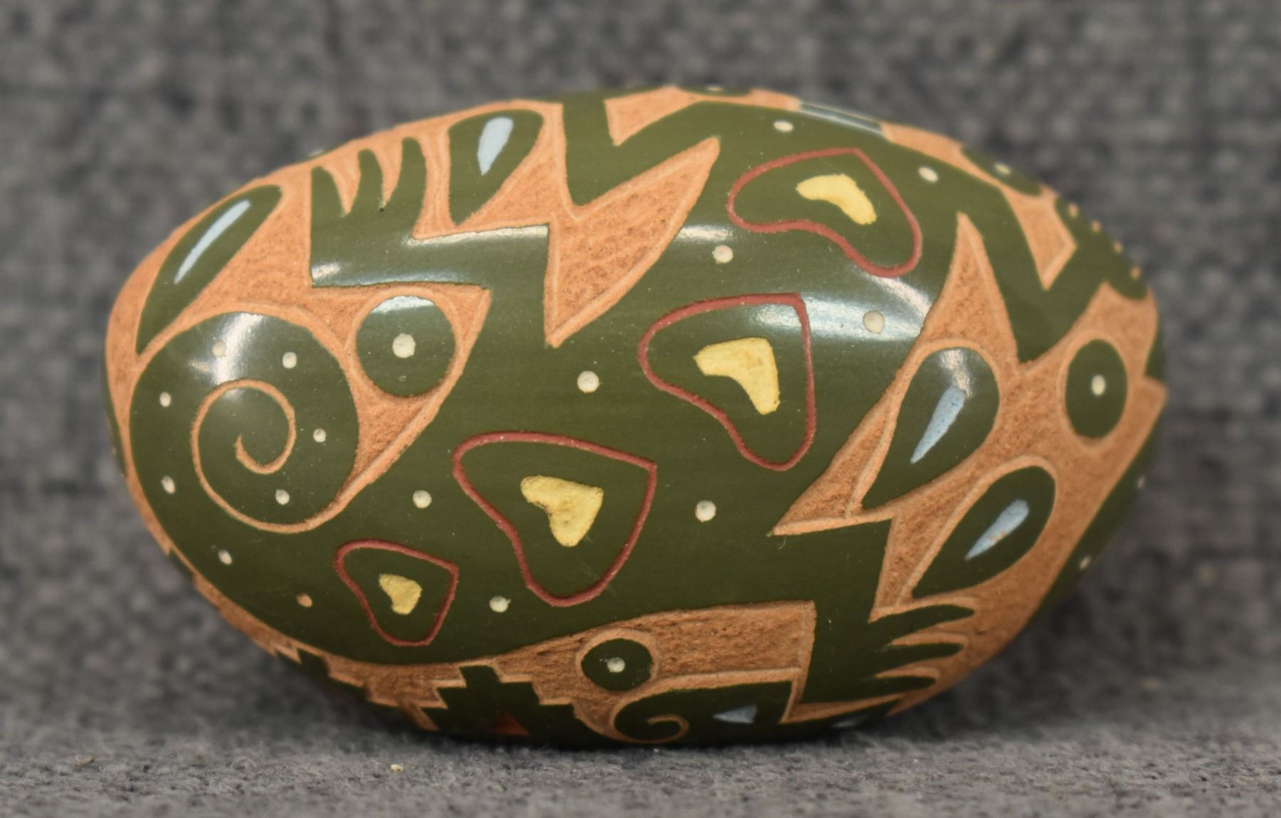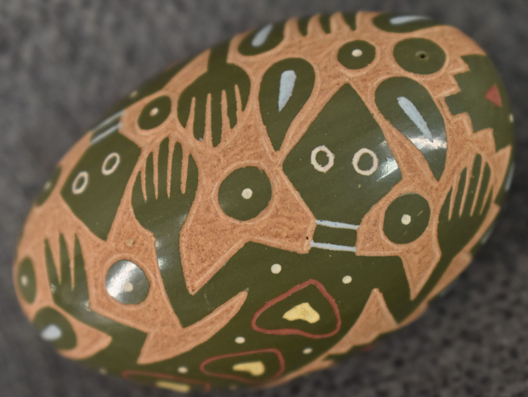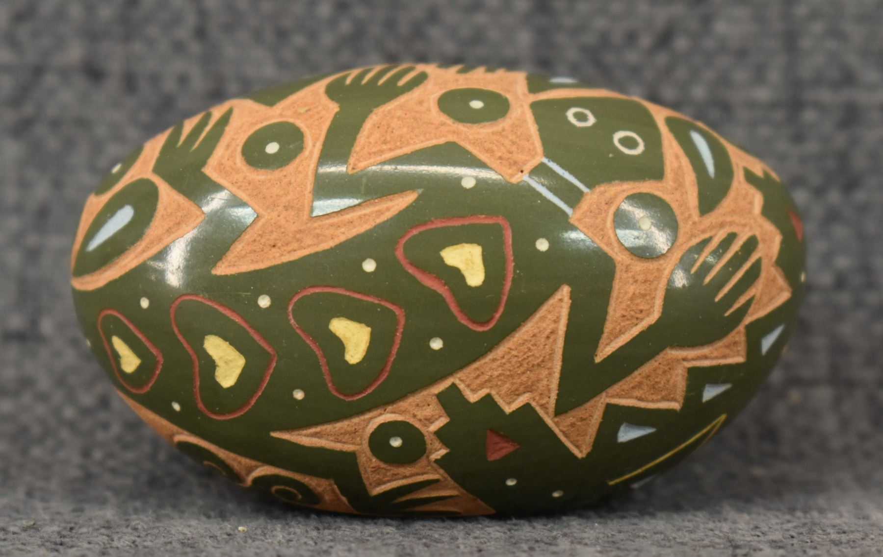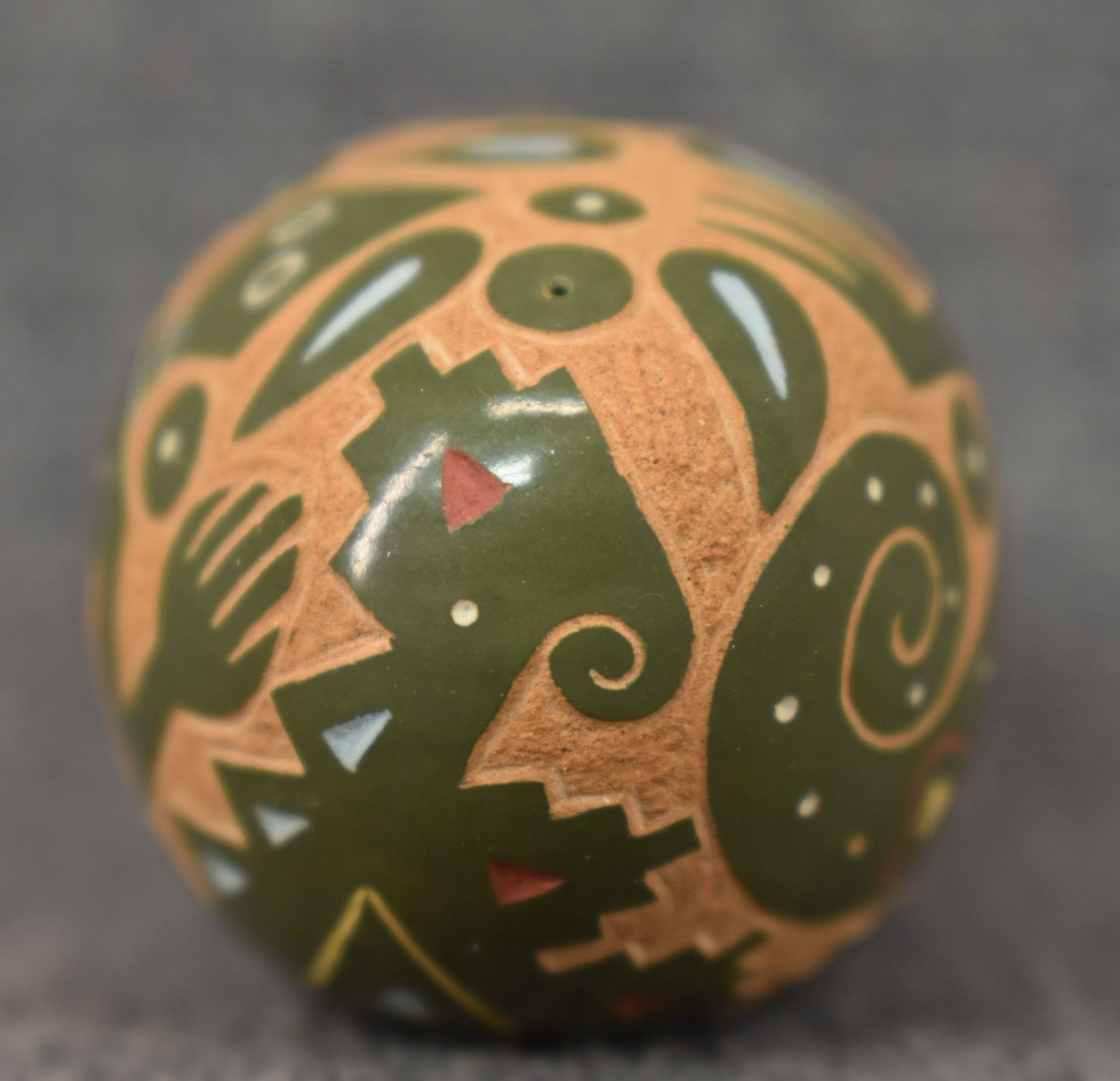 1980's Santa Clara Indian. Hand coiled and sgraffito lizard design pottery seed jar. Signed Emily Tafoya. 1.25'' x 2.5'' x 1.5"