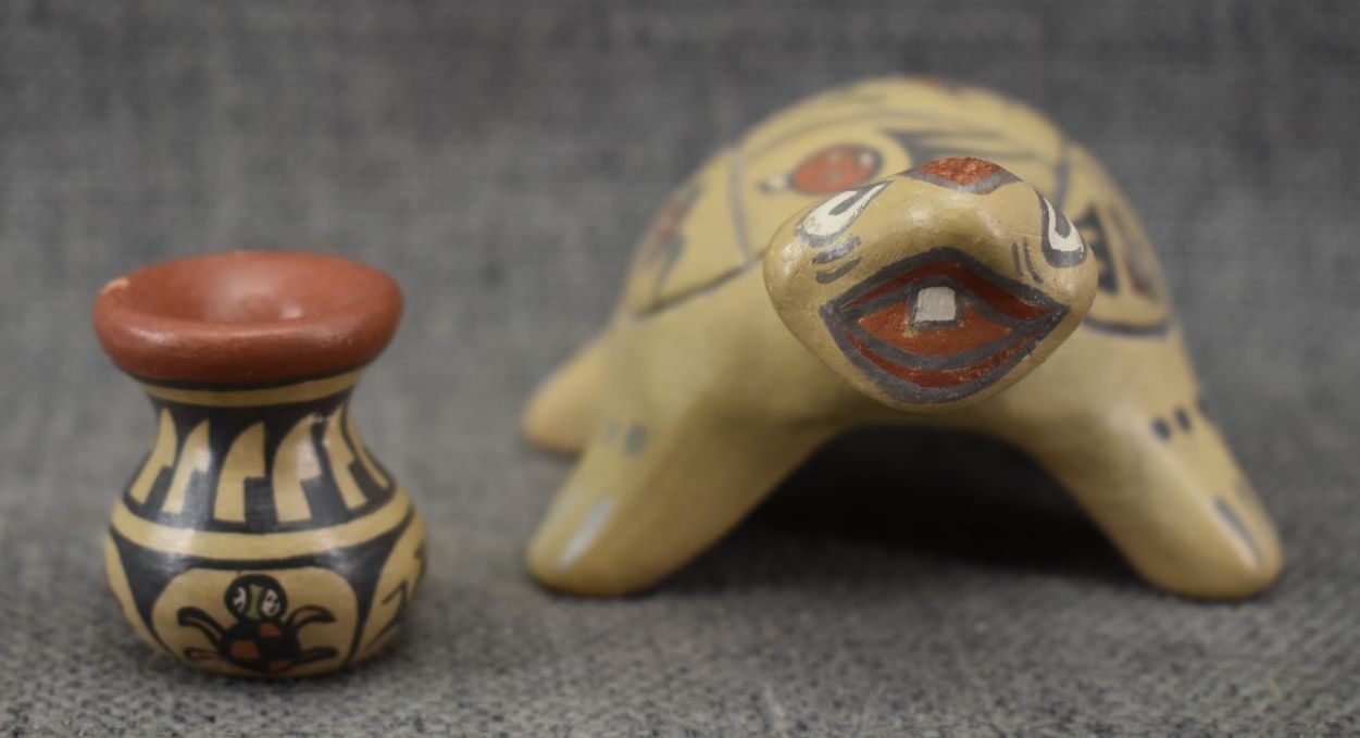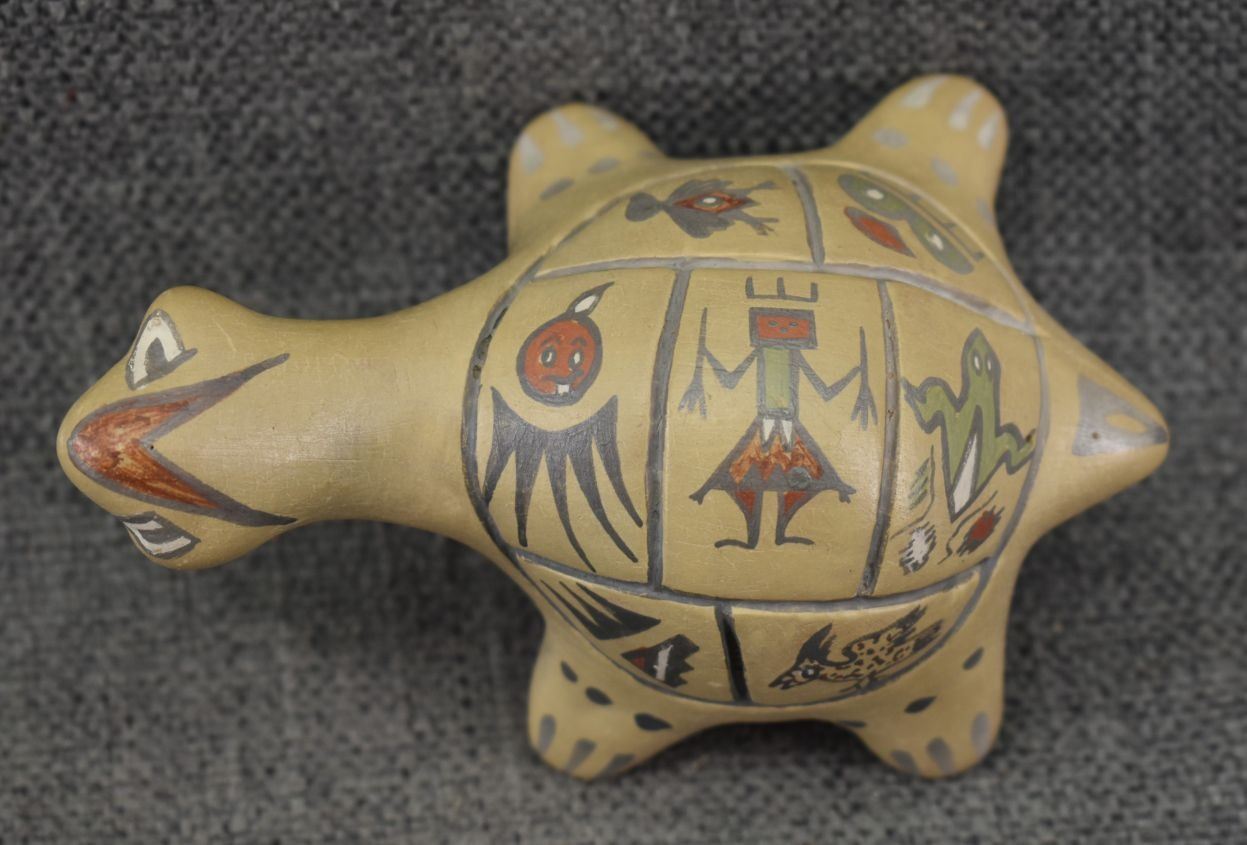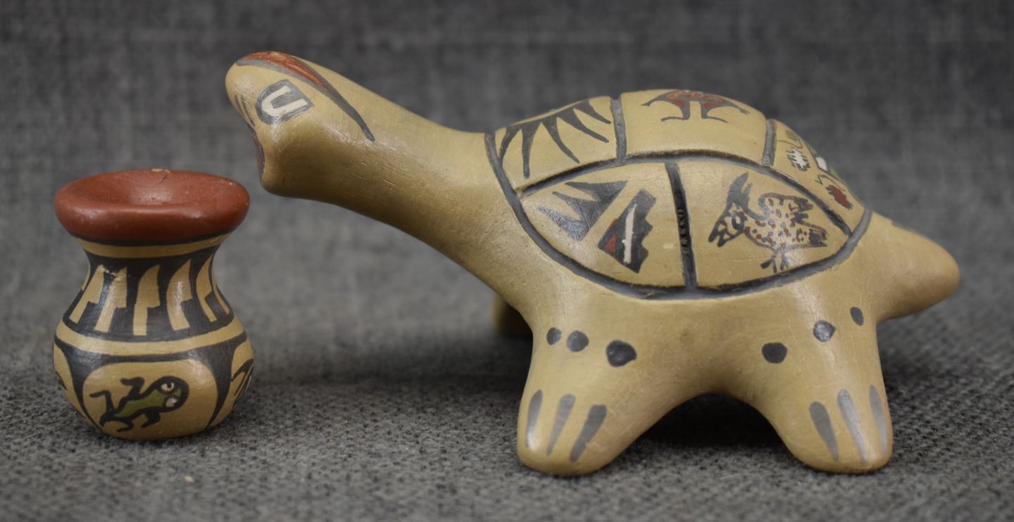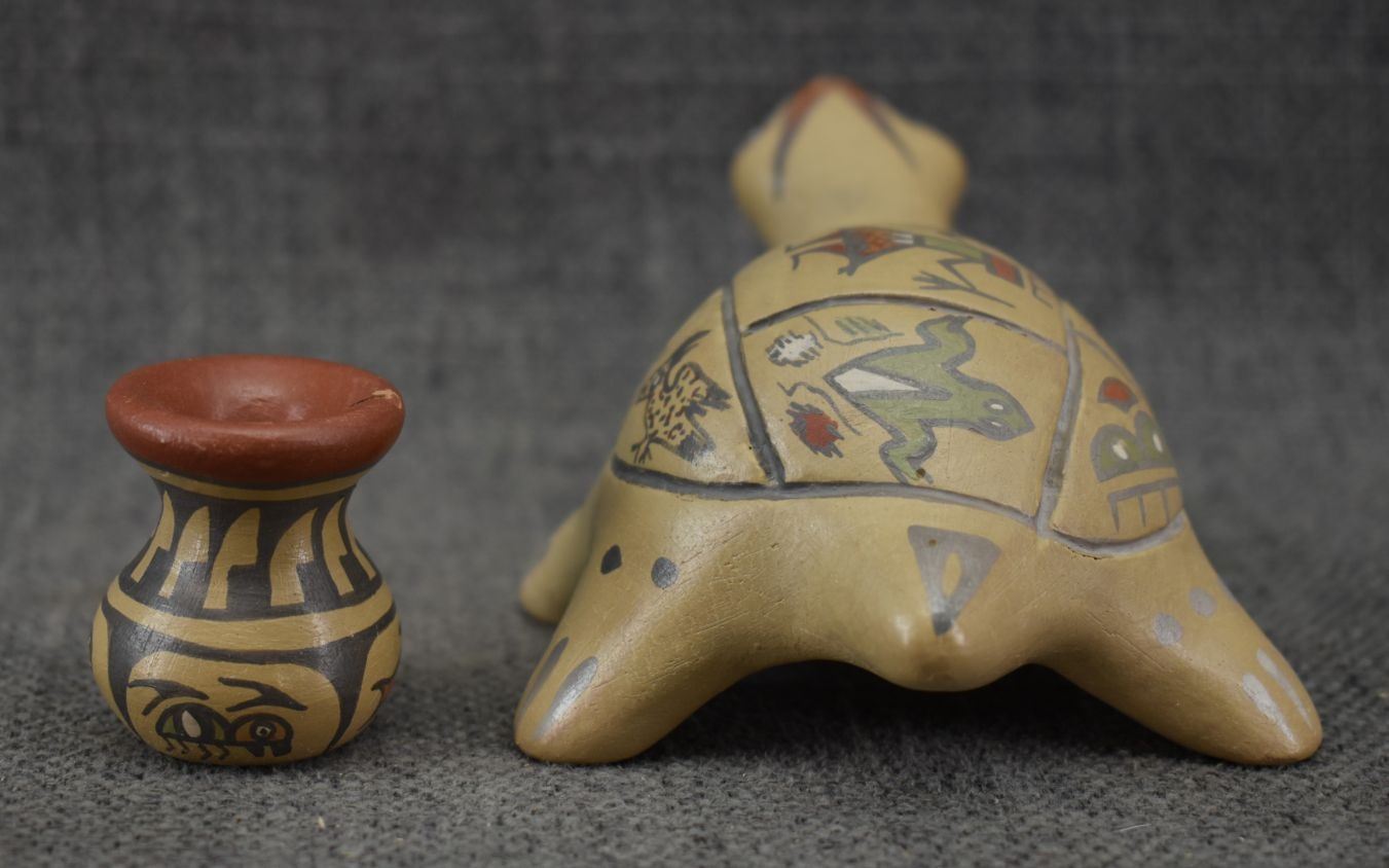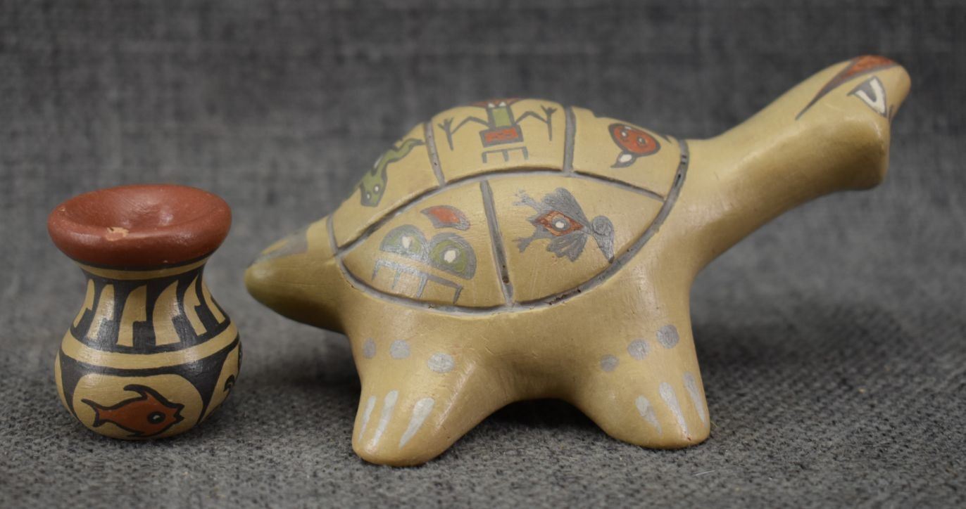 1970's Santa Clara, hand made turtle with painted design signed Margaret and Luther 2.25" x 5" x 3" and vase 1.5" x 1"