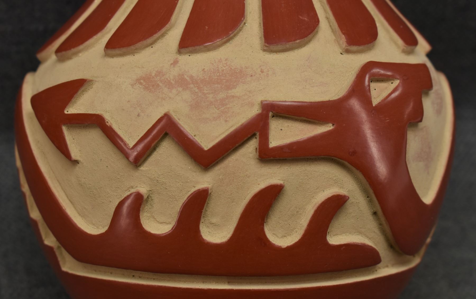1990's Santa Clara. Hand coiled carved and painted Avanyu design pottery vase. Signed Anna Archuleta. 7'' x 5.5''