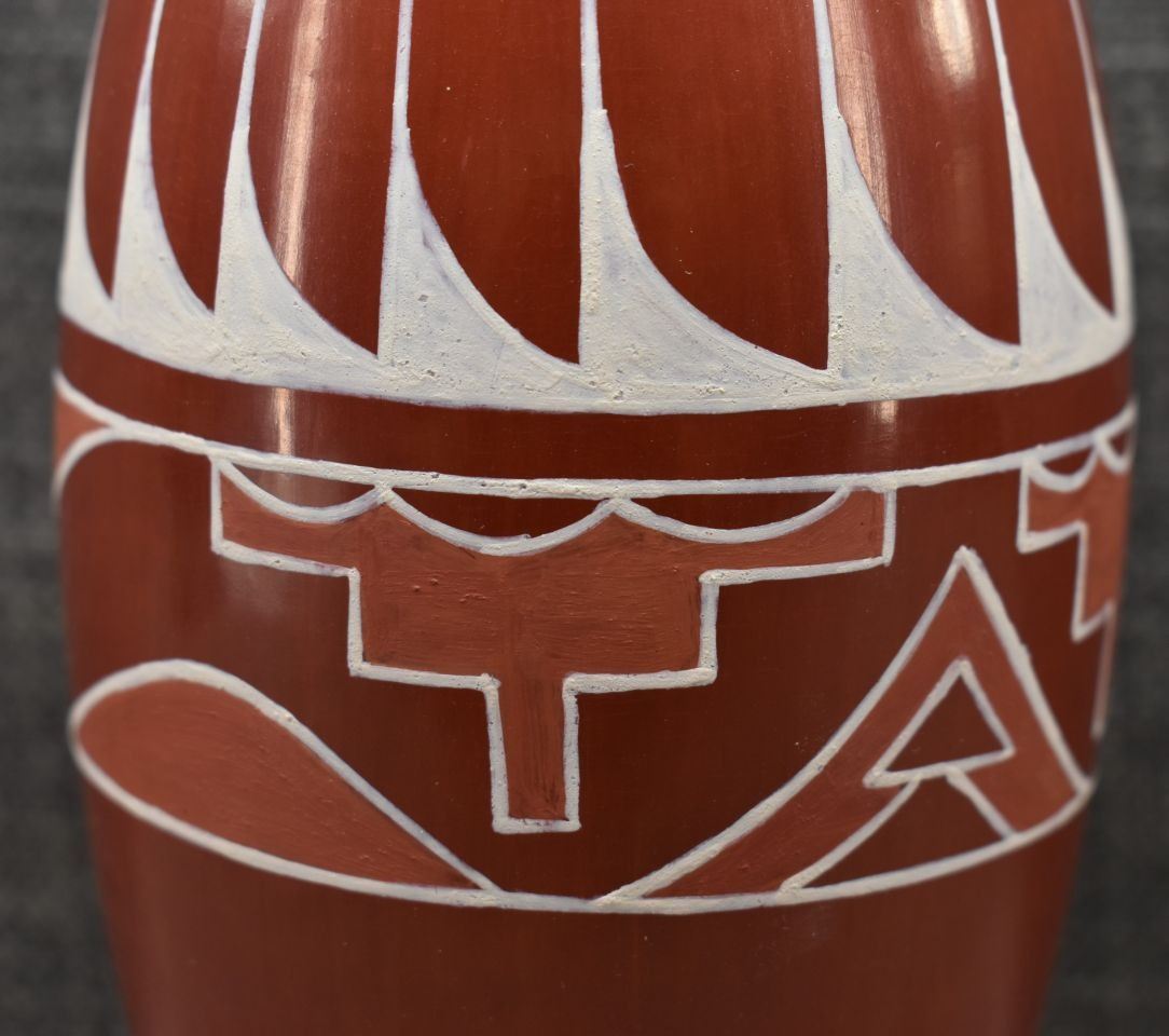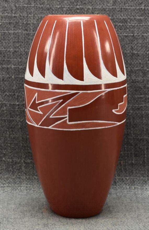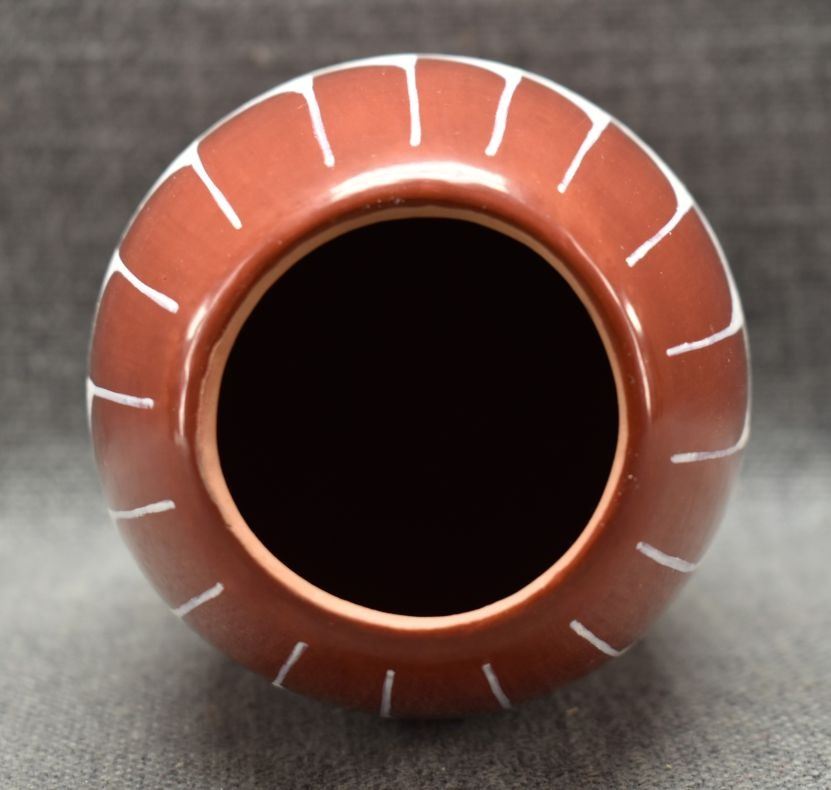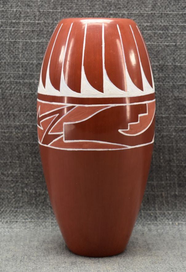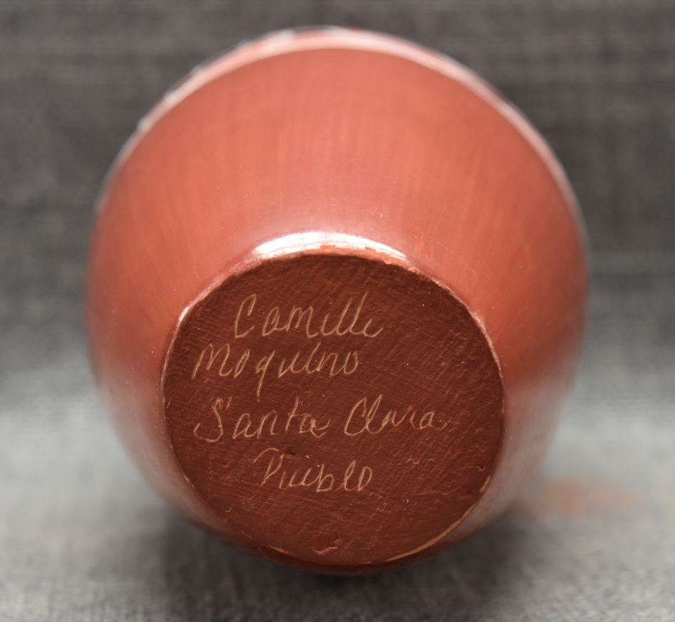 1990's Santa Clara, hand coiled with polychrome painted feather and avanyu design by Camille Moquino 7.25" x 3.5"