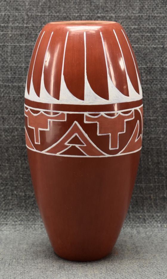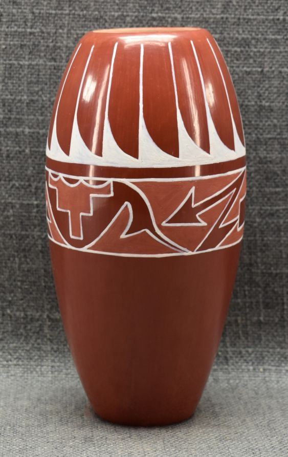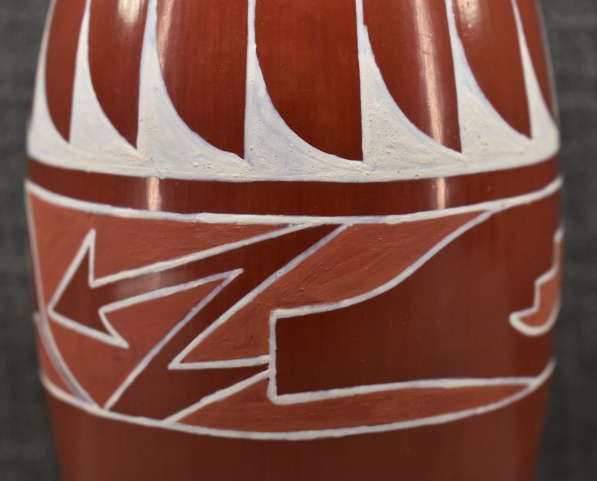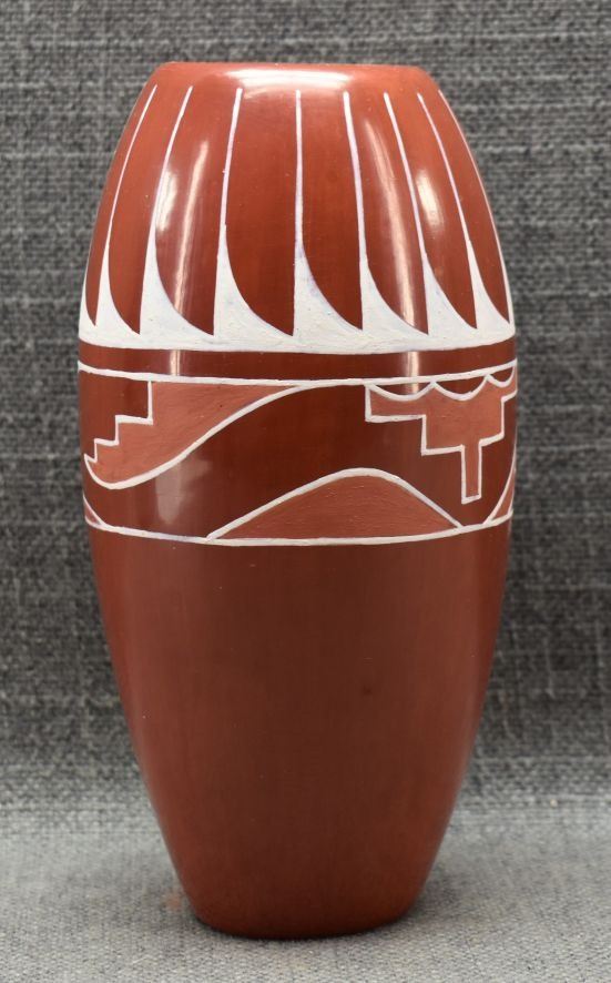 1990's Santa Clara, hand coiled with polychrome painted feather and avanyu design by Camille Moquino 7.25" x 3.5"