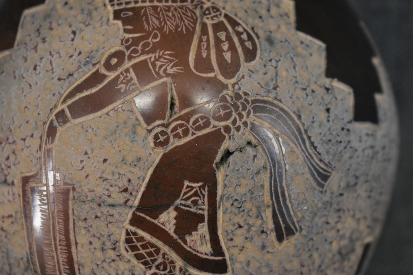 2000's Santa Clara. hand coiled and sgraffito design pottery Vase. Depicting Buffalo, Ram and Elk dancers signed Dan Tafoya. 5'' x 5''